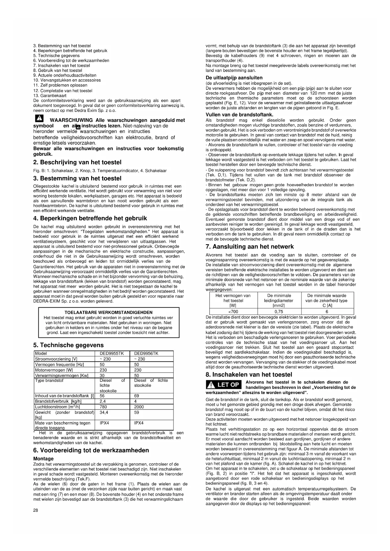 De kachel mag uitsluitend worden gebruikt in overeenstemming met het hieronder omschreven: "Toegelaten werkomstandigheden." Het apparaat is bedoeld voor gebruik in de ruimtes uitgerust met een efficiënt werkend ventilatiesysteem, geschikt voor het verwijderen van uitlaatgassen. Het apparaat is uitsluitend bestemd voor niet-professioneel gebruik. Onbevoegde aanpassingen in de mechanische en elektrische constructie, aanpassingen, onderhoud die niet in de Gebruiksaanwijzing wordt omschreven, worden beschouwd als onbevoegd en leiden tot onmiddellijk verlies van de Garantierechten. Het gebruik van de apparaten niet in overeenstemming met de Gebruiksaanwijzing veroorzaakt onmiddellijk verlies van de Garantierechten. Wanneer mechanische schade en in het bijzonder vervorming van de behuizing, lekkage van brandstoftank (lekken van brandstof) worden geconstateerd, mag het apparaat niet meer worden gebruikt. Het is niet toegestaan de kachel te gebruiken wanneer onregelmatigheden in het bedrijf worden geconstateerd. Het apparaat moet in dat geval worden buiten gebruik gesteld en voor reparatie naar DEDRA-EXIM Sp. z o.o. worden geleverd. TOELAATBARE WERKOMSTANDIGEHDEN Het toestel mag enkel gebruikt worden in goed verluchte ruimtes ver van licht ontvlambare materialen. Niet gebruiken in woningen. Niet gebruiken in kelders en in ruimtes onder het niveau van de begane grond. Laat een ingeschakeld toestel zonder toezicht niet achter.