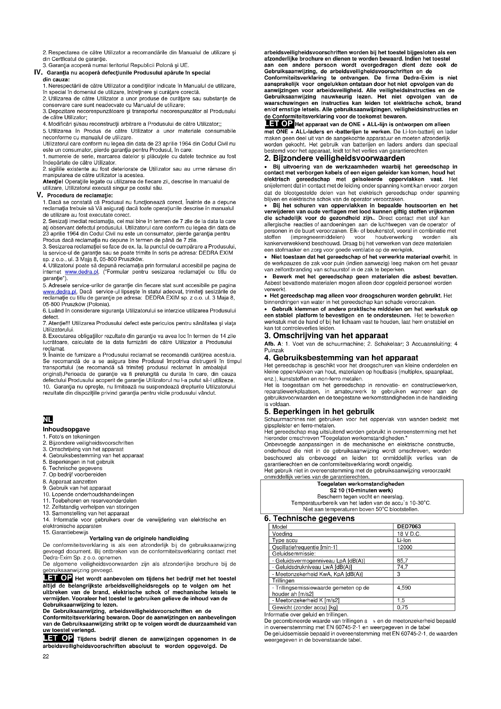 Vertaling van de originele handleiding De conformiteitsverklaring is als een afzonderlijk bij de gebruiksaanwijzing gevoegd document. Bij ontbreken van de conformiteitsverklaring contact met Dedra-Exim Sp. z o.o. opnemen. De algemene veiligheidsvoorwaarden zijn als afzonderlijke brochure bij de gebruiksaanwijzing gevoegd. LET OP Het wordt aanbevolen om tijdens het bedrijf met het toestel altijd de belangrijkste arbeidsveiligheidsregels op te volgen om het uitbreken van de brand, elektrische schok of mechanische letsels te vermijden. Vooraleer het toestel te gebruiken gelieve de inhoud van de Gebruiksaanwijzing te lezen. De Gebruiksaanwijzing, arbeidsveiligheidsvoorschriften en de Conformiteitsverklaring bewaren. Door de aanwijzingen en aanbevelingen van de Gebruiksaanwijzing strikt op te volgen wordt de duurzaamheid van uw toestel verlengd. LET OP Tijdens bedrijf dienen de aanwijzingen opgenomen in de arbeidsveiligheidsvoorschriften absoluut te worden opgevolgd. De arbeidsveiligheidsvoorschriften worden bij het toestel bijgesloten als een afzonderlijke brochure en dienen te worden bewaard. Indien het toestel aan een andere persoon wordt overgedragen dient deze ook de Gebruiksaanwijzing, de arbeidsveiligheidsvoorschriften en de Conformiteitsverklaring te ontvangen. De firma Dedra-Exim is niet aansprakelijk voor ongelukken ontstaan door het niet opvolgen van de aanwijzingen voor arbeidsveiligheid. Alle veiligheidsinstructies en de Gebruiksaanwijzing nauwkeurig lezen. Het niet opvolgen van de waarschuwingen en instructies kan leiden tot elektrische schok, brand en/of ernstige letsels. Alle gebruiksaanwijzingen, veiligheidsinstructies en de Conformiteitsverklaring voor de toekomst bewaren. LET OP Het apparaat van de ONE + ALL-lijn is ontworpen om alleen met ONE + ALL-laders en -batterijen te werken. De Li-Ion-batterij en lader maken geen deel uit van de aangekochte apparatuur en moeten afzonderlijk worden gekocht. Het gebruik van batterijen en laders anders dan speciaal bestemd voor het apparaat, leidt tot het verlies van garantierechten