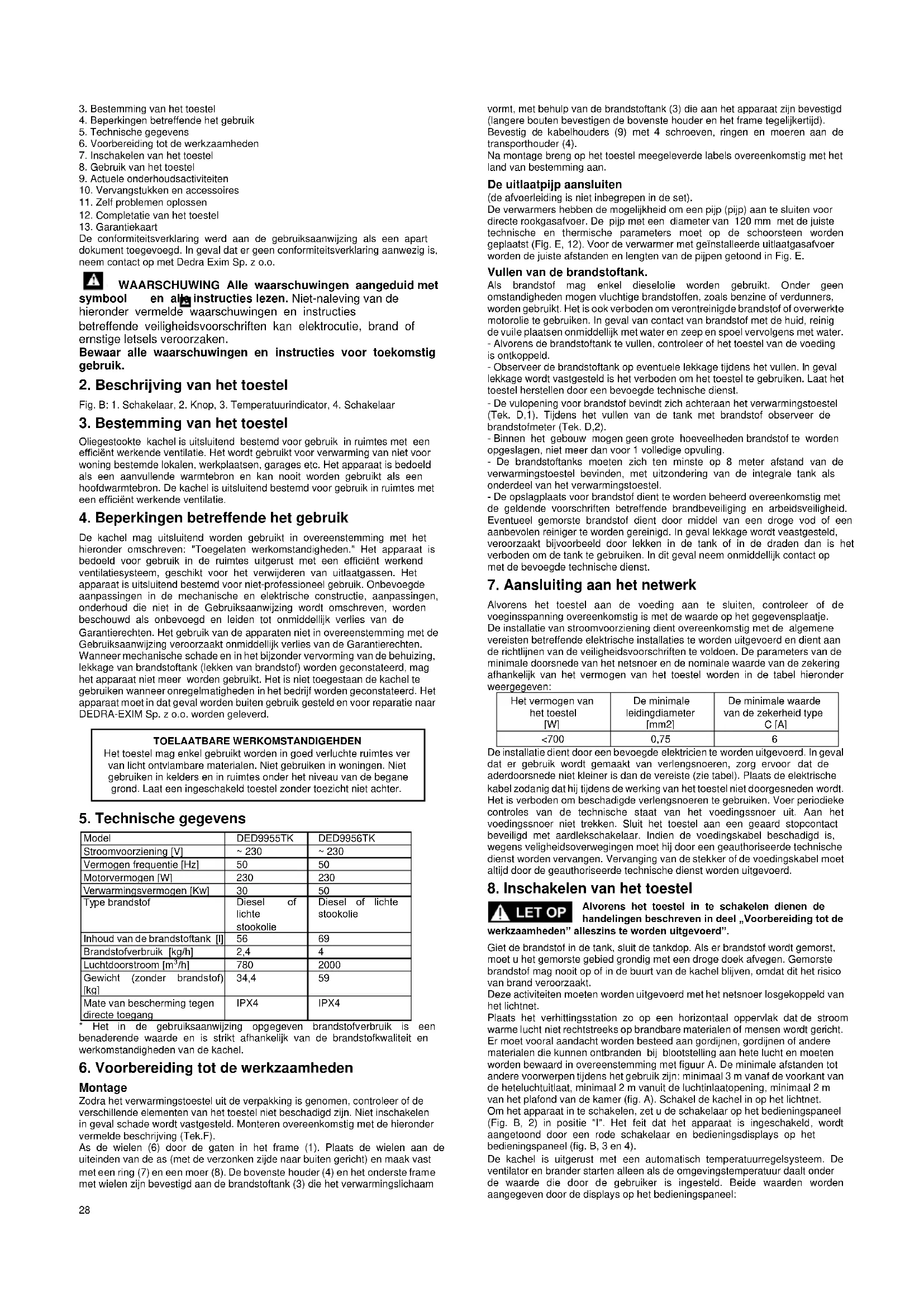 Olieverwarming met rookgasafvoer Catalogusnr: DED9955TK, DED9956TK Partijnummer.......................... (verder het Product te noemen) Aankoopdatum van het Product: .............30 Stempel van de verkoper Datum en handtekening van de verkoper:: ................................. Verklaring van de Gebruiker: Ik bevestig hiermee over de garantievoorwaarden en over de gevolgen van het niet naleven van de in de Gebruiksaanwijzing en de Garantiekaart bepaalde regels ingelicht te zijn. Ik ken de garantievoorwaarden wat ik met mijn eigenhandige handtekening bevestig: