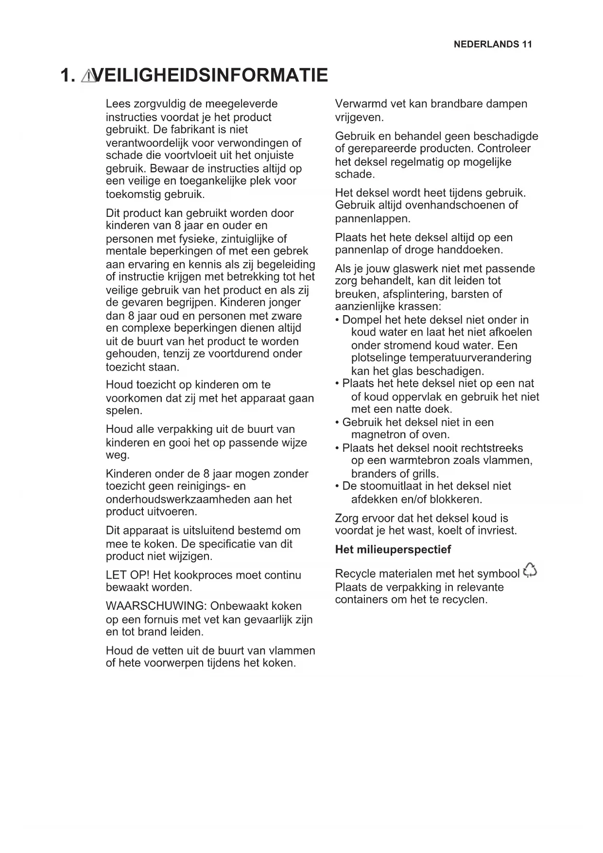 Lees zorgvuldig de meegeleverde instructies voordat je het product gebruikt. De fabrikant is niet verantwoordelijk voor verwondingen of schade die voortvloeit uit het onjuiste gebruik. Bewaar de instructies altijd op een veilige en toegankelijke plek voor toekomstig gebruik. Dit product kan gebruikt worden door kinderen van 8 jaar en ouder en personen met fysieke, zintuiglijke of mentale beperkingen of met een gebrek aan ervaring en kennis als zij begeleiding of instructie krijgen met betrekking tot het veilige gebruik van het product en als zij de gevaren begrijpen. Kinderen jonger dan 8 jaar oud en personen met zware en complexe beperkingen dienen altijd uit de buurt van het product te worden gehouden, tenzij ze voortdurend onder toezicht staan. Houd toezicht op kinderen om te voorkomen dat zij met het apparaat gaan spelen. Houd alle verpakking uit de buurt van kinderen en gooi het op passende wijze weg. Kinderen onder de 8 jaar mogen zonder toezicht geen reinigings- en onderhoudswerkzaamheden aan het product uitvoeren. Dit apparaat is uitsluitend bestemd om mee te koken. De specificatie van dit product niet wijzigen. LET OP! Het kookproces moet continu bewaakt worden. WAARSCHUWING: Onbewaakt koken op een fornuis met vet kan gevaarlijk zijn en tot brand leiden. Houd de vetten uit de buurt van vlammen of hete voorwerpen tijdens het koken. Verwarmd vet kan brandbare dampen vrijgeven. Gebruik en behandel geen beschadigde of gerepareerde producten. Controleer het deksel regelmatig op mogelijke schade. Het deksel wordt heet tijdens gebruik. Gebruik altijd ovenhandschoenen of pannenlappen. Plaats het hete deksel altijd op een pannenlap of droge handdoeken. Als je jouw glaswerk niet met passende zorg behandelt, kan dit leiden tot breuken, afsplintering, barsten of aanzienlijke krassen: