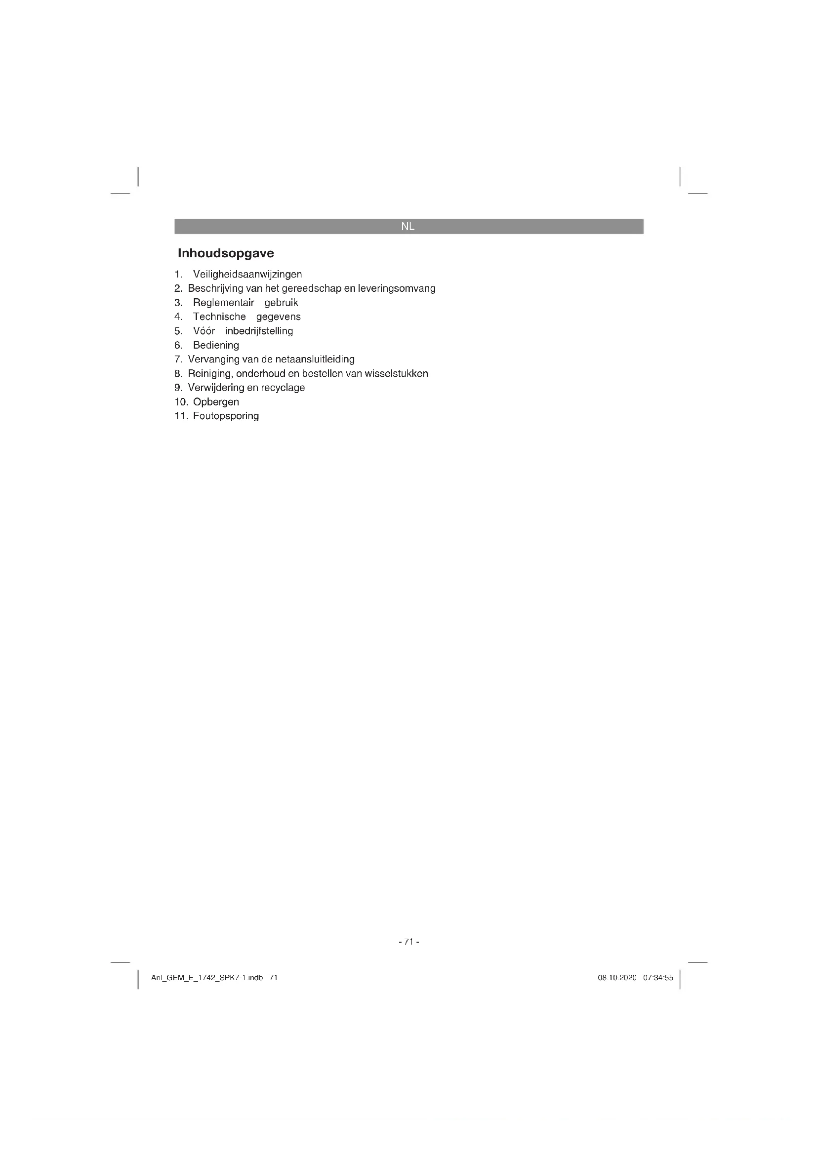 Bewaar het toestel en de accessoires op een donkere, droge en vorstvrije plaats die voor kinderen ontoegankelijk is. De optimale opberg- temperatuur ligt tussen 5° C en 30° C. Bewaar het elektrische gereedschap in de originele ver- pakking. Anl_GEM_E_1742_SPK7-1.indb 79Anl_GEM_E_1742_SPK7-1.indb 79 08.10.2020 07:34:5608.10.2020 07:34:56NL