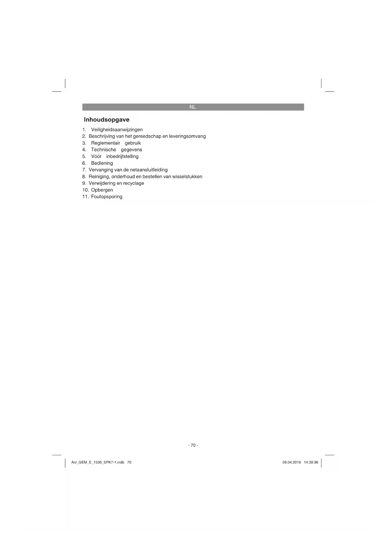 Enkel voor EU-landen Elektrisch gereedschap hoort niet bij het huisvuil thuis! Volgens de Europese richtlijn 2012/19/EG op afgedankte elektrische en elektronische toestellen en omzetting in nationaal recht dienen afgedankte elektrische gereedschappen afzonderlijk te worden ver- zameld en milieuvriendelijk te worden gerecycleerd. Recyclagealternatief i.p.v. het toestel terug te sturen: De eigenaar van het elektrische toestel is alternatief verplicht, i.p.v. het toestel terug te sturen, mede te werken bij de behoorlijke recyclage in geval hij zich van het eigendom ontdoet. Het afgedankte toestel kan hiervoor ook bij een verzamelplaats worden afgegeven die voor een verwijdering als bedoeld in de wetgeving in zake recyclage en afvalverwerking zorgt. Hieronder vallen niet bij de afgedankte toestellen gevoegde accessoires en hulpmiddelen zonder elektrische componenten. Nadruk of andere reproductie van documentatie en geleidepapieren van de producten, geheel of ge- deeltelijk, enkel toegestaan mits uitdrukkelijke toestemming van iSC GmbH. Technische wijzigingen voorbehouden Anl_GEM_E_1536_SPK7-1.indb 80Anl_GEM_E_1536_SPK7-1.indb 80 08.04.2019 14:39:3708.04.2019 14:39:37NL