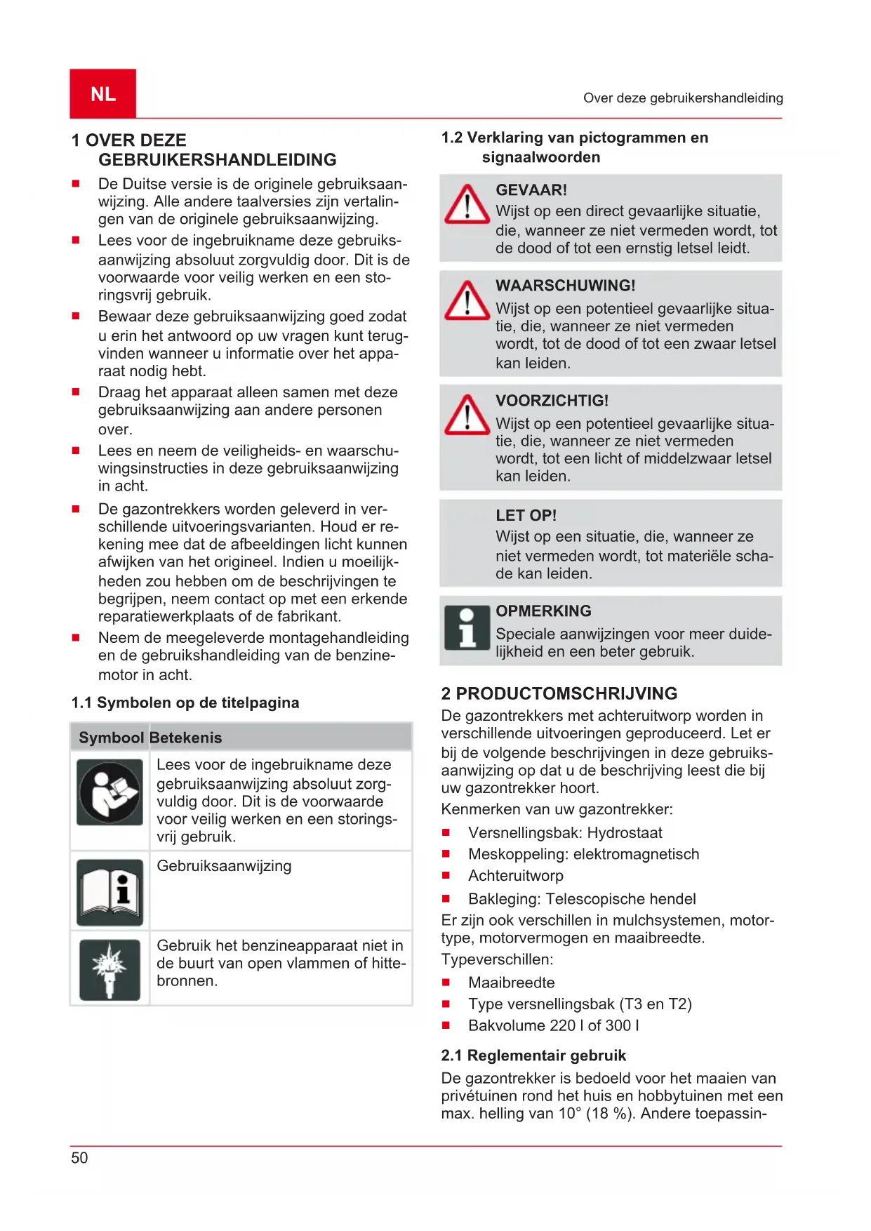 signaalwoorden GEVAAR! Wijst op een direct gevaarlijke situatie, die, wanneer ze niet vermeden wordt, tot de dood of tot een ernstig letsel leidt. WAARSCHUWING! Wijst op een potentieel gevaarlijke situa- tie, die, wanneer ze niet vermeden wordt, tot de dood of tot een zwaar letsel kan leiden. VOORZICHTIG! Wijst op een potentieel gevaarlijke situa- tie, die, wanneer ze niet vermeden wordt, tot een licht of middelzwaar letsel kan leiden. LET OP! Wijst op een situatie, die, wanneer ze niet vermeden wordt, tot materiële scha- de kan leiden. OPMERKING Speciale aanwijzingen voor meer duide- lijkheid en een beter gebruik. 2 PRODUCTOMSCHRIJVING De gazontrekkers met achteruitworp worden in verschillende uitvoeringen geproduceerd. Let er bij de volgende beschrijvingen in deze gebruiks- aanwijzing op dat u de beschrijving leest die bij uw gazontrekker hoort. Kenmerken van uw gazontrekker: