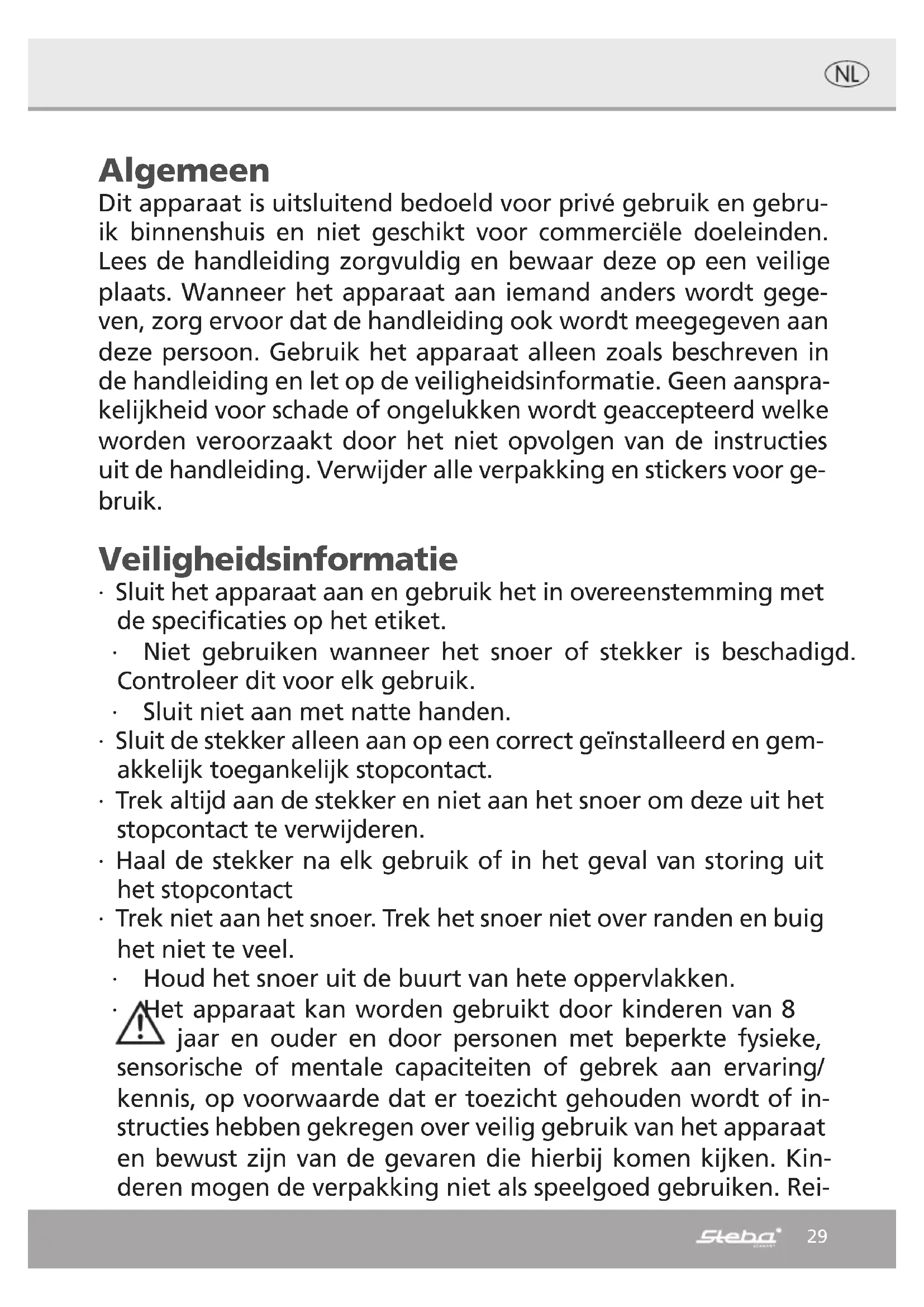 58,55 dB(A) Vitesse maximale de l‘air c 3,25 mètres/sec Norme de mesure de la valeur de service IEC 60879:1986(CORR.1992) Coordonnées de contact pour tout com- plément d‘information Steba Elektrogeräte GmbH & Co.KG Pointstr. 2 96129 Strullendorf28 Evacuation correcte de ce produit: Mettre les appareils usagés immédiatement au rebut. Au sein de l‘UE, ce symbole indique que le produit ne doit pas être jeté avec les déchets ménagers. Les anciens appareils contiennent des matériaux de valeur recyclables qui doivent être valorisés afin d‘éviter toute atteinte à l‘environnement ou à la santé humaine due à une élimination incorrecte des déchets. Les anciens appareils doivent par conséquent être mis au rebut via des systèmes de collecte appropriés ou ramenés à cet effet au point de vente où ils ont été achetés. Les appareils seront alors confiés à un centre de recyclage des matériaux. Élimination de l‘emballage Ne pas jeter l‘emballage avec les déchets ménagers, mais avec les déchets recyclables. Jeter les emballages en papier, carton et carton ondulé aux points de collecte de vi- eux papiers. Les composants d‘emballage en plastique et les films doivent également être jetés dans les conteneurs prévus à cet effet. Exemples d‘identification des plastiques : PE pour le polyéthylène, code 02 pour le PEHD, 04 pour le PEBD, PP pour le polypropylène, PS pour le polystyrène. Service après-vente Si, contre toute attente, l‘appareil doit être confié au service après-vente, nous con- tacter aux coordonnées suivantes. En cas de garantie applicable, nous nous charge- ons de l‘enlèvement de l‘appareil. L‘appareil doit être correctement emballé pour le transport. Les paquets non affranchis ne pourront pas être pris en charge ! STEBA Elektrogeräte GmbH & Co KG Pointstr. 2, 96129 Strullendorf / Allemagne tél. service commercial : 09543 / 449-17 / -18, tél. S.A.V. : 09543 / 449-44, fax : 09543 / 449-19 e-mail : elektro@steba.com Internet : http://www.steba.com Attention ! Les appareils électriques doivent être réparés exclusivement par des élec- triciens qualifiés, les réparations non conformes pouvant entraîner des conséquences graves.29 Algemeen Dit apparaat is uitsluitend bedoeld voor privé gebruik en gebru- ik binnenshuis en niet geschikt voor commerciële doeleinden. Lees de handleiding zorgvuldig en bewaar deze op een veilige plaats. Wanneer het apparaat aan iemand anders wordt gege- ven, zorg ervoor dat de handleiding ook wordt meegegeven aan deze persoon. Gebruik het apparaat alleen zoals beschreven in de handleiding en let op de veiligheidsinformatie. Geen aanspra- kelijkheid voor schade of ongelukken wordt geaccepteerd welke worden veroorzaakt door het niet opvolgen van de instructies uit de handleiding. Verwijder alle verpakking en stickers voor ge- bruik. Veiligheidsinformatie ∙ Sluit het apparaat aan en gebruik het in overeenstemming met de specificaties op het etiket. ∙ Niet gebruiken wanneer het snoer of stekker is beschadigd. Controleer dit voor elk gebruik. ∙ Sluit niet aan met natte handen. ∙ Sluit de stekker alleen aan op een correct geïnstalleerd en gem- akkelijk toegankelijk stopcontact. ∙ Trek altijd aan de stekker en niet aan het snoer om deze uit het stopcontact te verwijderen. ∙ Haal de stekker na elk gebruik of in het geval van storing uit het stopcontact ∙ Trek niet aan het snoer. Trek het snoer niet over randen en buig het niet te veel. ∙ Houd het snoer uit de buurt van hete oppervlakken. ∙ Het apparaat kan worden gebruikt door kinderen van 8 jaar en ouder en door personen met beperkte fysieke, sensorische of mentale capaciteiten of gebrek aan ervaring/ kennis, op voorwaarde dat er toezicht gehouden wordt of in- structies hebben gekregen over veilig gebruik van het apparaat en bewust zijn van de gevaren die hierbij komen kijken. Kin- deren mogen de verpakking niet als speelgoed gebruiken. Rei-30 niging en gebruikersonderhoud mogen niet door kinderen worden uitgevoerd, tenzij ze 8 jaar of ouder zijn en onder toe- zicht staan. ∙ Kinderen onder de 8 jaar moeten uit de buurt van het apparaat en de stroomkabel worden gehouden. ∙ Kinderen moeten onder toezicht staan om ervoor te zorgen dat ze niet met het apparaat of verpakkingsmateriaal spelen (bij- voorbeeld plastic zakken) ∙ Het apparaat mag niet worden bediend met behulp van een externe timer of een afzonderlijk system op afstand. ∙ Verlaat u uw woning nooit terwijl de warmeluchtventi- lator in werking is. Controleer in dat geval altijd of de schakelaar op OFF staat. ∙ Laat het apparaat niet buiten of in een vochtige ruimte achter. ∙ Dompel het apparaat nooit in water. ∙ Gebruik het apparaat nooit na een storing, bijvoorbeeld als het gevallen is of op een andere manier beschadigd is geraakt. ∙ De fabrikant is niet aansprakelijk voor de schade die ontstaat door gebruik van het apparaat op een andere manier dan be- schreven, of een fout in het gebruikt. ∙ Om letsel te voorkomen mogen reparaties zoals het vervangen van een beschadigd snoer alleen worden uitgevoerd door een reparatiedienst. Alleen originele onderdelen mogen worden gebruikt. ∙ Gebruik het apparaat alleen zoals beschreven is in deze hand- leiding. ∙ Blaas niet met het apparaat in vuur (bijvoorbeeld open haarden, kaarsen etc.), op babys en patiënten. Let erop dat de aanzuiging en uitblaasopening niet afgedekt worden. ∙ Tijdens het gebruik geen onderdelen vast te zitten in de veilig- heid van het net. ∙ Dit apparaat is bedoeld om te gebruiken voor huishoudelijk setting, zoals: o personeelskeukens in winkels, kantoren en andere wer- komgevingen31 o door gasten in hotels, motels en andere type woonom- gevingen o bed & breakfast- achtige omgevingen. ∙ Wanneer er een verlengkabel wordt gebruikt, moet deze een doorsnede van 1,5 mm² hebben. ∙ Als een GS-geteste 16 A multi-pin extensie wordt gebruikt, wordt deze met niet meer dan 3680 watt be