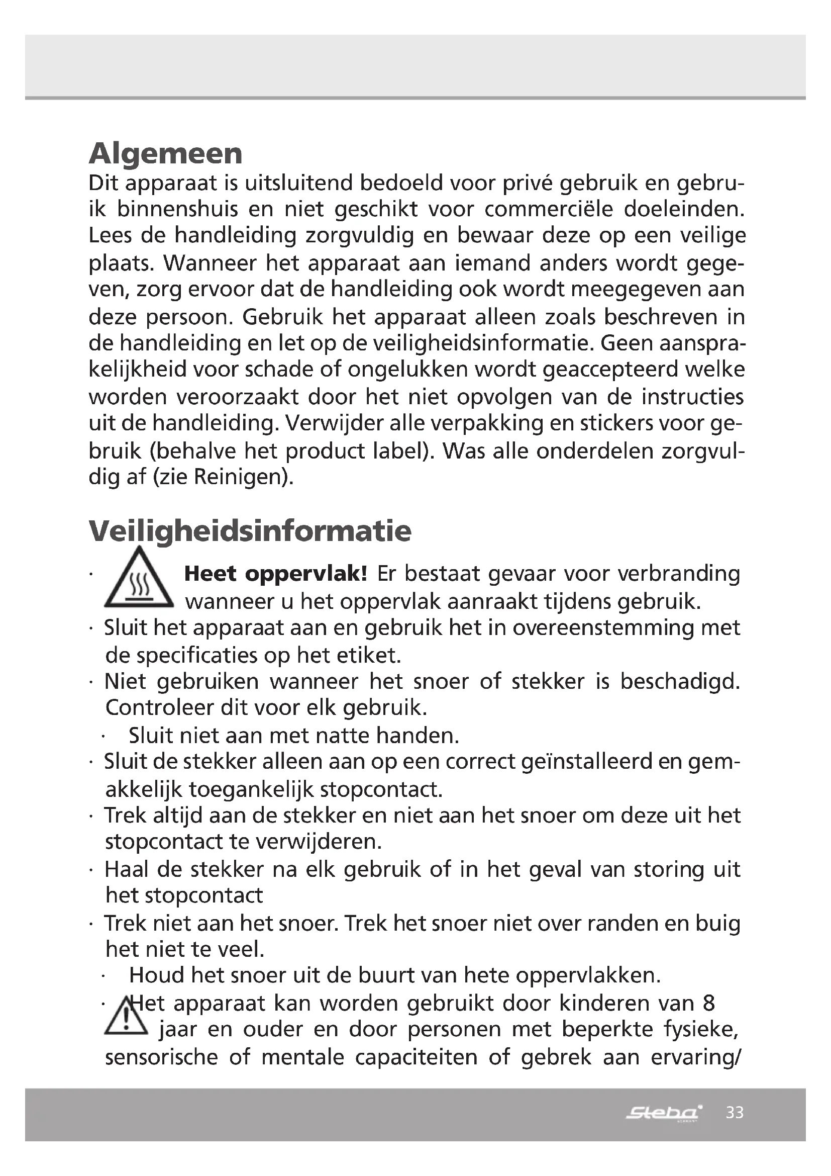 wordt weergegeven op het LCD-scherm. De voorgeselecteerde starttijd kan wor- den weergegeven door op de knop „Prog“ te drukken. Opmerking: Het automatische programma kan worden geannuleerd door één keer op de „ON/OFF“-knop te drukken. Als de „ON/OFF“-knop twee keer wordt ingedrukt, start het koffiezetapparaat direct met het koffiezetten. Als de startti- jd moet worden gewijzigd, moet de programmering worden afgebroken en moe- ten de stappen 1-5 die in dit hoofdstuk worden genoemd, worden herhaald. Tips voor het zetten van koffie ∙ Een schoon koffiezetapparaat is belangrijk om goede koffie te zetten. Reinig uw machine regelmatig. ∙ Gebruik alleen schoon, helder, koud water om koffie te zetten. ∙ Bewaar de gemalen koffie op een droge, koele plaats. Zorg ervoor dat koffiever- pakkingen na opening goed gesloten zijn. ∙ Gebruik gemalen koffie maar één keer. Koffie die weer is opgewarmd verliest veel van zijn smaak. ∙ Hoe sneller de koffie gedronken wordt, hoe lekkerder hij smaakt. ∙ Als je de koffiekan voor het zetproces omspoelt met heet water, blijft de koffie langer warm.40 Correcte afvalverwijdering van dit product Versleten apparaten onmiddellijk onbruikbaar maken. Binnen de Europese Unie duidt dit symbool erop dat dit product niet samen met huishoudelijk afval verwijderd mag worden. Oude apparaten bevatten waardevolle, recycleerbare materialen, die aan recycling onderworpen moe- ten worden om het milieu c.q. de menselijke gezondheid niet door een onge- controleerde afvalverwijdering te schaden. Gelieve oude apparaten daarom via ge- schikte inzamelsystemen te verwijderen of het apparaat met het oog op de afvalverwijdering terug naar de afzender (waar u het product gekocht hebt) te zen- den. De afzender zal dan het apparaat aan een stoffelijke recycling onderwerpen. Evacuatie van de verpakking Verpakkingsmateriaal niet gewoon wegwerpen, maar aan recycling onderwerpen. Verpakkingen van papier, karton en gegolfd karton in verzamelcentra voor oud pa- pier afgeven. Onderdelen van kunststofverpakkingen en folie dienen eveneens in de daarvoor bestemde verzamelbakken gedeponeerd te worden. In de voorbeelden voor de kunststofbenaming staat: PE voor poly- ethyleen, het kencijfer 02 voor PE-HD, 04 voor PE-LD, PP voor poly- propyleen, PS voor polystyreen. Klantenserviceafdeling: Indien uw apparaat tegen de verwachting in dan toch al eens de klantenserviceaf- deling nodig heeft, gelieve u dan tot onderstaand adres te richten. Wij zullen dan in geval van garantie voor de afhaling zorgen. Het apparaat moet transporteerbaar verpakt zijn. Ongefrankeerde pakjes kunnen niet aanvaard worden! STEBA Elektrogeräte GmbH & Co KG Pointstr. 2, 96129 Strullendorf / Germany Verkopen-Tel.: 09543 / 449-17 / -18, Service-Tel.: 09543 / 449-44, Fax: 09543 / 449-19 e-Mail: elektro@steba.com Internet: http://www.steba.com Opgelet! Elektrische apparaten mogen uitsluitend door vakkundig geschoolde elek- triciens gerepareerd worden, omdat er door ondeskundige reparaties aanzienlijke gevolgschade kan ontstaan.4142
