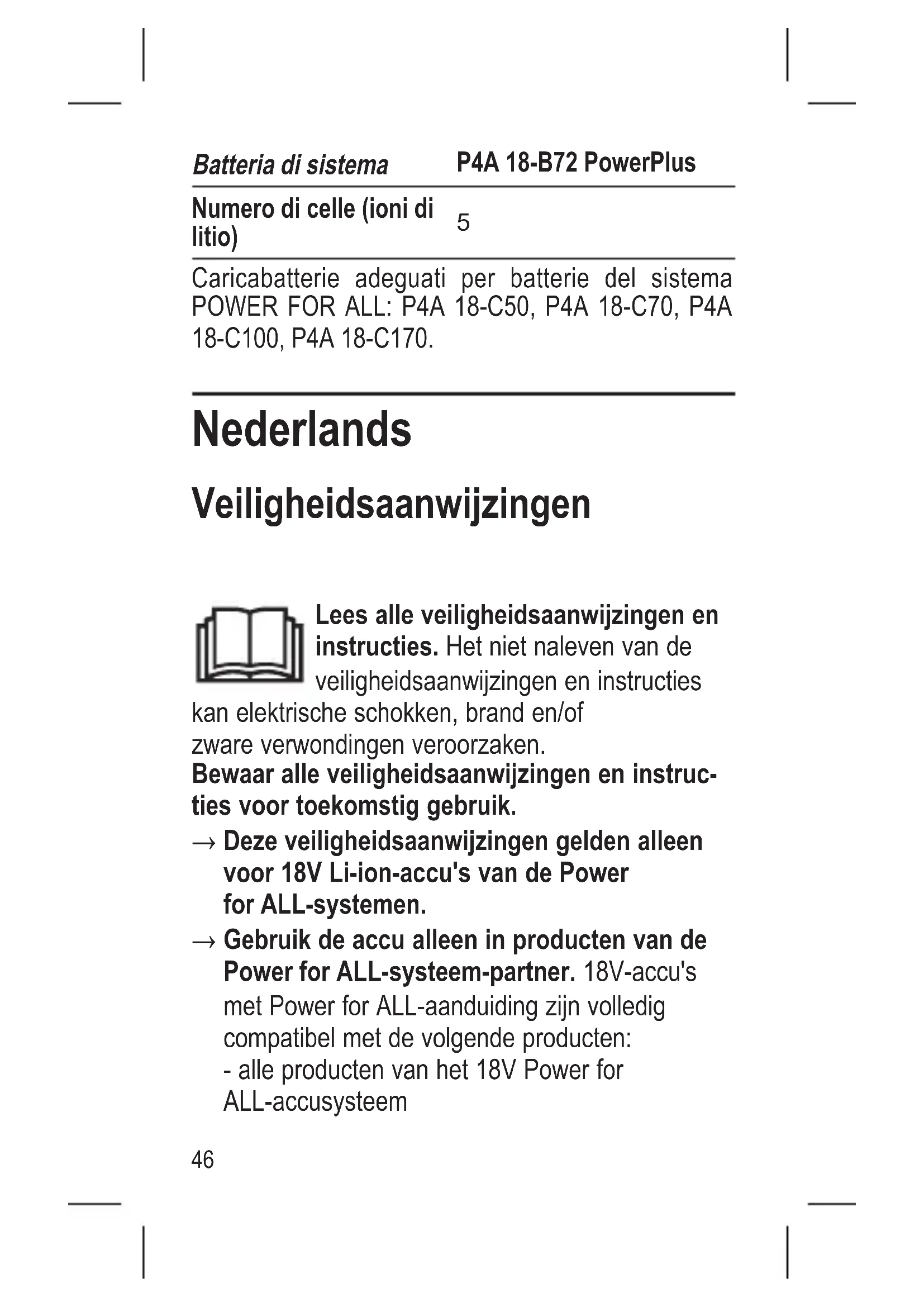Caricabatterie adeguati per batterie del sistema POWER FOR ALL: P4A 18-C50, P4A 18-C70, P4A 18-C100, P4A 18-C170. Nederlands Veiligheidsaanwijzingen Lees alle veiligheidsaanwijzingen en instructies. Het niet naleven van de veiligheidsaanwijzingen en instructies kan elektrische schokken, brand en/of zware verwondingen veroorzaken. Bewaar alle veiligheidsaanwijzingen en instruc- ties voor toekomstig gebruik.