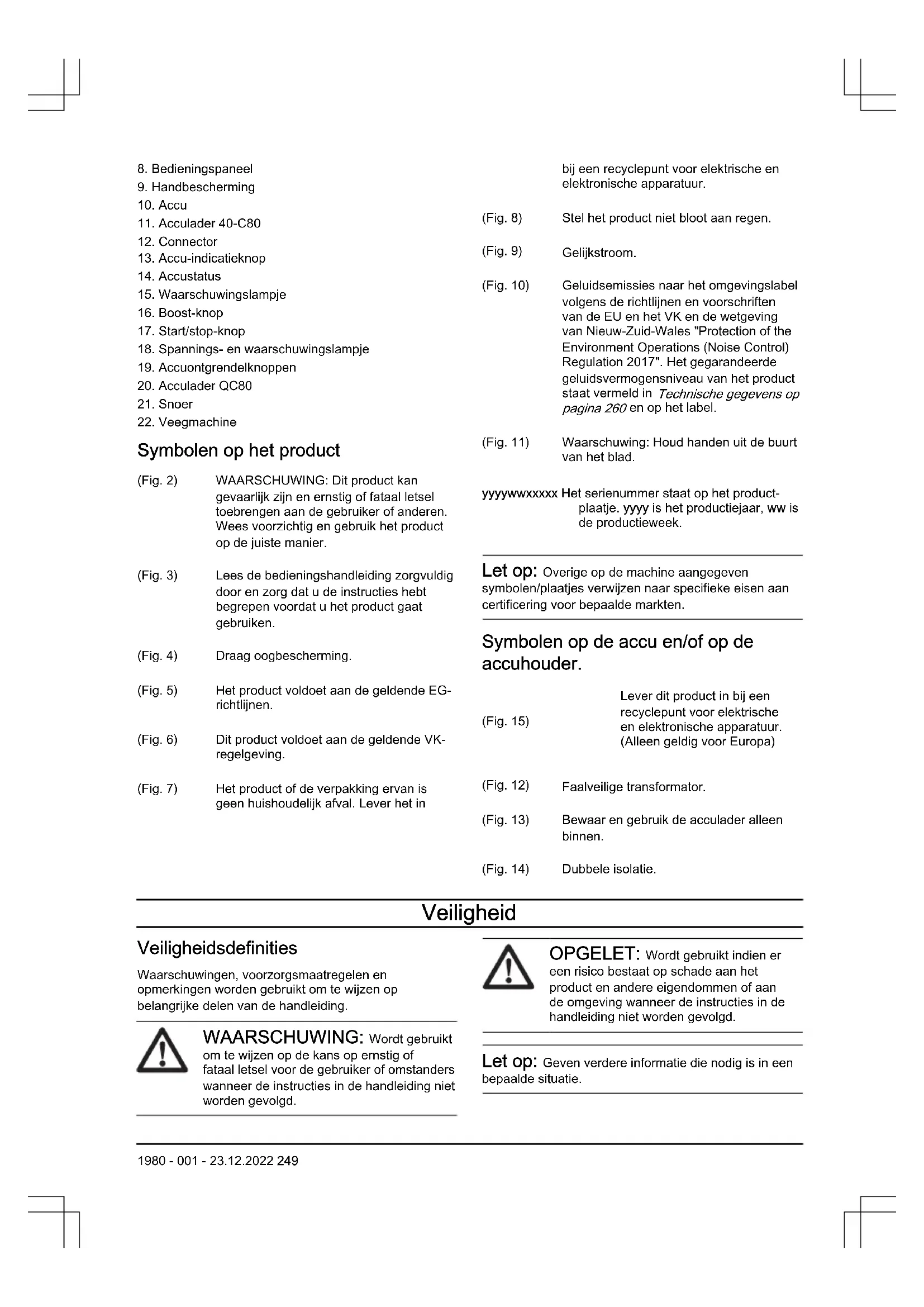 Symbolen op het product (Fig. 2) WAARSCHUWING: Dit product kan gevaarlijk zijn en ernstig of fataal letsel toebrengen aan de gebruiker of anderen. Wees voorzichtig en gebruik het product op de juiste manier. (Fig. 3) Lees de bedieningshandleiding zorgvuldig door en zorg dat u de instructies hebt begrepen voordat u het product gaat gebruiken. (Fig. 4) Draag oogbescherming. (Fig. 5) Het product voldoet aan de geldende EG- richtlijnen. (Fig. 6) Dit product voldoet aan de geldende VK- regelgeving. (Fig. 7) Het product of de verpakking ervan is geen huishoudelijk afval. Lever het in bij een recyclepunt voor elektrische en elektronische apparatuur. (Fig. 8) Stel het product niet bloot aan regen. (Fig. 9) Gelijkstroom. (Fig. 10) Geluidsemissies naar het omgevingslabel volgens de richtlijnen en voorschriften van de EU en het VK en de wetgeving van Nieuw-Zuid-Wales "Protection of the Environment Operations (Noise Control) Regulation 2017". Het gegarandeerde geluidsvermogensniveau van het product staat vermeld in Technische gegevens op pagina 260 en op het label. (Fig. 11) Waarschuwing: Houd handen uit de buurt van het blad. yyyywwxxxxx Het serienummer staat op het product- plaatje. yyyy is het productiejaar, ww is de productieweek. Let op: Overige op de machine aangegeven symbolen/plaatjes verwijzen naar specifieke eisen aan certificering voor bepaalde markten. Symbolen op de accu en/of op de accuhouder. (Fig. 15) Lever dit product in bij een recyclepunt voor elektrische en elektronische apparatuur. (Alleen geldig voor Europa) (Fig. 12) Faalveilige transformator. (Fig. 13) Bewaar en gebruik de acculader alleen binnen. (Fig. 14) Dubbele isolatie. Veiligheid Veiligheidsdefinities Waarschuwingen, voorzorgsmaatregelen en opmerkingen worden gebruikt om te wijzen op belangrijke delen van de handleiding. WAARSCHUWING: Wordt gebruikt om te wijzen op de kans op ernstig of fataal letsel voor de gebruiker of omstanders wanneer de instructies in de handleiding niet worden gevolgd. OPGELET: Wordt gebruikt indien er een risico bestaat op schade aan het product en andere eigendommen of aan de omgeving wanneer de instructies in de handleiding niet worden gevolgd. Let op: Geven verdere informatie die nodig is in een bepaalde situatie. 1980 - 001 - 23.12.2022 249Algemene veiligheidswaarschuwingen voor elektrisch gereedschap WAARSCHUWING: Lees alle veiligheidswaarschuwingen en alle instructies. Het niet opvolgen van de waarschuwingen en instructies kan leiden tot elektrische schokken, brand en/of ernstig letsel. Let op: Bewaar alle waarschuwingen en instructies voor later gebruik. De term "elektrisch gereedschap" in de waarschuwingen verwijst zowel naar gereedschappen die op het lichtnet (met snoer) werken als gereedschappen die met een accu (snoerloos) werken. Veiligheid van het werkgebied