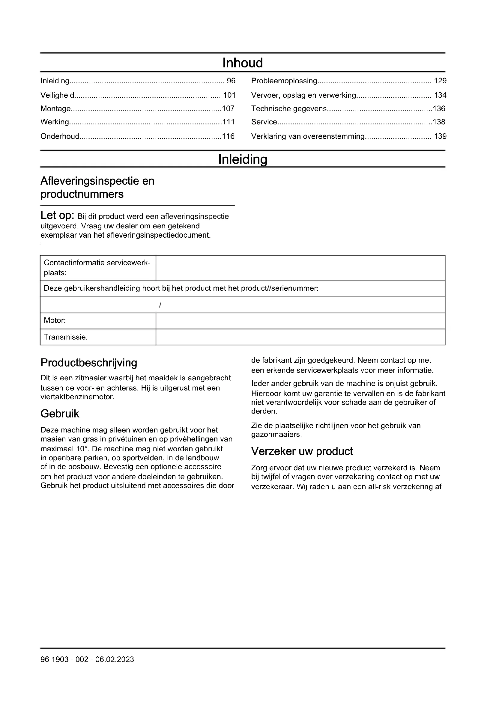 Motor: Transmissie: Productbeschrijving Dit is een zitmaaier waarbij het maaidek is aangebracht tussen de voor- en achteras. Hij is uitgerust met een viertaktbenzinemotor. Gebruik Deze machine mag alleen worden gebruikt voor het maaien van gras in privétuinen en op privéhellingen van maximaal 10°. De machine mag niet worden gebruikt in openbare parken, op sportvelden, in de landbouw of in de bosbouw. Bevestig een optionele accessoire om het product voor andere doeleinden te gebruiken. Gebruik het product uitsluitend met accessoires die door de fabrikant zijn goedgekeurd. Neem contact op met een erkende servicewerkplaats voor meer informatie. Ieder ander gebruik van de machine is onjuist gebruik. Hierdoor komt uw garantie te vervallen en is de fabrikant niet verantwoordelijk voor schade aan de gebruiker of derden. Zie de plaatselijke richtlijnen voor het gebruik van gazonmaaiers. Verzeker uw product Zorg ervoor dat uw nieuwe product verzekerd is. Neem bij twijfel of vragen over verzekering contact op met uw verzekeraar. Wij raden u aan een all-risk verzekering af 96 1903 - 002 - 06.02.2023te sluiten die alle risico's afdekt, inclusief schade aan derden, brand, schade, diefstal en aansprakelijkheid. Productoverzicht Productoverzicht (TC 112)
