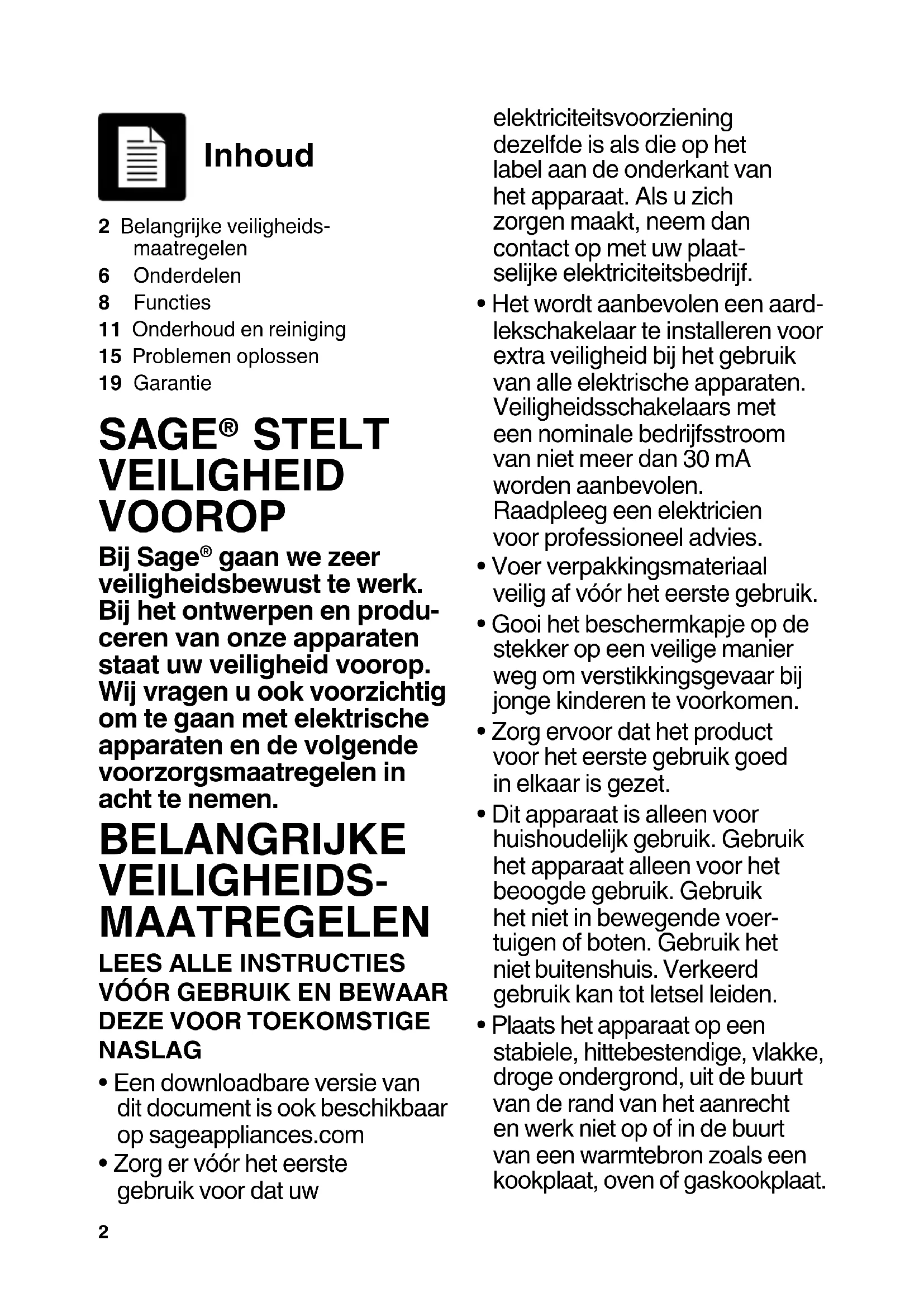- Een downloadbare versie van dit document is ook beschikbaar op sageappliances.com