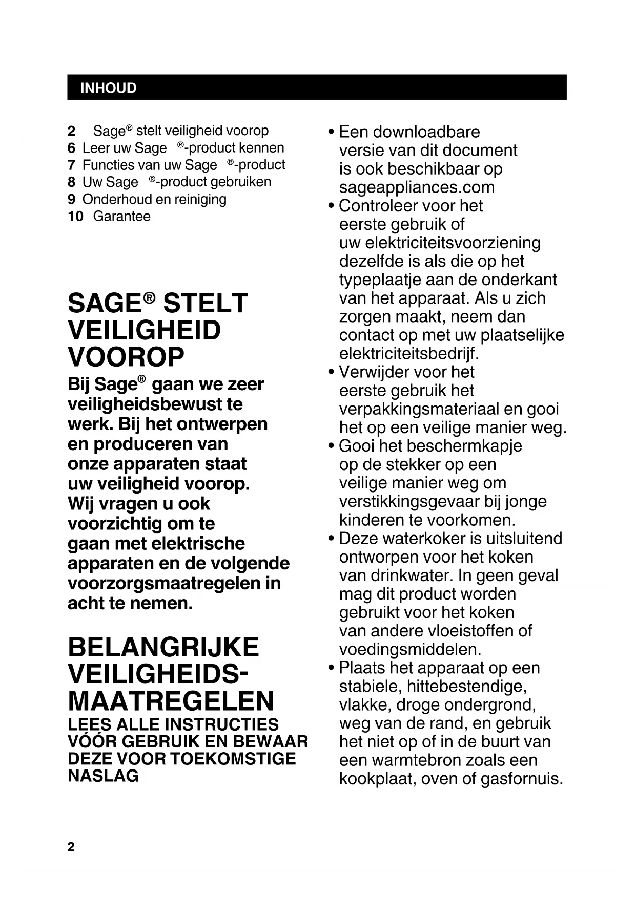 -product gebruiken 9 Onderhoud en reiniging 10 Garantee INHOUD SAGE
