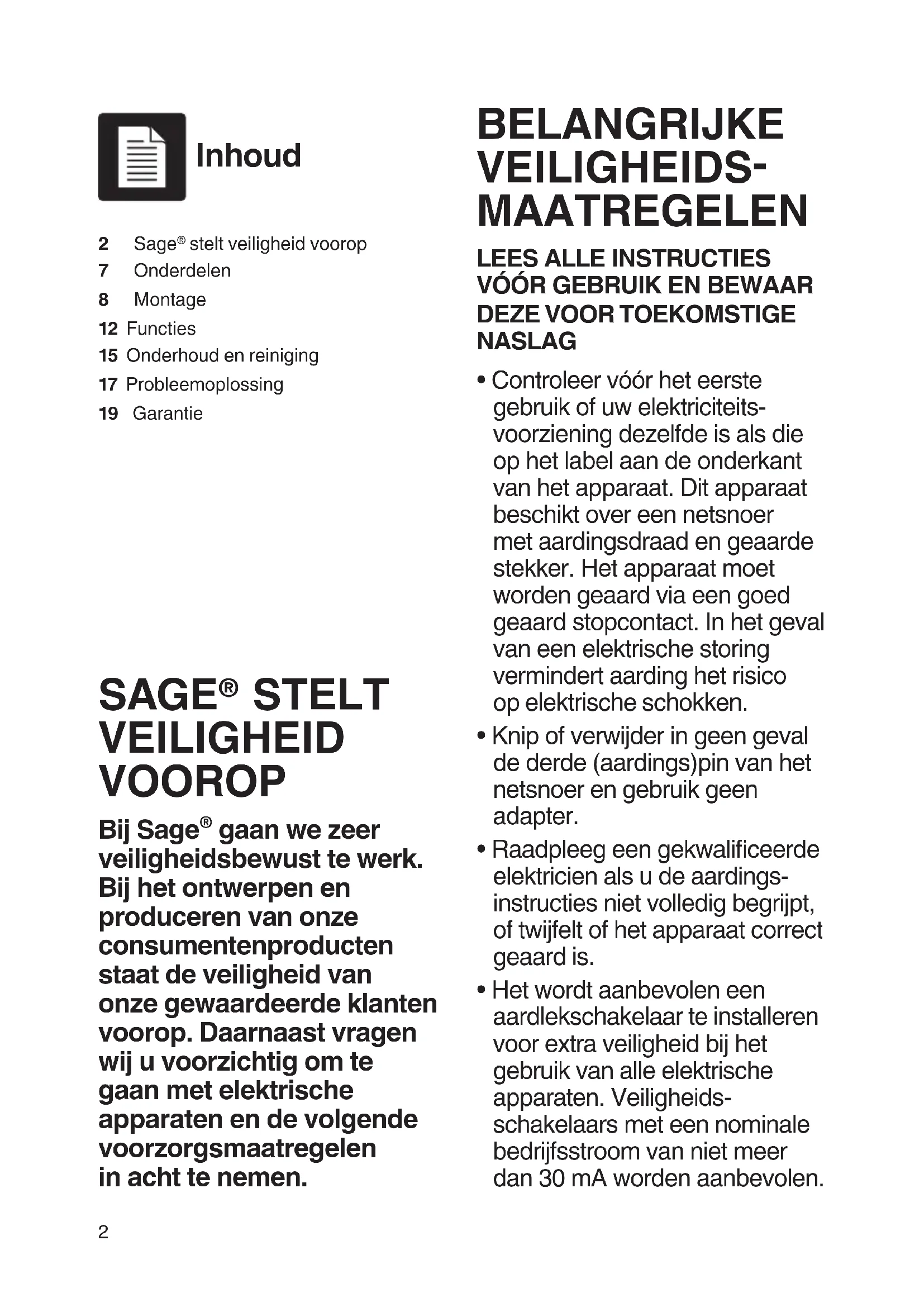 - Het wordt aanbevolen een aardlekschakelaar te installeren voor extra veiligheid bij het gebruik van alle elektrische apparaten. Veiligheids- schakelaars met een nominale bedrijfsstroom van niet meer dan 30 mA worden aanbevolen. Inhoud 2 Sage stelt veiligheid voorop7 Onderdelen8 Montage12 Functies15 Onderhoud en reiniging17 Probleemoplossing19 Garantie3