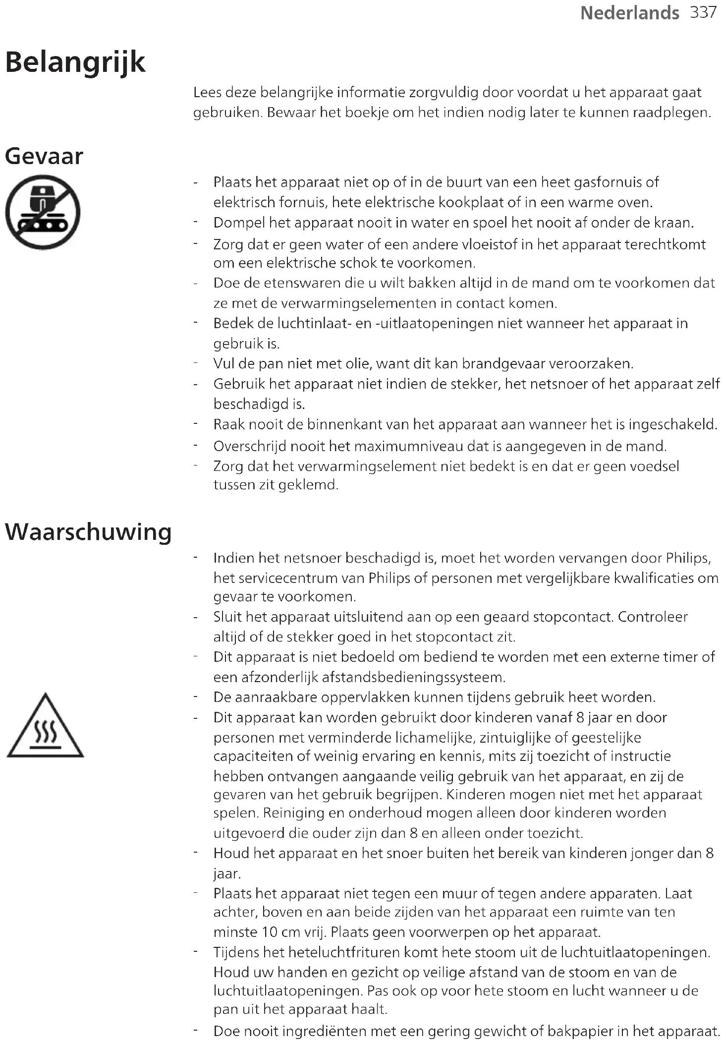 Zorg dat de in dit apparaat bereide etenswaren goudgeel worden gebakken, dus niet donker of bruin. Verwijder verbrande resten. Frituur verse aardappelen niet bij een temperatuur hoger dan 180 °C (om het ontstaan van acrylamide tot een minimum te beperken).