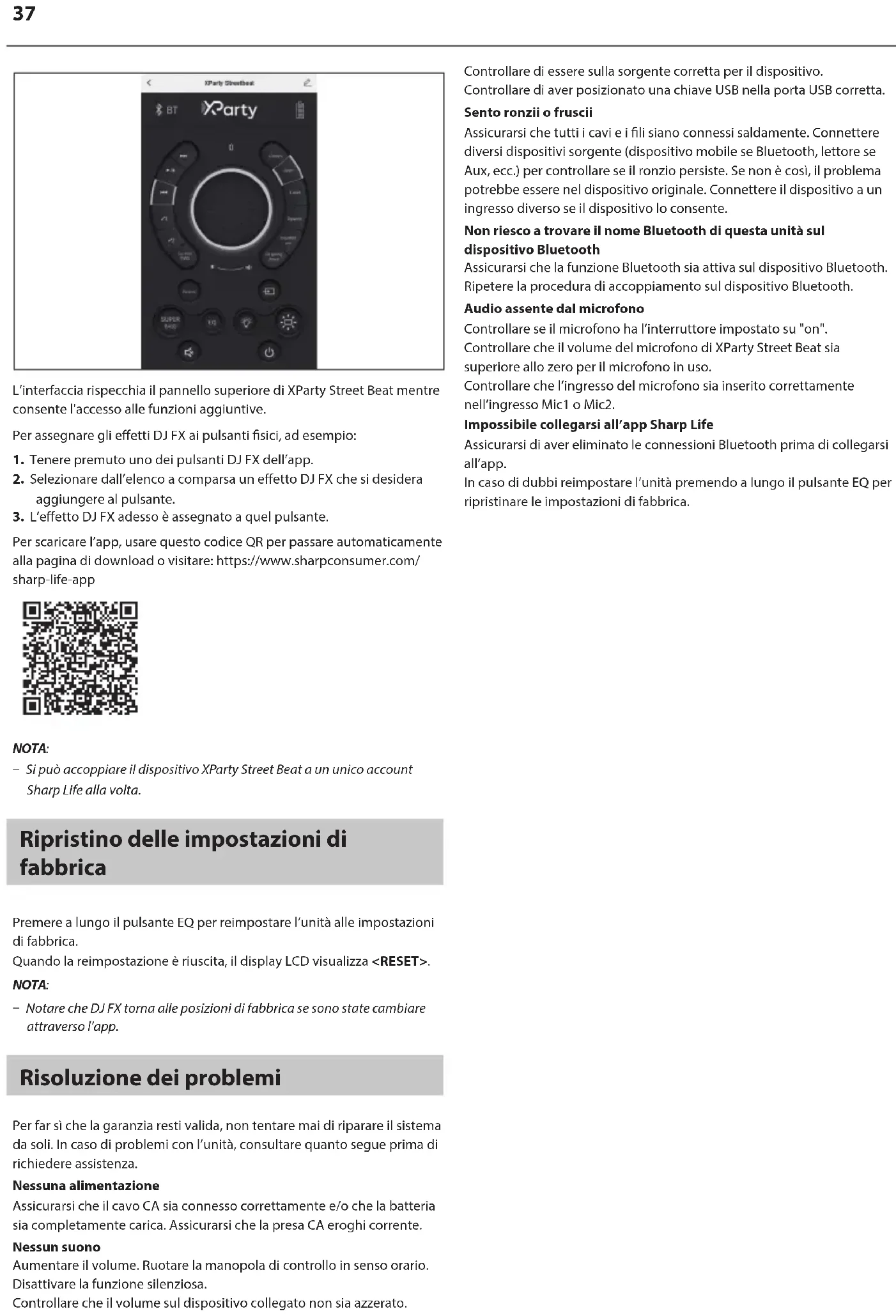 - Sommige mensen met epilepsie en lichtgevoeligheid kunnen een aanval krijgen bij blootstelling aan knipperend licht of stroboscooplicht. DJ FX Met de knoppen 1-6 kunt u snel diverse DJ-eecten afspelen. U kunt de DJ-eecten activeren in elke modus van de partyluidspreker. De XParty Street Beat heeft 12 eecten. U kunt de Sharp Life-app gebruiken om elk eecten toe te wijzen aan een knop naar keuze. Lees voor meer informatie over bediening van de app de onderstaande sectie "Sharp Life-app" Uw luidspreker buitenshuis gebruiken U kunt de XParty Street Beat buiten gebruiken dankzij de IPX4- classicatie voor spatwaterbestendigheid. Sharp Life-app U kunt de Sharp Life-app downloaden op uw smartphone. Met deze app kunt u de XParty Street Beat volledig bedienen. U kunt alle 12 de DJ-eecten afspelen en uw favorieten toewijzen aan de knoppen op de bedieningspanelen (1 tot 6), de discolichten veranderen of een voorvertoning ervan bekijken, de broningang veranderen of zelfs het volume regelen. Om de app aan de XParty Street Beat te koppelen, gaat u als volgt te werk: