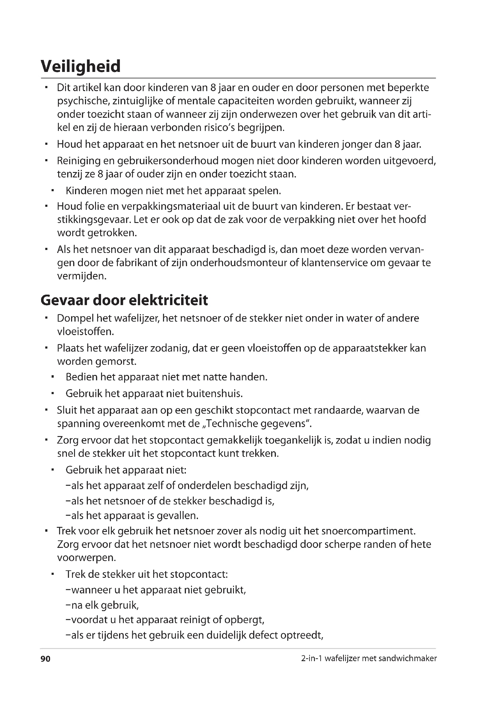 2-in-1 wafelijzer met sandwichmaker Veiligheid Dit artikel kan door kinderen van 8 jaar en ouder en door personen met beperkte psychische, zintuiglijke of mentale capaciteiten worden gebruikt, wanneer zij onder toezicht staan of wanneer zij zijn onderwezen over het gebruik van dit arti- kel en zij de hieraan verbonden risico’s begrijpen. Houd het apparaat en het netsnoer uit de buurt van kinderen jonger dan 8 jaar. Reiniging en gebruikersonderhoud mogen niet door kinderen worden uitgevoerd, tenzij ze 8 jaar of ouder zijn en onder toezicht staan. Kinderen mogen niet met het apparaat spelen. Houd folie en verpakkingsmateriaal uit de buurt van kinderen. Er bestaat ver- stikkingsgevaar. Let er ook op dat de zak voor de verpakking niet over het hoofd wordt getrokken. Als het netsnoer van dit apparaat beschadigd is, dan moet deze worden vervan- gen door de fabrikant of zijn onderhoudsmonteur of klantenservice om gevaar te vermijden. Gevaar door elektriciteit Dompel het wafelijzer, het netsnoer of de stekker niet onder in water of andere vloeistoffen. Plaats het wafelijzer zodanig, dat er geen vloeistoffen op de apparaatstekker kan worden gemorst. Bedien het apparaat niet met natte handen. Gebruik het apparaat niet buitenshuis. Sluit het apparaat aan op een geschikt stopcontact met randaarde, waarvan de spanning overeenkomt met de „Technische gegevens“. Zorg ervoor dat het stopcontact gemakkelijk toegankelijk is, zodat u indien nodig snel de stekker uit het stopcontact kunt trekken. Gebruik het apparaat niet: − als het apparaat zelf of onderdelen beschadigd zijn, − als het netsnoer of de stekker beschadigd is, − als het apparaat is gevallen. Trek voor elk gebruik het netsnoer zover als nodig uit het snoercompartiment. Zorg ervoor dat het netsnoer niet wordt beschadigd door scherpe randen of hete voorwerpen. Trek de stekker uit het stopcontact: − wanneer u het apparaat niet gebruikt, − na elk gebruik, − voordat u het apparaat reinigt of opbergt, − als er tijdens het gebruik een duidelijk defect optreedt,Veiligheid
