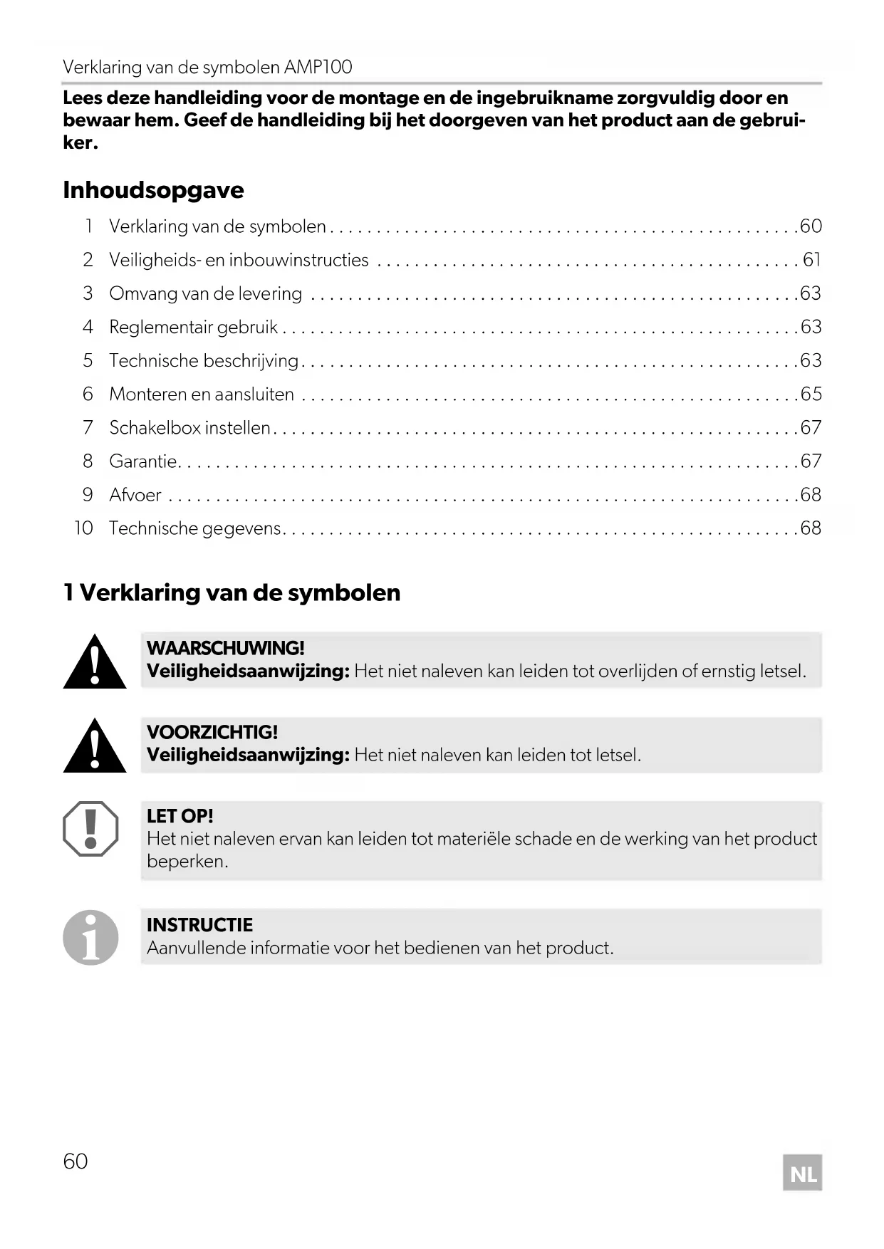 WAARSCHUWING! Veiligheidsaanwijzing: Het niet naleven kan leiden tot overlijden of ernstig letsel. VOORZICHTIG! Veiligheidsaanwijzing: Het niet naleven kan leiden tot letsel. LET OP! Het niet naleven ervan kan leiden tot materiële schade en de werking van het product beperken. INSTRUCTIE Aanvullende informatie voor het bedienen van het product. AMP100-IO-16s.book Seite 60 Mittwoch, 26. Oktober 2016 11:15 11AMP100 Veiligheids- en inbouwinstructies