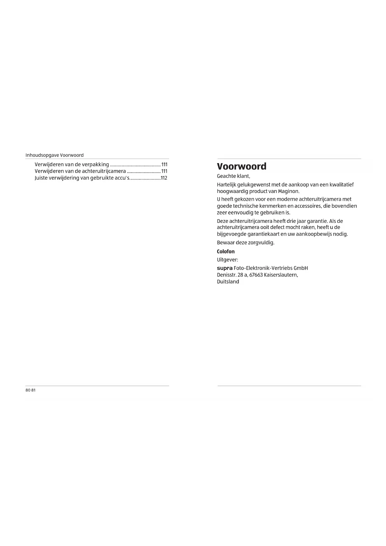 Voorwoord Geachte klant, Hartelijk gelukgewenst met de aankoop van een kwalitatief hoogwaardig product van Maginon. U heeft gekozen voor een moderne achteruitrijcamera met goede technische kenmerken en accessoires, die bovendien zeer eenvoudig te gebruiken is. Deze achteruitrijcamera heeft drie jaar garantie. Als de achteruitrijcamera ooit defect mocht raken, heeft u de bijgevoegde garantiekaart en uw aankoopbewijs nodig. Bewaar deze zorgvuldig. Colofon Uitgever: supra Foto-Elektronik-Vertriebs GmbH Denisstr. 28 a, 67663 Kaiserslautern, Duitsland Verwijderen van de verpakking ....................................... 111 Verwijderen van de achteruitrijcamera .......................... 111 Juiste verwijdering van gebruikte accu's. .......................112Algemene informatie Algemene informatie Algemene informatie Gebruiksaanwijzing lezen en bewaren Deze gebruiksaanwijzing hoort bij deze achteruitrijcamera RC-300WS (hierna te noemen "achteruitrijcamera"). Het maakt deel uit van het product en bevat belangrijke informatie over de inbedrijfstelling, behandeling en verwijdering. Lees de gebruiksaanwijzing en de veiligheidsinstructies zorgvuldig door voordat u de achteruitrijcamera gaat gebruiken. Het niet naleven van deze gebruiksaanwijzing kan leiden tot ongevallen of schade aan de achteruitrijcamera . De gebruiksaanwijzing is gebaseerd op de in de Europese Unie geldende normen en voorschriften. Neem ook de landspecifieke richtlijnen en wetten in acht. Bewaar de gebruiksaanwijzing voor verder gebruik. Als u de achteruitrijcamera aan iemand anders doorgeeft, zorg er dan voor dat u ook deze gebruiksaanwijzing meegeeft. Verklaring van tekens De volgende symbolen en attentieteksten worden in deze gebruiksaanwijzing, op het apparaat zelf of op de verpakking gebruikt. GEVAAR! Dit signaalsymbool/woord duidt op een gevaar met een hoog risico met mogelijk de dood of ernstig letsel tot gevolg. WAARSCHUWING! Dit signaalsymbool/woord duidt op een gevaar met een gemiddeld risico met mogelijk de dood of ernstig letsel tot gevolg. VOORZICHTIG! Dit signaalsymbool/woord duidt op een gevaar met een laag risico met mogelijk gering of matig letsel tot gevolg. ATTENTIE! Dit signaalwoord waarschuwt voor mogelijke materiële schade. Dit symbool geeft u nuttige aanvullende informatie over de montage of bediening.Algemene informatie Gebruik overeenkomstig de bestemming84 85 IP67 Producten met dit symbool zijn stofdicht en beschermd tegen tijdelijke onderdompeling. Producten die met dit symbool zijn gemarkeerd, worden met gelijkstroom gebruikt. 10R-06 3414 Producten met dit symbool hebben een ECE-typegoedkeuring en mogen in het wegverkeer in de Europese Economische Ruimte worden gebruikt, zelfs zonder vermelding in de voertuigdocumenten. Verklaring van overeenstemming (zie hoofdstuk „EU-conformiteitsverklaring“): Producten met dit symbool voldoen aan alle toepasselijke voorschriften van de Europese Economische Ruimte. F3AL250V