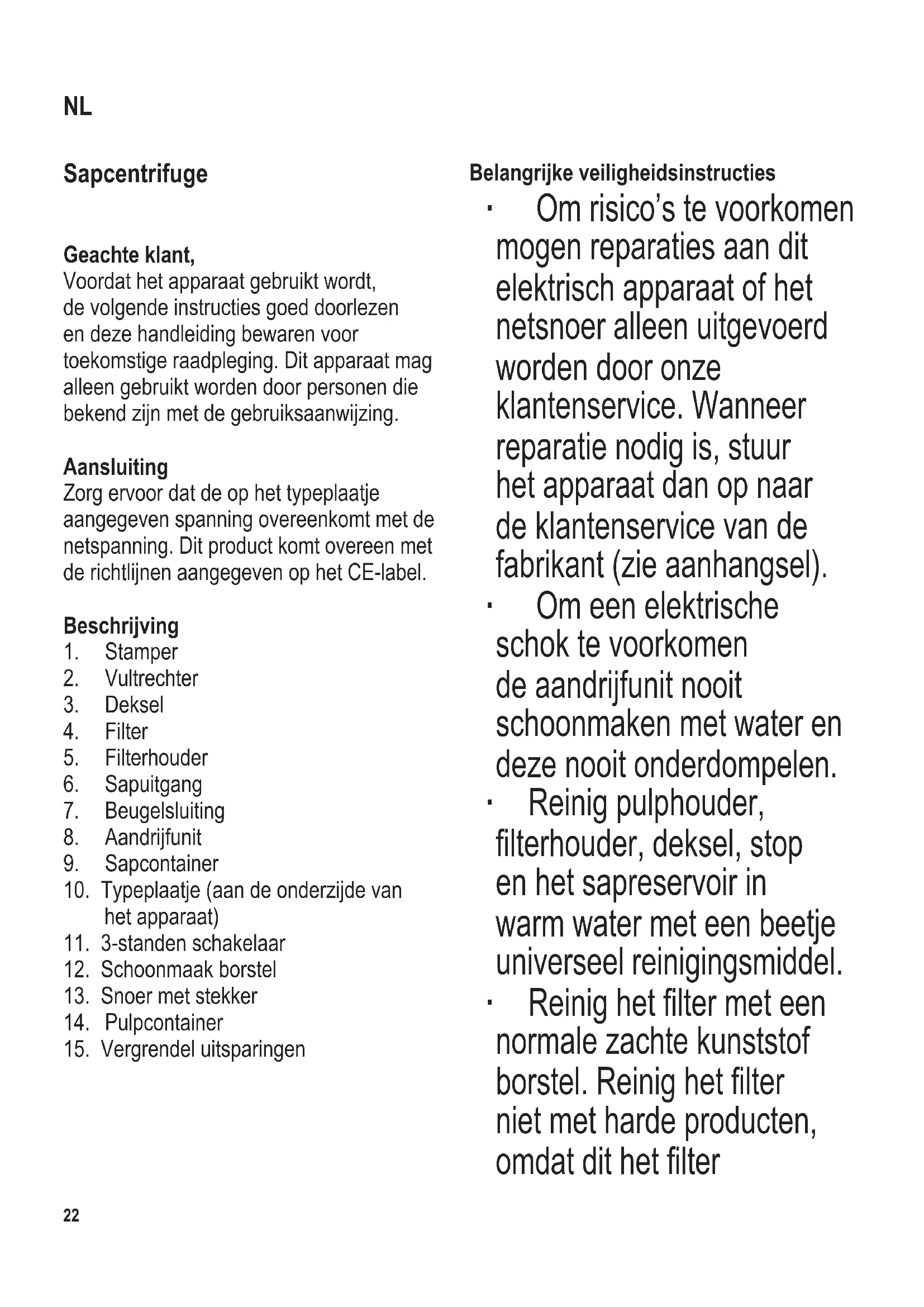 Belangrijke veiligheidsinstructies ∙ Om risico’s te voorkomen mogen reparaties aan dit elektrisch apparaat of het netsnoer alleen uitgevoerd worden door onze klantenservice. Wanneer reparatie nodig is, stuur het apparaat dan op naar de klantenservice van de fabrikant (zie aanhangsel). ∙ Om een elektrische schok te voorkomen de aandrijfunit nooit schoonmaken met water en deze nooit onderdompelen. ∙ Reinig pulphouder, lterhouder, deksel, stop en het sapreservoir in warm water met een beetje universeel reinigingsmiddel. ∙ Reinig het lter met een normale zachte kunststof borstel. Reinig het lter niet met harde producten, omdat dit het lter NL104 x 142 mm