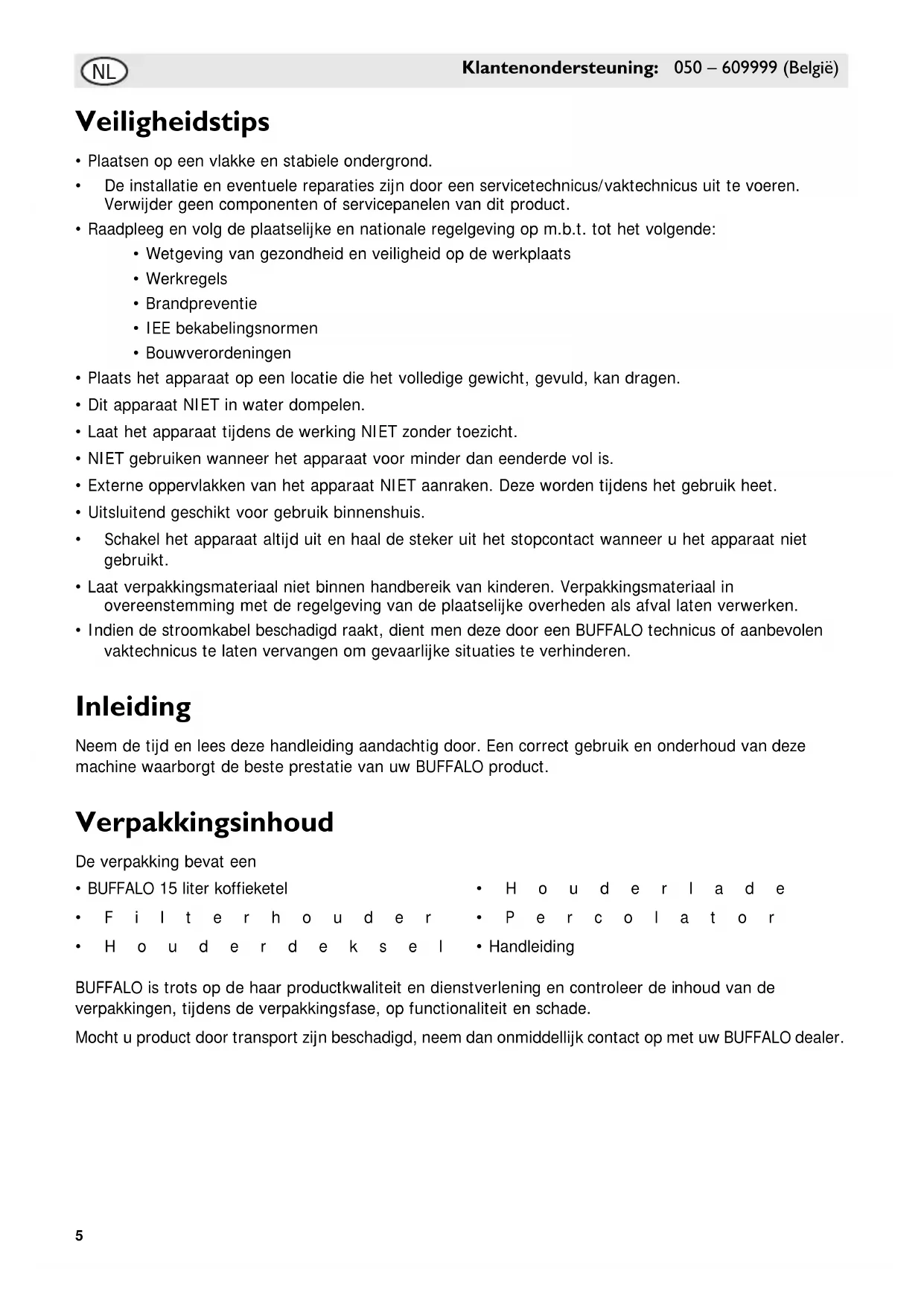 - Indien de stroomkabel beschadigd raakt, dient men deze door een BUFFALO technicus of aanbevolen vaktechnicus te laten vervangen om gevaarlijke situaties te verhinderen. Inleiding Neem de tijd en lees deze handleiding aandachtig door. Een correct gebruik en onderhoud van deze machine waarborgt de beste prestatie van uw BUFFALO product. Verpakkingsinhoud De verpakking bevat een BUFFALO is trots op de haar productkwaliteit en dienstverlening en controleer de inhoud van de verpakkingen, tijdens de verpakkingsfase, op functionaliteit en schade. Mocht u product door transport zijn beschadigd, neem dan onmiddellijk contact op met uw BUFFALO dealer.