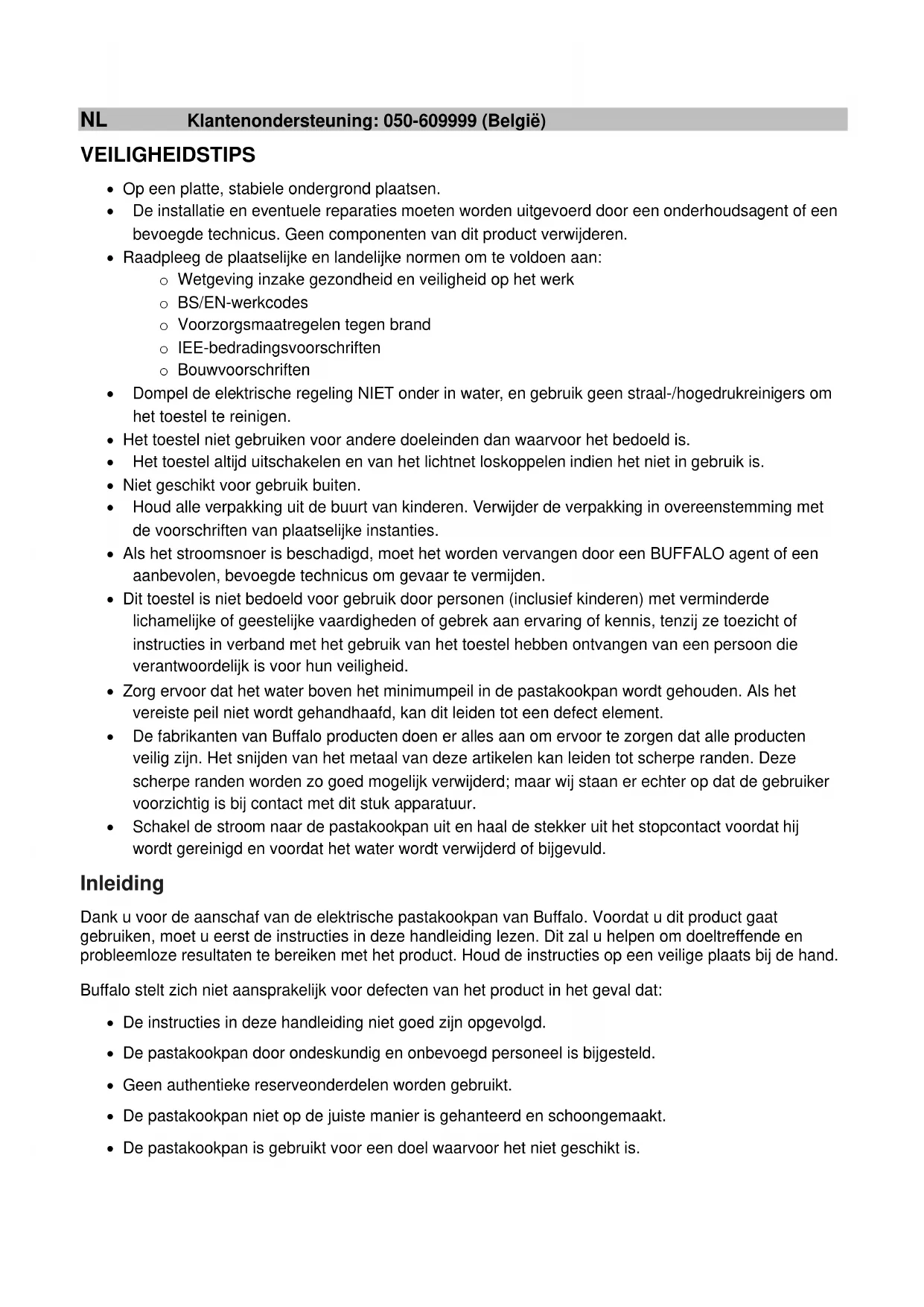 All rights reserved. No part of these instructions may be produced or transmitted in any form or by any means, electronic, mechanical, photocopying, recording or otherwise, without the prior written permission of BUFFALO. Every effort is made to ensure all details are correct at the time of going to press, however, BUFFALO reserve the right to change specifications without noticeNL Klantenondersteuning: 050-609999 (België) VEILIGHEIDSTIPS Op een platte, stabiele ondergrond plaatsen. De installatie en eventuele reparaties moeten worden uitgevoerd door een onderhoudsagent of een bevoegde technicus. Geen componenten van dit product verwijderen. Raadpleeg de plaatselijke en landelijke normen om te voldoen aan: o Wetgeving inzake gezondheid en veiligheid op het werk o BS/EN-werkcodes o Voorzorgsmaatregelen tegen brand o IEE-bedradingsvoorschriften o Bouwvoorschriften Dompel de elektrische regeling NIET onder in water, en gebruik geen straal-/hogedrukreinigers om het toestel te reinigen. Het toestel niet gebruiken voor andere doeleinden dan waarvoor het bedoeld is. Het toestel altijd uitschakelen en van het lichtnet loskoppelen indien het niet in gebruik is. Niet geschikt voor gebruik buiten. Houd alle verpakking uit de buurt van kinderen. Verwijder de verpakking in overeenstemming met de voorschriften van plaatselijke instanties. Als het stroomsnoer is beschadigd, moet het worden vervangen door een BUFFALO agent of een aanbevolen, bevoegde technicus om gevaar te vermijden. Dit toestel is niet bedoeld voor gebruik door personen (inclusief kinderen) met verminderde lichamelijke of geestelijke vaardigheden of gebrek aan ervaring of kennis, tenzij ze toezicht of instructies in verband met het gebruik van het toestel hebben ontvangen van een persoon die verantwoordelijk is voor hun veiligheid. Zorg ervoor dat het water boven het minimumpeil in de pastakookpan wordt gehouden. Als het vereiste peil niet wordt gehandhaafd, kan dit leiden tot een defect element. De fabrikanten van Buffalo producten doen er alles aan om ervoor te zorgen dat alle producten veilig zijn. Het snijden van het metaal van deze artikelen kan leiden tot scherpe randen. Deze scherpe randen worden zo goed mogelijk verwijderd; maar wij staan er echter op dat de gebruiker voorzichtig is bij contact met dit stuk apparatuur. Schakel de stroom naar de pastakookpan uit en haal de stekker uit het stopcontact voordat hij wordt gereinigd en voordat het water wordt verwijderd of bijgevuld. Inleiding Dank u voor de aanschaf van de elektrische pastakookpan van Buffalo. Voordat u dit product gaat gebruiken, moet u eerst de instructies in deze handleiding lezen. Dit zal u helpen om doeltreffende en probleemloze resultaten te bereiken met het product. Houd de instructies op een veilige plaats bij de hand. Buffalo stelt zich niet aansprakelijk voor defecten van het product in het geval dat: De instructies in deze handleiding niet goed zijn opgevolgd. De pastakookpan door ondeskundig en onbevoegd personeel is bijgesteld. Geen authentieke reserveonderdelen worden gebruikt. De pastakookpan niet op de juiste manier is gehanteerd en schoongemaakt. De pastakookpan is gebruikt voor een doel waarvoor het niet geschikt is.Klantenondersteuning: 040-2628080 (Nederland) NL Verpakking Alle Buffalo producten worden voorafgaand aan de verpakking geïnspecteerd en getest.
