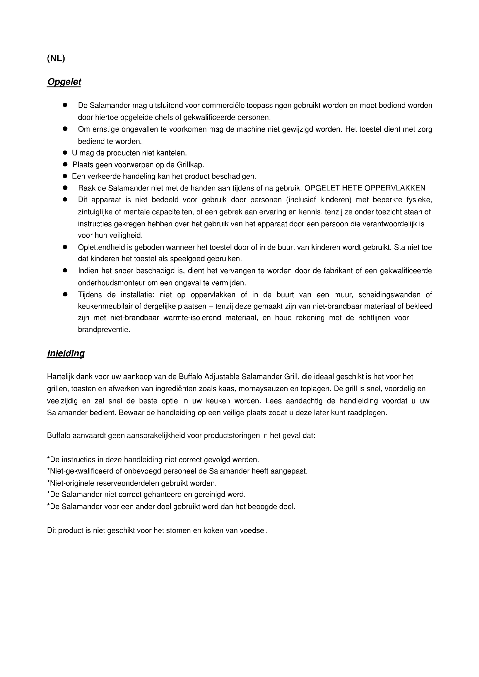 All rights reserved. No part of these instructions may be produced or transmitted in any form or by any means, electronic, mechanical, photocopying, recording or otherwise, without the prior written permission of BUFFALO. Every effort is made to ensure all details are correct at the time of going to press, however, BUFFALO reserve the right to change specifications without notice.(NL) Opgelet De Salamander mag uitsluitend voor commerciële toepassingen gebruikt worden en moet bediend worden door hiertoe opgeleide chefs of gekwalificeerde personen. Om ernstige ongevallen te voorkomen mag de machine niet gewijzigd worden. Het toestel dient met zorg bediend te worden. U mag de producten niet kantelen. Plaats geen voorwerpen op de Grillkap. Een verkeerde handeling kan het product beschadigen. Raak de Salamander niet met de handen aan tijdens of na gebruik. OPGELET HETE OPPERVLAKKEN Dit apparaat is niet bedoeld voor gebruik door personen (inclusief kinderen) met beperkte fysieke, zintuiglijke of mentale capaciteiten, of een gebrek aan ervaring en kennis, tenzij ze onder toezicht staan of instructies gekregen hebben over het gebruik van het apparaat door een persoon die verantwoordelijk is voor hun veiligheid. Oplettendheid is geboden wanneer het toestel door of in de buurt van kinderen wordt gebruikt. Sta niet toe dat kinderen het toestel als speelgoed gebruiken. Indien het snoer beschadigd is, dient het vervangen te worden door de fabrikant of een gekwalificeerde onderhoudsmonteur om een ongeval te vermijden. Tijdens de installatie: niet op oppervlakken of in de buurt van een muur, scheidingswanden of keukenmeubilair of dergelijke plaatsen – tenzij deze gemaakt zijn van niet-brandbaar materiaal of bekleed zijn met niet-brandbaar warmte-isolerend materiaal, en houd rekening met de richtlijnen voor brandpreventie. Inleiding Hartelijk dank voor uw aankoop van de Buffalo Adjustable Salamander Grill, die ideaal geschikt is het voor het grillen, toasten en afwerken van ingrediënten zoals kaas, mornaysauzen en toplagen. De grill is snel, voordelig en veelzijdig en zal snel de beste optie in uw keuken worden. Lees aandachtig de handleiding voordat u uw Salamander bedient. Bewaar de handleiding op een veilige plaats zodat u deze later kunt raadplegen. Buffalo aanvaardt geen aansprakelijkheid voor productstoringen in het geval dat: *De instructies in deze handleiding niet correct gevolgd werden. *Niet-gekwalificeerd of onbevoegd personeel de Salamander heeft aangepast. *Niet-originele reserveonderdelen gebruikt worden. *De Salamander niet correct gehanteerd en gereinigd werd. *De Salamander voor een ander doel gebruikt werd dan het beoogde doel. Dit product is niet geschikt voor het stomen en koken van voedsel.(NL) Verpakking Buffalo is trots op zijn kwaliteit en service, en zorgt ervoor dat op het ogenblik van verpakking alle producten volledig functioneel en vrij van schade geleverd worden. In deze verpakking wordt het volgende geleverd: *Adjustable Salamander Grill *Druipschaal *Grillrek *Handleiding In het geval dat u schade vaststelt als het gevolg van het transport dient u onmiddellijk contact op te nemen met uw Buffalo verdeler.
