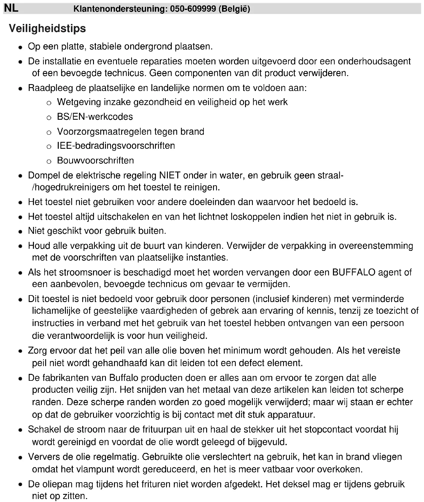 All rights reserved. No part of these instructions may be produced or transmitted in any form or by any means, electronic, mechanical, photocopying, recording or otherwise, without the prior written permission of BUFFALO. Every effort is made to ensure all details are correct at the time of going to press, however, BUFFALO reserve the right to change specifications without noticeNL Klantenondersteuning: 050-609999 (België) Veiligheidstips Op een platte, stabiele ondergrond plaatsen. De installatie en eventuele reparaties moeten worden uitgevoerd door een onderhoudsagent of een bevoegde technicus. Geen componenten van dit product verwijderen. Raadpleeg de plaatselijke en landelijke normen om te voldoen aan: o Wetgeving inzake gezondheid en veiligheid op het werk o BS/EN-werkcodes o Voorzorgsmaatregelen tegen brand o IEE-bedradingsvoorschriften o Bouwvoorschriften Dompel de elektrische regeling NIET onder in water, en gebruik geen straal- /hogedrukreinigers om het toestel te reinigen. Het toestel niet gebruiken voor andere doeleinden dan waarvoor het bedoeld is. Het toestel altijd uitschakelen en van het lichtnet loskoppelen indien het niet in gebruik is. Niet geschikt voor gebruik buiten. Houd alle verpakking uit de buurt van kinderen. Verwijder de verpakking in overeenstemming met de voorschriften van plaatselijke instanties. Als het stroomsnoer is beschadigd moet het worden vervangen door een BUFFALO agent of een aanbevolen, bevoegde technicus om gevaar te vermijden. Dit toestel is niet bedoeld voor gebruik door personen (inclusief kinderen) met verminderde lichamelijke of geestelijke vaardigheden of gebrek aan ervaring of kennis, tenzij ze toezicht of instructies in verband met het gebruik van het toestel hebben ontvangen van een persoon die verantwoordelijk is voor hun veiligheid. Zorg ervoor dat het peil van alle olie boven het minimum wordt gehouden. Als het vereiste peil niet wordt gehandhaafd kan dit leiden tot een defect element. De fabrikanten van Buffalo producten doen er alles aan om ervoor te zorgen dat alle producten veilig zijn. Het snijden van het metaal van deze artikelen kan leiden tot scherpe randen. Deze scherpe randen worden zo goed mogelijk verwijderd; maar wij staan er echter op dat de gebruiker voorzichtig is bij contact met dit stuk apparatuur. Schakel de stroom naar de frituurpan uit en haal de stekker uit het stopcontact voordat hij wordt gereinigd en voordat de olie wordt geleegd of bijgevuld. Ververs de olie regelmatig. Gebruikte olie verslechtert na gebruik, het kan in brand vliegen omdat het vlampunt wordt gereduceerd, en het is meer vatbaar voor overkoken. De oliepan mag tijdens het frituren niet worden afgedekt. Het deksel mag er tijdens gebruik niet op zitten.Klantenondersteuning: 040-2628080 (Nederland) NL Inleiding Dank u voor de aanschaf van de Buffalo elektrische frituurpan. Voordat u dit product gebruikt, moet u de instructies en aanwijzingen in deze handleiding lezen. Dit helpt u erbij om doeltreffende, probleemloze resultaten te bereiken met dit product. Houd de instructies op een veilige plaats bij de hand. Deze toestellen zijn bedoeld voor commerciële toepassingen, bijvoorbeeld in de keukens van restaurants, kantines, ziekenhuizen en zaken zoals bakkerijen, slagerijen, enz., maar niet voor de massaproductie van voedingsmiddelen. Buffalo stelt zich niet aansprakelijk voor defecten van het product in het geval dat: De instructies in deze handleiding niet goed zijn opgevolgd. De frituurpan door onbevoegd of ondeskundig personeel is aangepast. Geen authentieke reserveonderdelen worden gebruikt. De frituurpan niet op de juiste manier is gehanteerd en schoongemaakt. De frituurpan is gebruikt voor een doel waarvoor het niet geschikt is.