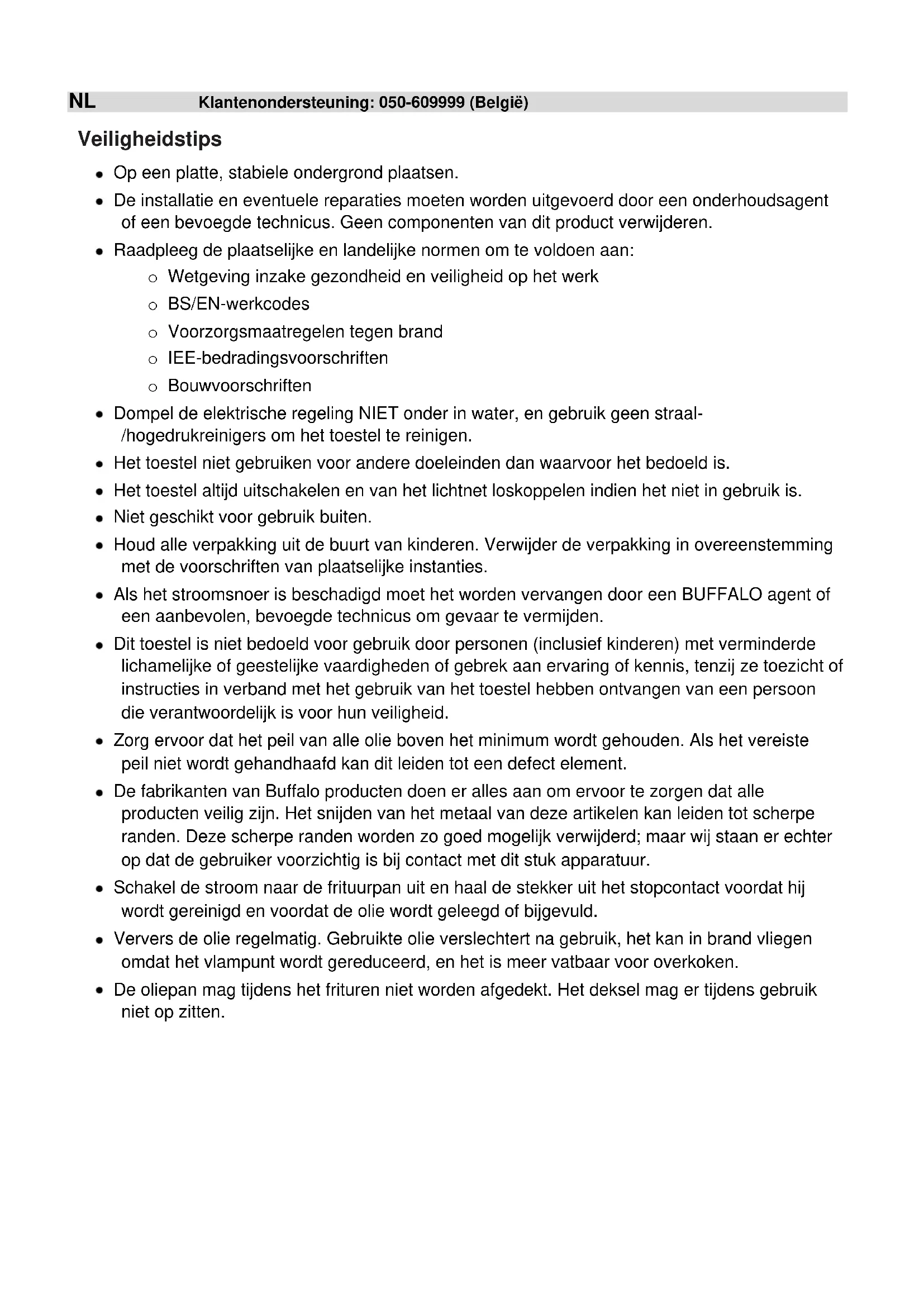 All rights reserved. No part of these instructions may be produced or transmitted in any form or by any means, electronic, mechanical, photocopying, recording or otherwise, without the prior written permission of BUFFALO. Every effort is made to ensure all details are correct at the time of going to press, however, BUFFALO reserve the right to change specifications without noticeNL Klantenondersteuning: 050-609999 (België) Veiligheidstips Op een platte, stabiele ondergrond plaatsen. De installatie en eventuele reparaties moeten worden uitgevoerd door een onderhoudsagent of een bevoegde technicus. Geen componenten van dit product verwijderen. Raadpleeg de plaatselijke en landelijke normen om te voldoen aan: o Wetgeving inzake gezondheid en veiligheid op het werk o BS/EN-werkcodes o Voorzorgsmaatregelen tegen brand o IEE-bedradingsvoorschriften o Bouwvoorschriften Dompel de elektrische regeling NIET onder in water, en gebruik geen straal- /hogedrukreinigers om het toestel te reinigen. Het toestel niet gebruiken voor andere doeleinden dan waarvoor het bedoeld is. Het toestel altijd uitschakelen en van het lichtnet loskoppelen indien het niet in gebruik is. Niet geschikt voor gebruik buiten. Houd alle verpakking uit de buurt van kinderen. Verwijder de verpakking in overeenstemming met de voorschriften van plaatselijke instanties. Als het stroomsnoer is beschadigd moet het worden vervangen door een BUFFALO agent of een aanbevolen, bevoegde technicus om gevaar te vermijden. Dit toestel is niet bedoeld voor gebruik door personen (inclusief kinderen) met verminderde lichamelijke of geestelijke vaardigheden of gebrek aan ervaring of kennis, tenzij ze toezicht of instructies in verband met het gebruik van het toestel hebben ontvangen van een persoon die verantwoordelijk is voor hun veiligheid. Zorg ervoor dat het peil van alle olie boven het minimum wordt gehouden. Als het vereiste peil niet wordt gehandhaafd kan dit leiden tot een defect element. De fabrikanten van Buffalo producten doen er alles aan om ervoor te zorgen dat alle producten veilig zijn. Het snijden van het metaal van deze artikelen kan leiden tot scherpe randen. Deze scherpe randen worden zo goed mogelijk verwijderd; maar wij staan er echter op dat de gebruiker voorzichtig is bij contact met dit stuk apparatuur. Schakel de stroom naar de frituurpan uit en haal de stekker uit het stopcontact voordat hij wordt gereinigd en voordat de olie wordt geleegd of bijgevuld. Ververs de olie regelmatig. Gebruikte olie verslechtert na gebruik, het kan in brand vliegen omdat het vlampunt wordt gereduceerd, en het is meer vatbaar voor overkoken. De oliepan mag tijdens het frituren niet worden afgedekt. Het deksel mag er tijdens gebruik niet op zitten.Klantenondersteuning: 040-2628080 (Nederland) NL Inleiding Dank u voor de aanschaf van de Buffalo elektrische frituurpan. Voordat u dit product gebruikt, moet u de instructies en aanwijzingen in deze handleiding lezen. Dit helpt u erbij om doeltreffende, probleemloze resultaten te bereiken met dit product. Houd de instructies op een veilige plaats bij de hand. Deze toestellen zijn bedoeld voor commerciële toepassingen, bijvoorbeeld in de keukens van restaurants, kantines, ziekenhuizen en zaken zoals bakkerijen, slagerijen, enz., maar niet voor de massaproductie van voedingsmiddelen. Buffalo stelt zich niet aansprakelijk voor defecten van het product in het geval dat: De instructies in deze handleiding niet goed zijn opgevolgd. De frituurpan door onbevoegd of ondeskundig personeel is aangepast. Geen authentieke reserveonderdelen worden gebruikt. De frituurpan niet op de juiste manier is gehanteerd en schoongemaakt. De frituurpan is gebruikt voor een doel waarvoor het niet geschikt is.