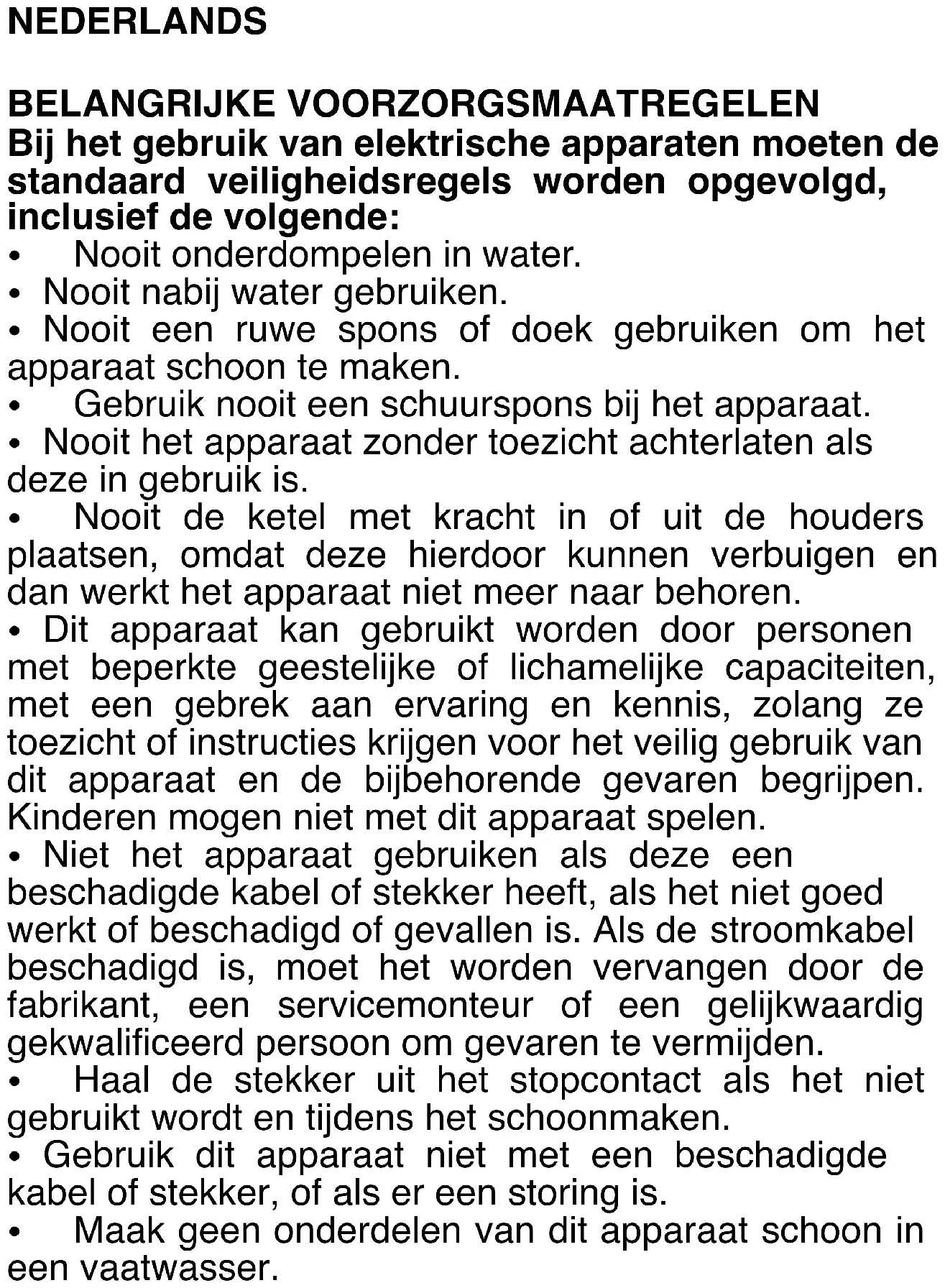 - Nooit de ketel met kracht in of uit de houders plaatsen, omdat deze hierdoor kunnen verbuigen en dan werkt het apparaat niet meer naar behoren.