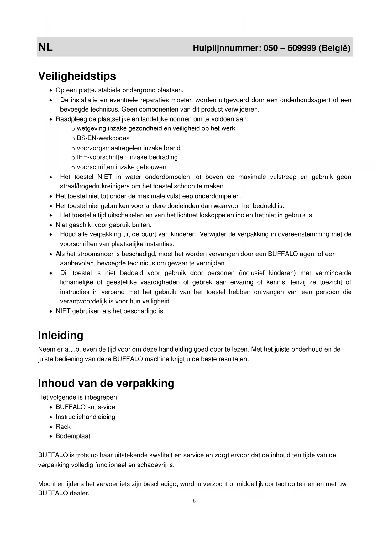 All rights reserved. No part of these instructions may be produced or transmitted in any form or by any means, electronic, mechanical, photocopying, recording or otherwise, without the prior written permission of BUFFALO. Every effort is made to ensure all details are correct at the time of going to press, however, BUFFALO reserve the right to change specifications without notice6 NL Hulplijnnummer: 050 – 609999 (België) Veiligheidstips Op een platte, stabiele ondergrond plaatsen. De installatie en eventuele reparaties moeten worden uitgevoerd door een onderhoudsagent of een bevoegde technicus. Geen componenten van dit product verwijderen. Raadpleeg de plaatselijke en landelijke normen om te voldoen aan: o wetgeving inzake gezondheid en veiligheid op het werk o BS/EN-werkcodes o voorzorgsmaatregelen inzake brand o IEE-voorschriften inzake bedrading o voorschriften inzake gebouwen Het toestel NIET in water onderdompelen tot boven de maximale vulstreep en gebruik geen straal/hogedrukreinigers om het toestel schoon te maken. Het toestel niet tot onder de maximale vulstreep onderdompelen. Het toestel niet gebruiken voor andere doeleinden dan waarvoor het bedoeld is. Het toestel altijd uitschakelen en van het lichtnet loskoppelen indien het niet in gebruik is. Niet geschikt voor gebruik buiten. Houd alle verpakking uit de buurt van kinderen. Verwijder de verpakking in overeenstemming met de voorschriften van plaatselijke instanties. Als het stroomsnoer is beschadigd, moet het worden vervangen door een BUFFALO agent of een aanbevolen, bevoegde technicus om gevaar te vermijden. Dit toestel is niet bedoeld voor gebruik door personen (inclusief kinderen) met verminderde lichamelijke of geestelijke vaardigheden of gebrek aan ervaring of kennis, tenzij ze toezicht of instructies in verband met het gebruik van het toestel hebben ontvangen van een persoon die verantwoordelijk is voor hun veiligheid. NIET gebruiken als het beschadigd is. Inleiding Neem er a.u.b. even de tijd voor om deze handleiding goed door te lezen. Met het juiste onderhoud en de juiste bediening van deze BUFFALO machine krijgt u de beste resultaten. Inhoud van de verpakking Het volgende is inbegrepen: BUFFALO sous-vide Instructiehandleiding Rack Bodemplaat BUFFALO is trots op haar uitstekende kwaliteit en service en zorgt ervoor dat de inhoud ten tijde van de verpakking volledig functioneel en schadevrij is. Mocht er tijdens het vervoer iets zijn beschadigd, wordt u verzocht onmiddellijk contact op te nemen met uw BUFFALO dealer.7 Hulplijnnummer: 040 – 2628080 (Nederland) NL Functie LCD-scherm