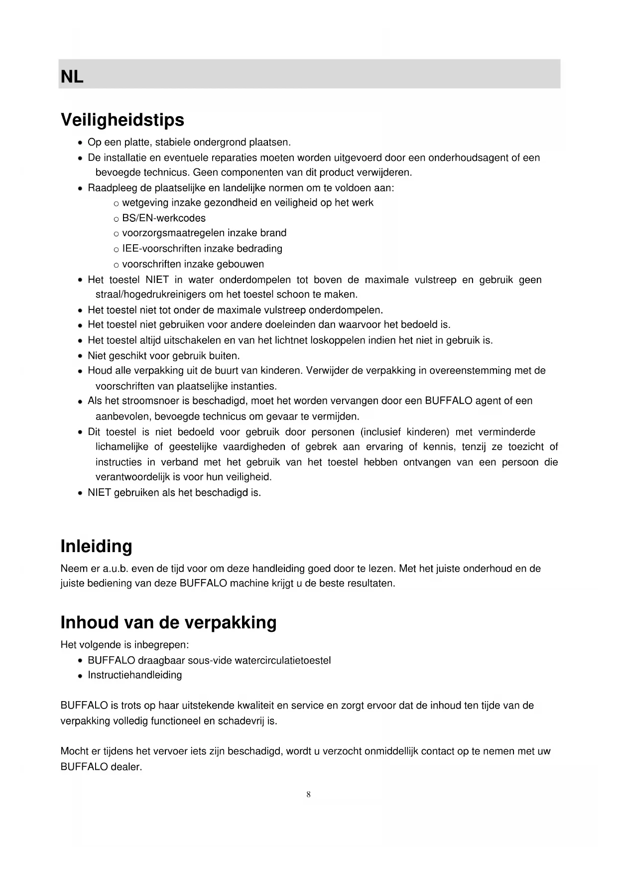 Veiligheidstips Op een platte, stabiele ondergrond plaatsen. De installatie en eventuele reparaties moeten worden uitgevoerd door een onderhoudsagent of een bevoegde technicus. Geen componenten van dit product verwijderen. Raadpleeg de plaatselijke en landelijke normen om te voldoen aan: o wetgeving inzake gezondheid en veiligheid op het werk o BS/EN-werkcodes o voorzorgsmaatregelen inzake brand o IEE-voorschriften inzake bedrading o voorschriften inzake gebouwen Het toestel NIET in water onderdompelen tot boven de maximale vulstreep en gebruik geen straal/hogedrukreinigers om het toestel schoon te maken. Het toestel niet tot onder de maximale vulstreep onderdompelen. Het toestel niet gebruiken voor andere doeleinden dan waarvoor het bedoeld is. Het toestel altijd uitschakelen en van het lichtnet loskoppelen indien het niet in gebruik is. Niet geschikt voor gebruik buiten. Houd alle verpakking uit de buurt van kinderen. Verwijder de verpakking in overeenstemming met de voorschriften van plaatselijke instanties. Als het stroomsnoer is beschadigd, moet het worden vervangen door een BUFFALO agent of een aanbevolen, bevoegde technicus om gevaar te vermijden. Dit toestel is niet bedoeld voor gebruik door personen (inclusief kinderen) met verminderde lichamelijke of geestelijke vaardigheden of gebrek aan ervaring of kennis, tenzij ze toezicht of instructies in verband met het gebruik van het toestel hebben ontvangen van een persoon die verantwoordelijk is voor hun veiligheid. NIET gebruiken als het beschadigd is.