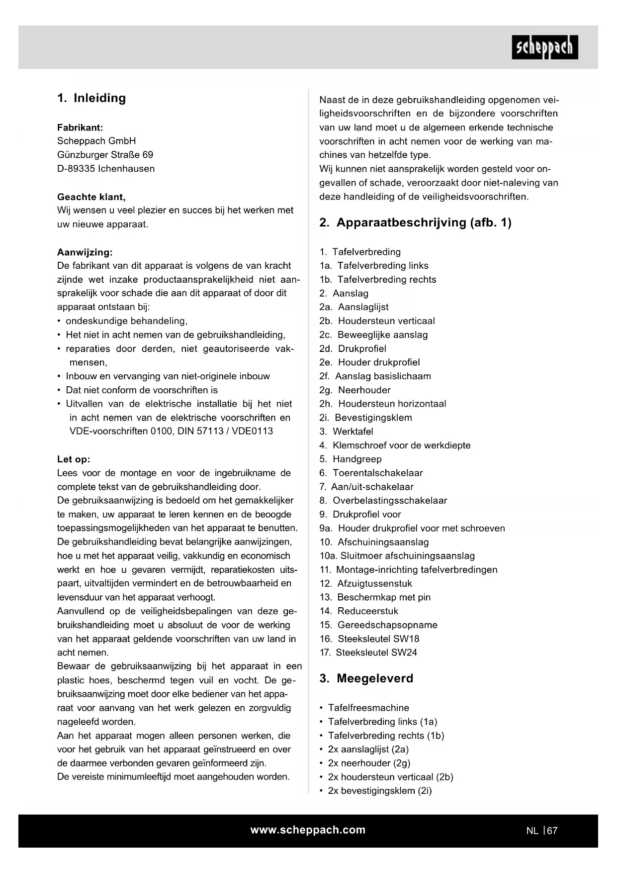 Fabrikant: Scheppach GmbH Günzburger Straße 69 D-89335 Ichenhausen Geachte klant, Wij wensen u veel plezier en succes bij het werken met uw nieuwe apparaat. Aanwijzing: De fabrikant van dit apparaat is volgens de van kracht zijnde wet inzake productaansprakelijkheid niet aan- sprakelijk voor schade die aan dit apparaat of door dit apparaat ontstaan bij: