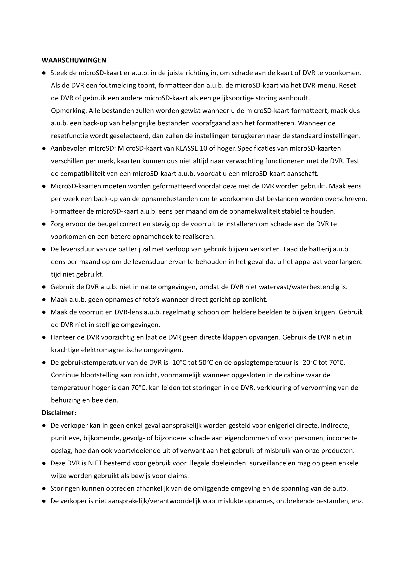 Manuale dell'utenteGebruikshandleidingWAARSCHUWINGEN ● Steek de microSD-kaart er a.u.b. in de juiste richting in, om schade aan de kaart of DVR te voorkomen. Als de DVR een foutmelding toont, formatteer dan a.u.b. de microSD-kaart via het DVR-menu. Reset de DVR of gebruik een andere microSD-kaart als een gelijksoortige storing aanhoudt. Opmerking: Alle bestanden zullen worden gewist wanneer u de microSD-kaart formatteert, maak dus a.u.b. een back-up van belangrijke bestanden voorafgaand aan het formatteren. Wanneer de resetfunctie wordt geselecteerd, dan zullen de instellingen terugkeren naar de standaard instellingen. ● Aanbevolen microSD: MicroSD-kaart van KLASSE 10 of hoger. Specificaties van microSD-kaarten verschillen per merk, kaarten kunnen dus niet altijd naar verwachting functioneren met de DVR. Test de compatibiliteit van een microSD-kaart a.u.b. voordat u een microSD-kaart aanschaft. ● MicroSD-kaarten moeten worden geformatteerd voordat deze met de DVR worden gebruikt. Maak eens per week een back-up van de opnamebestanden om te voorkomen dat bestanden worden overschreven. Formatteer de microSD-kaart a.u.b. eens per maand om de opnamekwaliteit stabiel te houden. ● Zorg ervoor de beugel correct en stevig op de voorruit te installeren om schade aan de DVR te voorkomen en een betere opnamehoek te realiseren. ● De levensduur van de batterij zal met verloop van gebruik blijven verkorten. Laad de batterij a.u.b. eens per maand op om de levensduur ervan te behouden in het geval dat u het apparaat voor langere tijd niet gebruikt. ● Gebruik de DVR a.u.b. niet in natte omgevingen, omdat de DVR niet watervast/waterbestendig is. ● Maak a.u.b. geen opnames of foto’s wanneer direct gericht op zonlicht. ● Maak de voorruit en DVR-lens a.u.b. regelmatig schoon om heldere beelden te blijven krijgen. Gebruik de DVR niet in stoffige omgevingen. ● Hanteer de DVR voorzichtig en laat de DVR geen directe klappen opvangen. Gebruik de DVR niet in krachtige elektromagnetische omgevingen. ● De gebruikstemperatuur van de DVR is -10°C tot 50°C en de opslagtemperatuur is -20°C tot 70°C. Continue blootstelling aan zonlicht, voornamelijk wanneer opgesloten in de cabine waar de temperatuur hoger is dan 70°C, kan leiden tot storingen in de DVR, verkleuring of vervorming van de behuizing en beelden. Disclaimer: ● De verkoper kan in geen enkel geval aansprakelijk worden gesteld voor enigerlei directe, indirecte, punitieve, bijkomende, gevolg- of bijzondere schade aan eigendommen of voor personen, incorrecte opslag, hoe dan ook voortvloeiende uit of verwant aan het gebruik of misbruik van onze producten. ● Deze DVR is NIET bestemd voor gebruik voor illegale doeleinden; surveillance en mag op geen enkele wijze worden gebruikt als bewijs voor claims. ● Storingen kunnen optreden afhankelijk van de omliggende omgeving en de spanning van de auto. ● De verkoper is niet aansprakelijk/verantwoordelijk voor mislukte opnames, ontbrekende bestanden, enz.1. Structuur