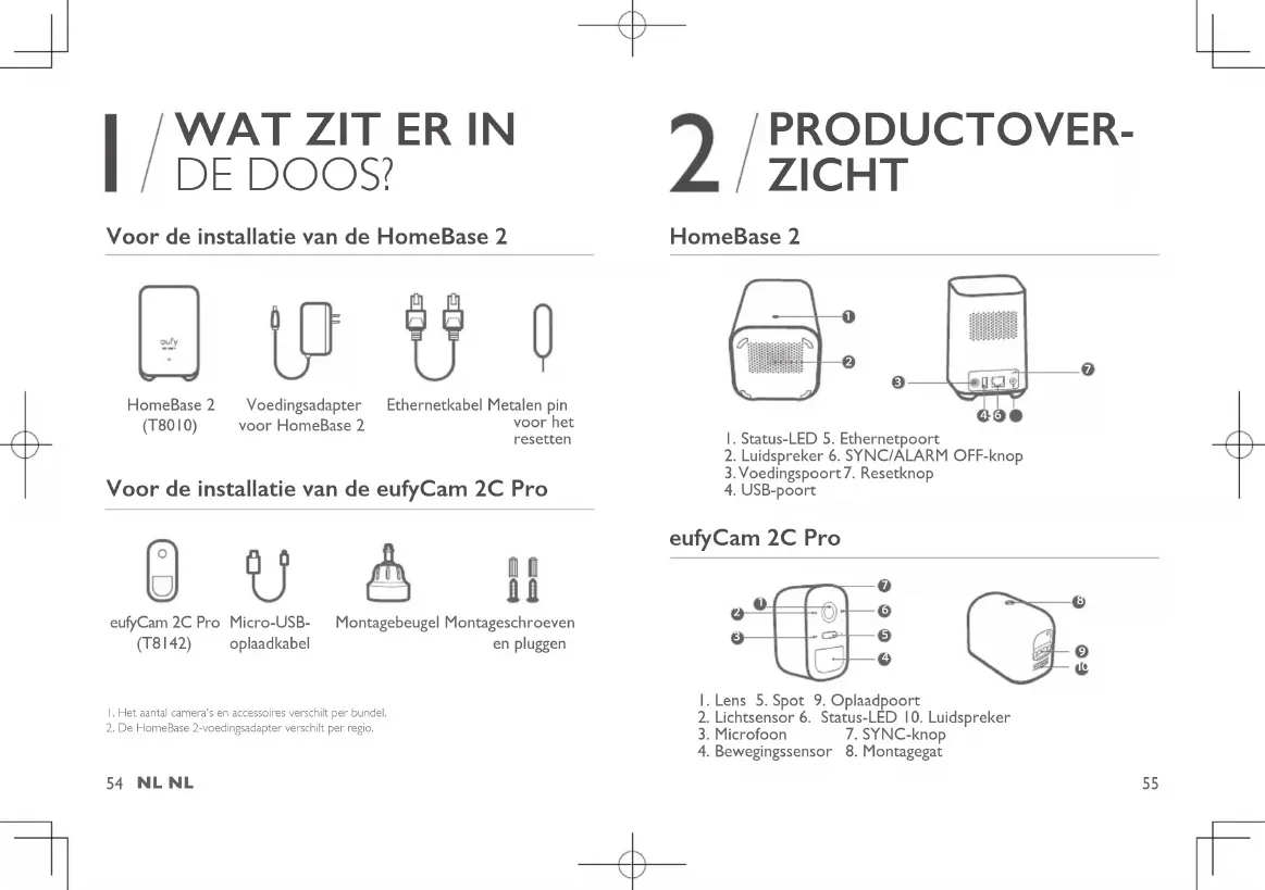 DE DOOS? Voor de installatie van de HomeBase 2 HomeBase 2 (T8010) Voedingsadapter voor HomeBase 2 Ethernetkabel Metalen pin voor het resetten Voor de installatie van de eufyCam 2C Pro eufyCam 2C Pro (T8142) Micro-USB- oplaadkabel Montagebeugel Montageschroeven en pluggen