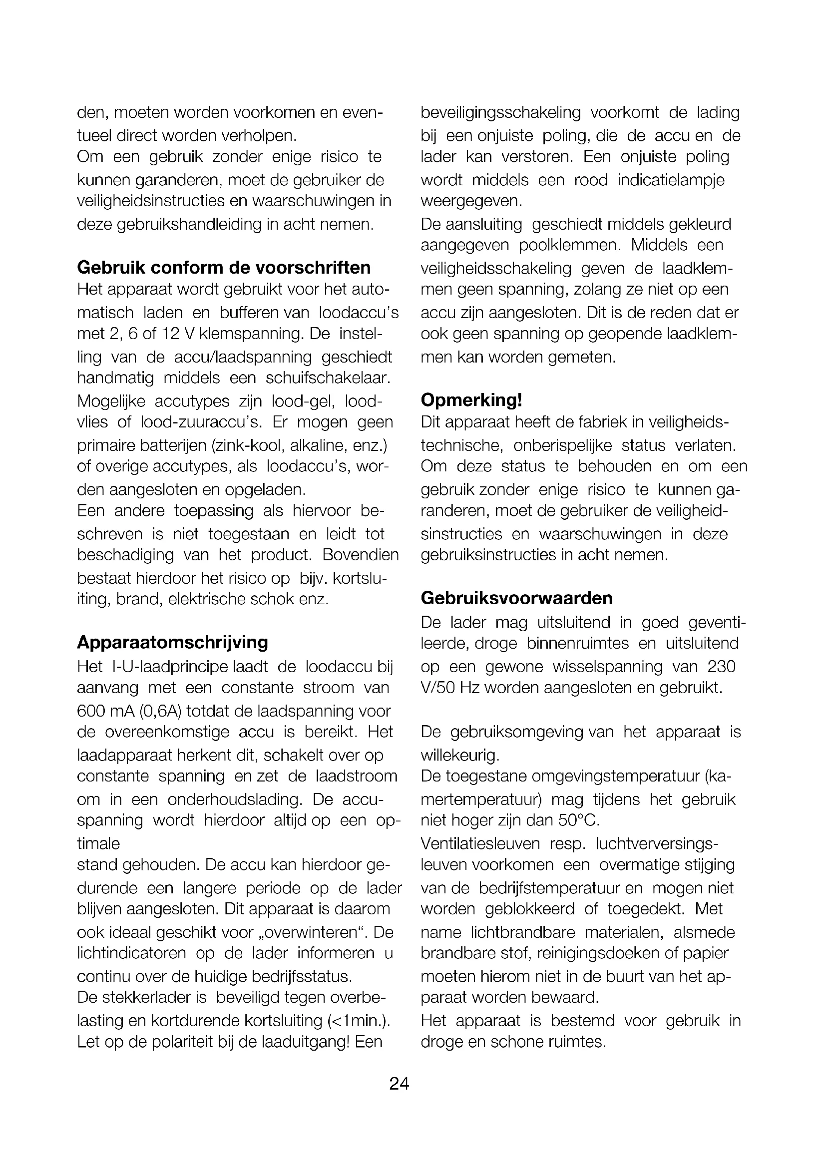 Automatische lader AL 600 compact Voordat u het apparaat gaat gebruiken, dient u de instructies van deze handleiding in acht te nemen. De overheid vereist dat wij u belangrijke instructies verstrekken betreffende uw veiligheid en u erop attent maken hoe u persoonlijk letsel, schade aan het apparaat en overige voorzieningen kunt voorkomen. Als u deze handleiding niet in acht neemt, kan de fabrikant niet aanspra- kelijk worden gesteld voor schade die ont- staat uit nalatigheid of opzettelijk handelen tegen de instructies in! Risico’s betreffende het gebruik van de lader De lader is conform de huidige stand van de techniek en de erkende veiligheidstech- nische richtlijnen vervaardigd. Desondanks bestaat bij onjuiste bediening of gebruik het risico op - persoonlijk letsel bij de gebruiker of der- den, - schade aan de lader en overige apparaten van de gebruiker. Alle personen, die met de ingebruikname, bediening, het onderhoud en de handha- ving van de lader hebben te maken, moe- ten overeenkomstig zijn gekwaliceerd of kennis hebben of verkrijgen betreffende het gebruik van laders en accu‘s en - deze gebruikshandleiding opvolgen. Sto- ringen die de veiligheid kunnen beïnvloe- NL24 den, moeten worden voorkomen en even- tueel direct worden verholpen. Om een gebruik zonder enige risico te kunnen garanderen, moet de gebruiker de veiligheidsinstructies en waarschuwingen in deze gebruikshandleiding in acht nemen. Gebruik conform de voorschriften Het apparaat wordt gebruikt voor het auto- matisch laden en bufferen van loodaccu’s met 2, 6 of 12 V klemspanning. De instel- ling van de accu/laadspanning geschiedt handmatig middels een schuifschakelaar. Mogelijke accutypes zijn lood-gel, lood- vlies of lood-zuuraccu’s. Er mogen geen primaire batterijen (zink-kool, alkaline, enz.) of overige accutypes, als loodaccu’s, wor- den aangesloten en opgeladen. Een andere toepassing als hiervoor be- schreven is niet toegestaan en leidt tot beschadiging van het product. Bovendien bestaat hierdoor het risico op bijv. kortslu- iting, brand, elektrische schok enz. Apparaatomschrijving Het I-U-laadprincipe laadt de loodaccu bij aanvang met een constante stroom van 600 mA (0,6A) totdat de laadspanning voor de overeenkomstige accu is bereikt. Het laadapparaat herkent dit, schakelt over op constante spanning en zet de laadstroom om in een onderhoudslading. De accu- spanning wordt hierdoor altijd op een op- timale stand gehouden. De accu kan hierdoor ge- durende een langere periode op de lader blijven aangesloten. Dit apparaat is daarom ook ideaal geschikt voor „overwinteren“. De lichtindicatoren op de lader informeren u continu over de huidige bedrijfsstatus. De stekkerlader is beveiligd tegen overbe- lasting en kortdurende kortsluiting (<1min.). Let op de polariteit bij de laaduitgang! Een beveiligingsschakeling voorkomt de lading bij een onjuiste poling, die de accu en de lader kan verstoren. Een onjuiste poling wordt middels een rood indicatielampje weergegeven. De aansluiting geschiedt middels gekleurd aangegeven poolklemmen. Middels een veiligheidsschakeling geven de laadklem- men geen spanning, zolang ze niet op een accu zijn aangesloten. Dit is de reden dat er ook geen spanning op geopende laadklem- men kan worden gemeten. Opmerking! Dit apparaat heeft de fabriek in veiligheids- technische, onberispelijke status verlaten. Om deze status te behouden en om een gebruik zonder enige risico te kunnen ga- randeren, moet de gebruiker de veiligheid- sinstructies en waarschuwingen in deze gebruiksinstructies in acht nemen. Gebruiksvoorwaarden De lader mag uitsluitend in goed geventi- leerde, droge binnenruimtes en uitsluitend op een gewone wisselspanning van 230 V/50 Hz worden aangesloten en gebruikt. De gebruiksomgeving van het apparaat is willekeurig. De toegestane omgevingstemperatuur (ka- mertemperatuur) mag tijdens het gebruik niet hoger zijn dan 50°C. Ventilatiesleuven resp. luchtverversings- leuven voorkomen een overmatige stijging van de bedrijfstemperatuur en mogen niet worden geblokkeerd of toegedekt. Met name lichtbrandbare materialen, alsmede brandbare stof, reinigingsdoeken of papier moeten hierom niet in de buurt van het ap- paraat worden bewaard. Het apparaat is bestemd voor gebruik in droge en schone ruimtes.25 Bij vorming van condenswater moet een acclimatiseringstijd worden gegeven van max. 2 uur. Het is niet toegestaan het apparaat in de open lucht resp. in vochtige ruimtes te ge- bruiken! Beveilig het apparaat tegen vochtig- heid, spattend water en blootstelling aan warmtebronnen! Met dit apparaat mogen uitsluitend 2-6-12 Volt loodaccumulatoren worden geladen!