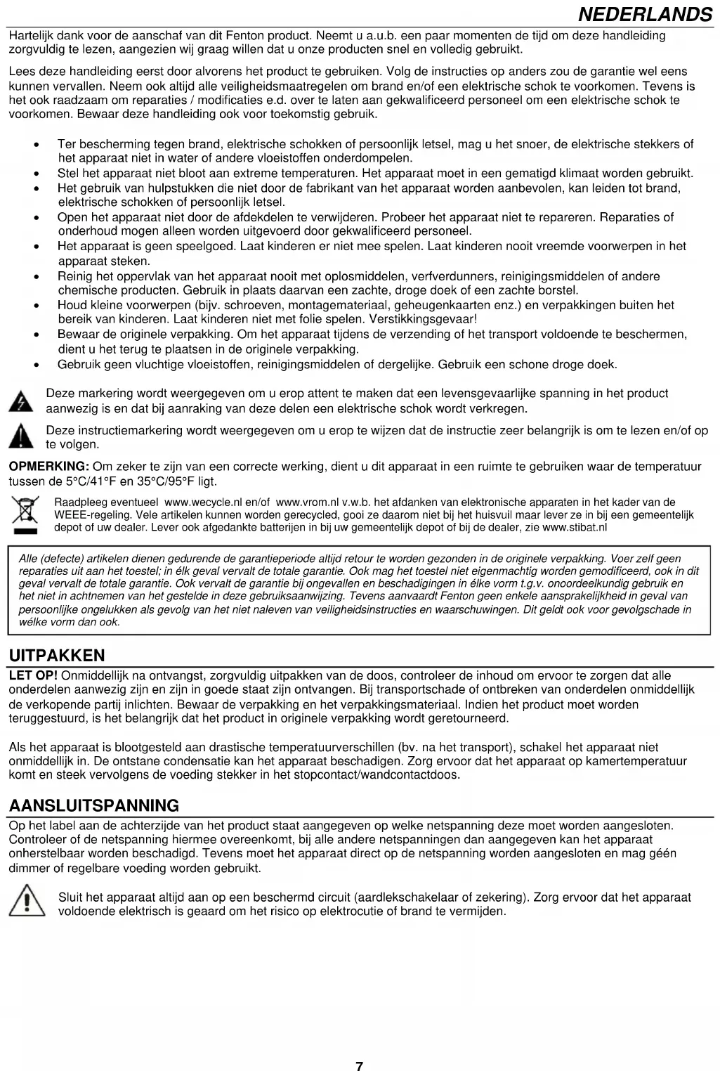 - Set Light Show control to “OFF” to turn LED show OFF.7 NEDERLANDS Hartelijk dank voor de aanschaf van dit Fenton product. Neemt u a.u.b. een paar momenten de tijd om deze handleiding zorgvuldig te lezen, aangezien wij graag willen dat u onze producten snel en volledig gebruikt. Lees deze handleiding eerst door alvorens het product te gebruiken. Volg de instructies op anders zou de garantie wel eens kunnen vervallen. Neem ook altijd alle veiligheidsmaatregelen om brand en/of een elektrische schok te voorkomen. Tevens is het ook raadzaam om reparaties / modificaties e.d. over te laten aan gekwalificeerd personeel om een elektrische schok te voorkomen. Bewaar deze handleiding ook voor toekomstig gebruik.