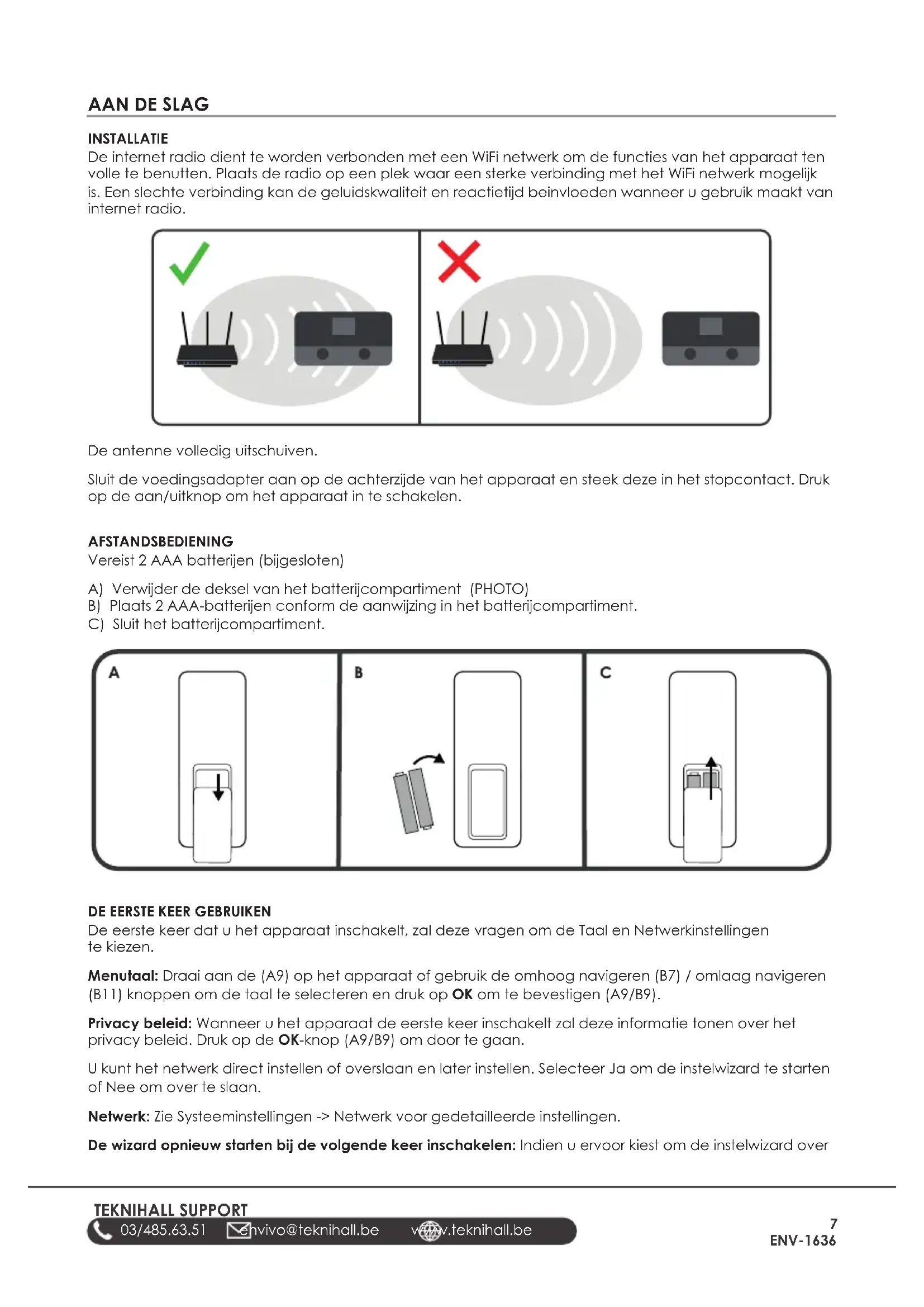 03/485.63.51 envivo@teknihall.be www.teknihall.be TEKNIHALL SUPPORT te slaan, kunt u ervoor kiezen de wizard de volgende keer dat u het apparaat inschakelt te starten. Datum en tijd: Selecteer “12” voor 12-urige schermweergave of “24” voor 24-urige schermweergave. Indien u kiest voor 12-urige weergave zal het scherm “AM” weergaven voor het middaguur en “PM” na het middaguur. Auto update: Selecteer de manier waarop de datum en tijd automatisch worden ingesteld uit de volgende opties: Update via DAB, Update via FM, Update via Netwerk of Geen update. Indien u “Update via Netwerk” selecteert dient u in het volgende scherm de tijdzone te kiezen. Indien u kiest voor “Geen update” dient u handmatig de datum en tijd te selecteren. Selecteer tijdzone: Selecteer uw huidige tijdzone. Zomertijd: Selecteer “AAN” voor zomertijd of “UIT” voor wintertijd. Verbonden blijven met netwerk: Selecteer Ja om verbonden te blijven met het geselecteerde netwerk. Zie de Systeeminstellingen -> Netwerk -> Netwerkwizard sectie voor instructies hoe te verbinden met uw draadloze router. OVERZICHT Het systeem AAN/UIT zetten: Druk op de knop (A5/B1). Selecteer modus: Druk op de MODE knop (A3/B2) en de geselecteerde modus zal worden weergegeven op het scherm. Het systeem zal na 3 seconden automatisch in de geselecteerde modus gaan. U kunt kiezen uit de volgende beschikbare modes: DAB+/FM/Bluetooth/Spotify/Internet radio/AUX Volume aanpassen: Draai aan de Volume knop (A5) op de internet radio. Druk op de (B17) / (B18) knoppen op de afstandsbediening om het volume te verhogen/verlagen. Het volumebereik is: 0 (min) – 30 (max). Equalizer instellingen: Druk op de EQ knop (B6) op de afstandsbediening om te wisselen tussen de verschillende equalizer instellingen. Kies uit: Rock, pop, jazz, klassiek en vlak (voor gesproken radio). INTERNET RADIO Vereist Wi-Fi Druk op de MODE knop en selecteer het Internet radio icoon; druk vervolgens op OK knop om naar Internet radio modus te gaan. Hier kunt u luisteren naar radiozenders van over de hele wereld. Gebruik de OK/SCAN knop op de internet radio of de / en OK knoppen op de afstandsbediening om door het menu te navigeren en radiozenders te selecteren. U kunt zoeken naar radiozenders in de volgende categorieën: Geschiedenis: een lijst met de laatst beluisterde zenders. Zoek: zoek op naam. Locatie: zoek op regio, land of staat. Populair: een selectie van de meest populaire radiozenders. Ontdek: selecteer herkomst, genre en taal om het type zender waar u in bent geïnteresseerd te vinden. Opmerking: Aanbod en categorieën kunnen van tijd tot tijd veranderen.ENV-1636