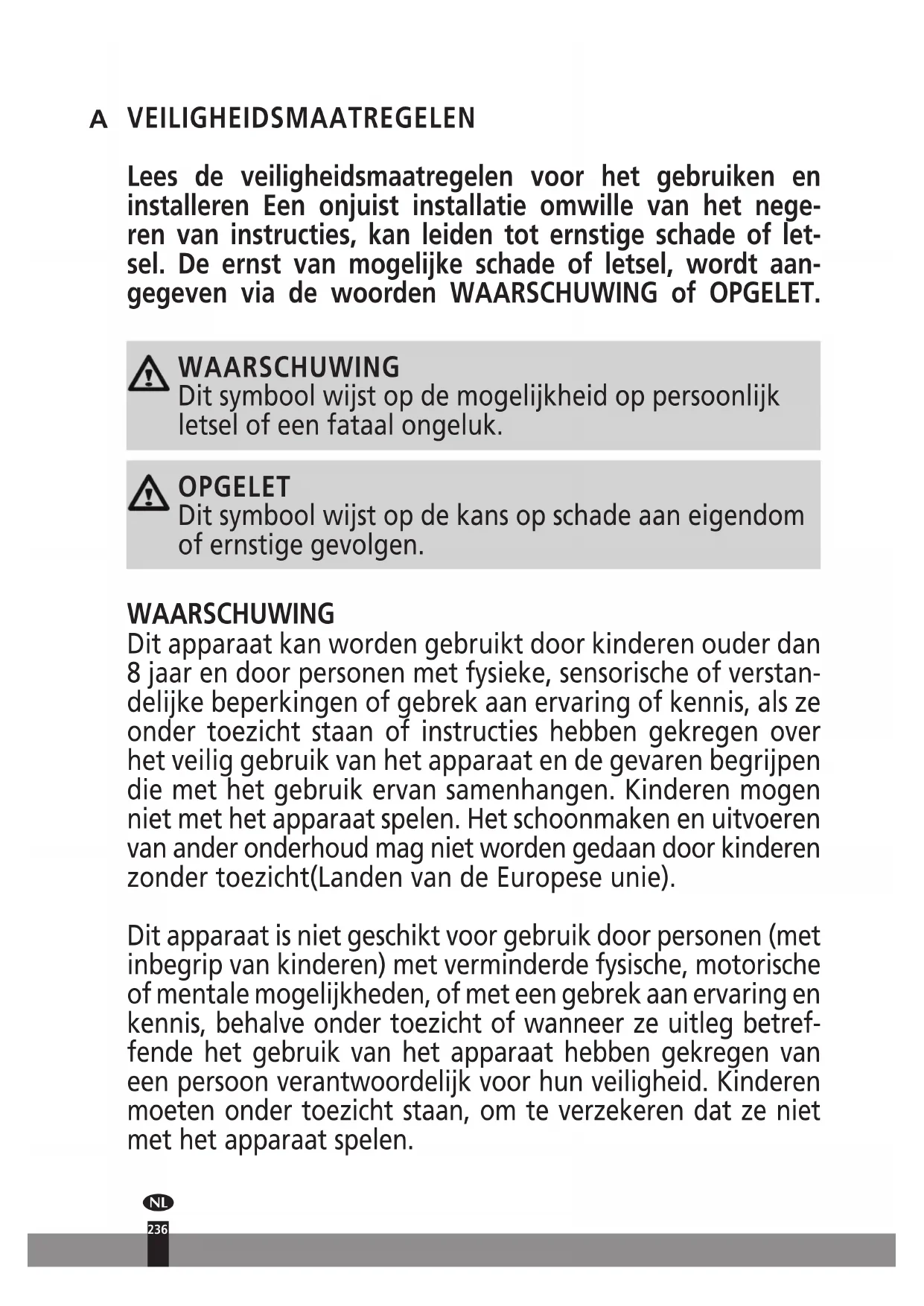 VEILIGHEIDSMAATREGELEN Lees de veiligheidsmaatregelen voor het gebruiken en installeren Een onjuist installatie omwille van het nege- ren van instructies, kan leiden tot ernstige schade of let- sel. De ernst van mogelijke schade of letsel, wordt aan- gegeven via de woorden WAARSCHUWING of OPGELET. WAARSCHUWING Dit symbool wijst op de mogelijkheid op persoonlijk letsel of een fataal ongeluk. OPGELET Dit symbool wijst op de kans op schade aan eigendom of ernstige gevolgen. WAARSCHUWING Dit apparaat kan worden gebruikt door kinderen ouder dan 8 jaar en door personen met fysieke, sensorische of verstan- delijke beperkingen of gebrek aan ervaring of kennis, als ze onder toezicht staan of instructies hebben gekregen over het veilig gebruik van het apparaat en de gevaren begrijpen die met het gebruik ervan samenhangen. Kinderen mogen niet met het apparaat spelen. Het schoonmaken en uitvoeren van ander onderhoud mag niet worden gedaan door kinderen zonder toezicht(Landen van de Europese unie). Dit apparaat is niet geschikt voor gebruik door personen (met inbegrip van kinderen) met verminderde fysische, motorische of mentale mogelijkheden, of met een gebrek aan ervaring en kennis, behalve onder toezicht of wanneer ze uitleg betref- fende het gebruik van het apparaat hebben gekregen van een persoon verantwoordelijk voor hun veiligheid. Kinderen moeten onder toezicht staan, om te verzekeren dat ze niet met het apparaat spelen.1