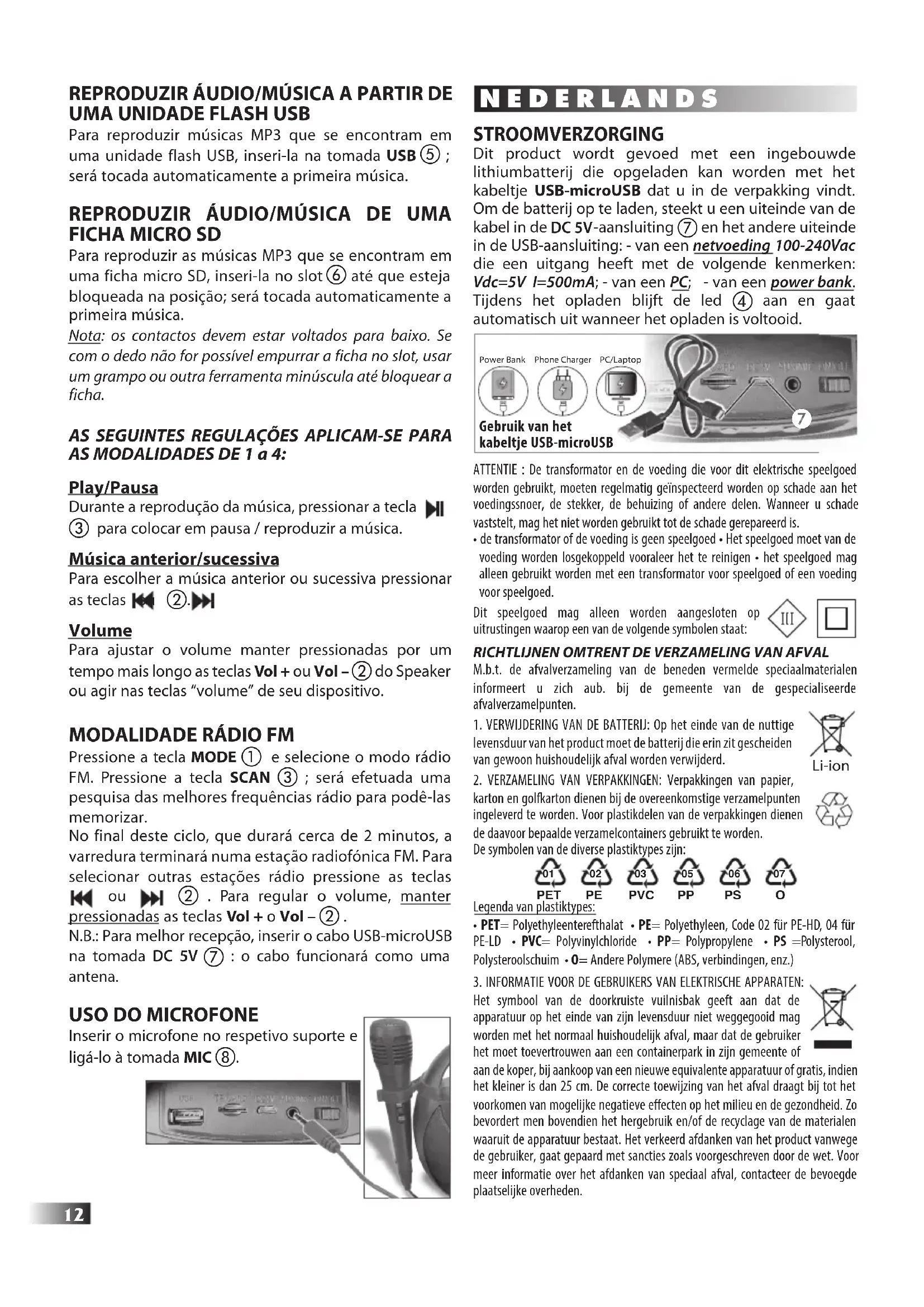 - PET= Polyethyleenterefthalat • PE= Polyethyleen, Code 02 für PE-HD, 04 für PE-LD • PVC= Polyvinylchloride • PP= Polypropylene • PS =Polysterool, Polysteroolschuim • O= Andere Polymere (ABS, verbindingen, enz.)3. INFORMATIE VOOR DE GEBRUIKERS VAN ELEKTRISCHE APPARATEN: Het symbool van de doorkruiste vuilnisbak geeft aan dat de apparatuur op het einde van zijn levensduur niet weggegooid mag worden met het normaal huishoudelijk afval, maar dat de gebruiker het moet toevertrouwen aan een containerpark in zijn gemeente of aan de koper, bij aankoop van een nieuwe equivalente apparatuur of gratis, indien het kleiner is dan 25 cm. De correcte toewijzing van het afval draagt bij tot het voorkomen van mogelijke negatieve effecten op het milieu en de gezondheid. Zo bevordert men bovendien het hergebruik en/of de recyclage van de materialen waaruit de apparatuur bestaat. Het verkeerd afdanken van het product vanwege de gebruiker, gaat gepaard met sancties zoals voorgeschreven door de wet. Voor meer informatie over het afdanken van speciaal afval, contacteer de bevoegde plaatselijke overheden. REPRODUZIR ÁUDIO/MÚSICA A PARTIR DE