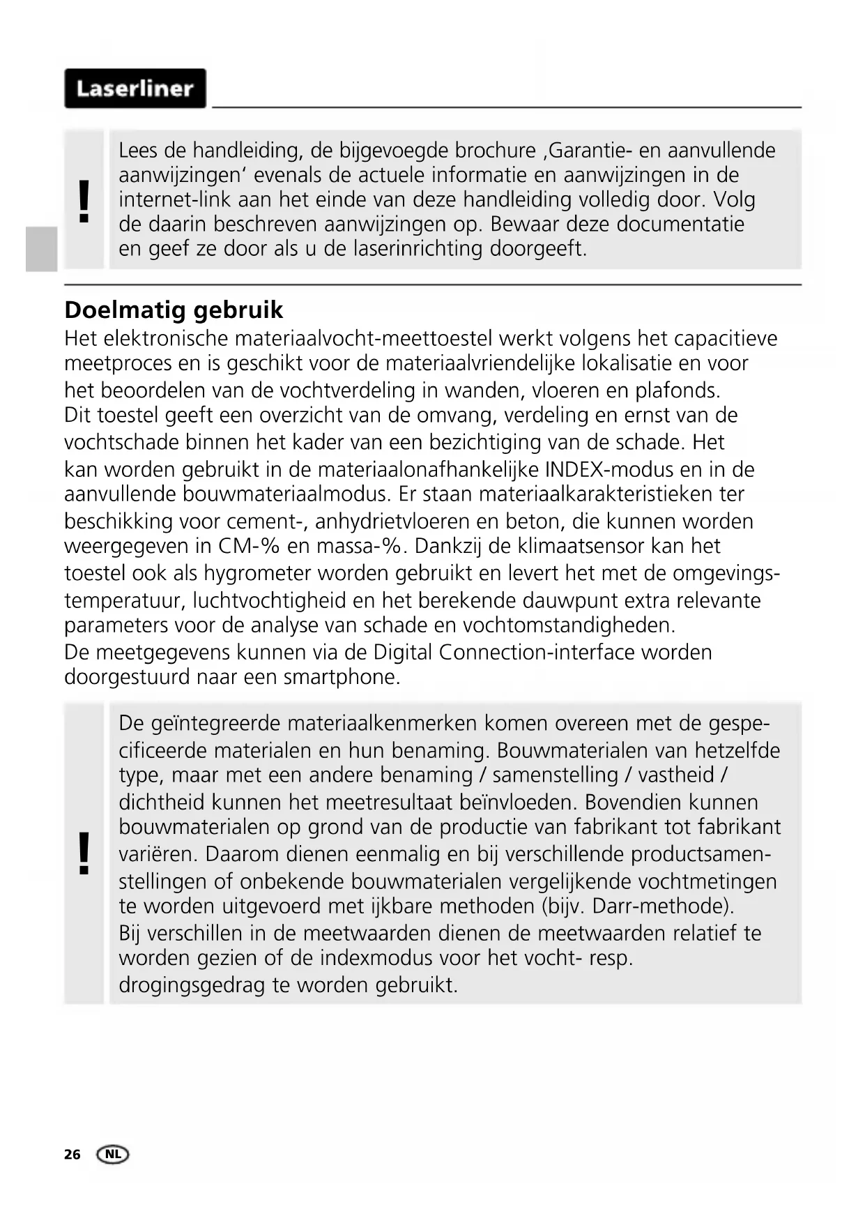 Power supply 3 x 1.5V LR03 (AAA) Chemical system Alkaline Operating time approx. 55 hours Operating conditions 0°C … 50°C, max. humidity 20 … 85% rH, no condensation, max. working altitude 2000 m above sea level Storage conditions -10°C … 60°C, max. humidity 85% rH, no condensation Radio module operating data IEEE 802.15.4. LE ≥ 5.x (Digital Connection) interface; Frequency band: ISM band 2400–2483.5 MHz, 40 channels; Transmit power: max. 0.8 mW; Bandwidth: 1.5 MHz; Bit rate: 1 Mbit/s; Modulation: GFSK Unit of measurement % rM (relative material moisture) °C (Celsius) % rH (relative humidity) Dimensions (W x H x D) 65 mm x 227 mm x 29 mm Weight 228 g (incl. batteries) EN26 Doelmatig gebruik Het elektronische materiaalvocht-meettoestel werkt volgens het capacitieve meetproces en is geschikt voor de materiaalvriendelke lokalisatie en voor het beoordelen van de vochtverdeling in wanden, vloeren en plafonds. Dit toestel geeft een overzicht van de omvang, verdeling en ernst van de vochtschade binnen het kader van een bezichtiging van de schade. Het kan worden gebruikt in de materiaalonafhankelke INDEX-modus en in de aanvullende bouwmateriaalmodus. Er staan materiaalkarakteristieken ter beschikking voor cement-, anhydrietvloeren en beton, die kunnen worden weergegeven in CM-% en massa-%. Dankz de klimaatsensor kan het toestel ook als hygrometer worden gebruikt en levert het met de omgevings- temperatuur, luchtvochtigheid en het berekende dauwpunt extra relevante parameters voor de analyse van schade en vochtomstandigheden. De meetgegevens kunnen via de Digital Connection-interface worden doorgestuurd naar een smartphone. De geïntegreerde materiaalkenmerken komen overeen met de gespe- cificeerde materialen en hun benaming. Bouwmaterialen van hetzelfde type, maar met een andere benaming / samenstelling / vastheid / dichtheid kunnen het meetresultaat beïnvloeden. Bovendien kunnen bouwmaterialen op grond van de productie van fabrikant tot fabrikant variëren. Daarom dienen eenmalig en bij verschillende productsamen- stellingen of onbekende bouwmaterialen vergelijkende vochtmetingen te worden uitgevoerd met ijkbare methoden (bijv. Darr-methode). Bij verschillen in de meetwaarden dienen de meetwaarden relatief te worden gezien of de indexmodus voor het vocht- resp. drogingsgedrag te worden gebruikt.