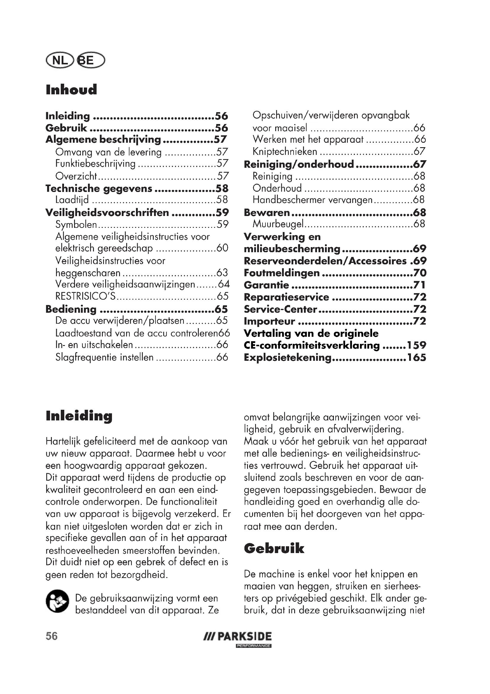 uitdrukkelkwordtvermeld,kanschade aan de machine veroorzaken en een ern- stig gevaar voor de gebruiker betekenen. Ditapparaatisnietgeschiktvoorcommerci- eelgebruik.Bcommercieelgebruikvervalt degarantie.Hetapparaatisbedoeldvoor gebruik door volwassenen. Jongeren boven 16jaarmogenhetapparaatenkelonder toezicht gebruiken. Gebruik de heggenschaar niet als het regent of als de heg nat is. De gebruiker is voor ongevallen of schade aanderdenaansprakelk. Deproducentisnietverantwoordelkvoor beschadigingen, die door onrechtmatig gebruik of verkeerde bediening worden veroorzaakt. Hetapparaatmaaktdeeluitvandereeks ParksideX20VTeam.Hetapparaatmoet wordengebruiktmetdeaccu’svande seriePARKSIDEX20VTeam. Gebruik de machine niet als het messtompis.Starkversietemes- balk kann schade aan de machine veroorzaken.Mesbalkregelmatig latenslpen. Algemenebeschrving De afbeeldingen kunt u vinden opdevoorsteuitklappagina. Omvangvandelevering Pakhetapparaatuitencontroleer,ofde inhoud volledig is. Zorgvooreenreglementairvoorgeschre- venafvalverwderingvanhetverpakkings- materiaal. - Heggenschaarmetaccu - Mesbescherming - Opvangbakvoormaaisel - Gebruiksaanwzing De opvangbak voor maaisel wordt bij de levering in het karton met de zwaardkoker gestoken De accu en de lader zn niet mee- geleverd! Funktiebeschrving Deaccu-heggenschaarbezitalssnoei-inrich- tingeenLaser-Cutmesvanspeciaalstaal. Tdenshetsnoeienbewegendesnoeitanden zich lineair heen en weer. De stootbescher- ming aan het uiteinde van de maaibalk voorkomteenonaangenameterugslagb het raken van wanden, omheiningen, enz. Ter bescherming van de gebruiker bezit het apparaateenveiligheidsschakelaarvoor beidehandeneneensnelstop-remfunctie. Aanvullend beschermt de handbescherming tegentakkenentwgjes. Deopvangbakvoormaaiselverwijdert het snoeisel van de haag tijdens het hori- zontaal snoeien. Voor de functie van de bedieningsonder- delenverwzenwnaardehiernavol- gendebeschrvingen. Overzicht 1 Stootbescherming 2 Veiligheidsmaaibalk 3 Handbescherming 4 Voorstehandgreep 5 Ventilatiesleuven 6 Bedieningselement 7 Schakelaar“Aan/uit” 8 Achterstehandgreep 9 Mesbescherming 10 Opvangbakvoormaaisel 11 Laadstatusindicator 12 Knopvoorlaadindicator 13 Knopvoordeinstellingvande snijsnelheidNL BE