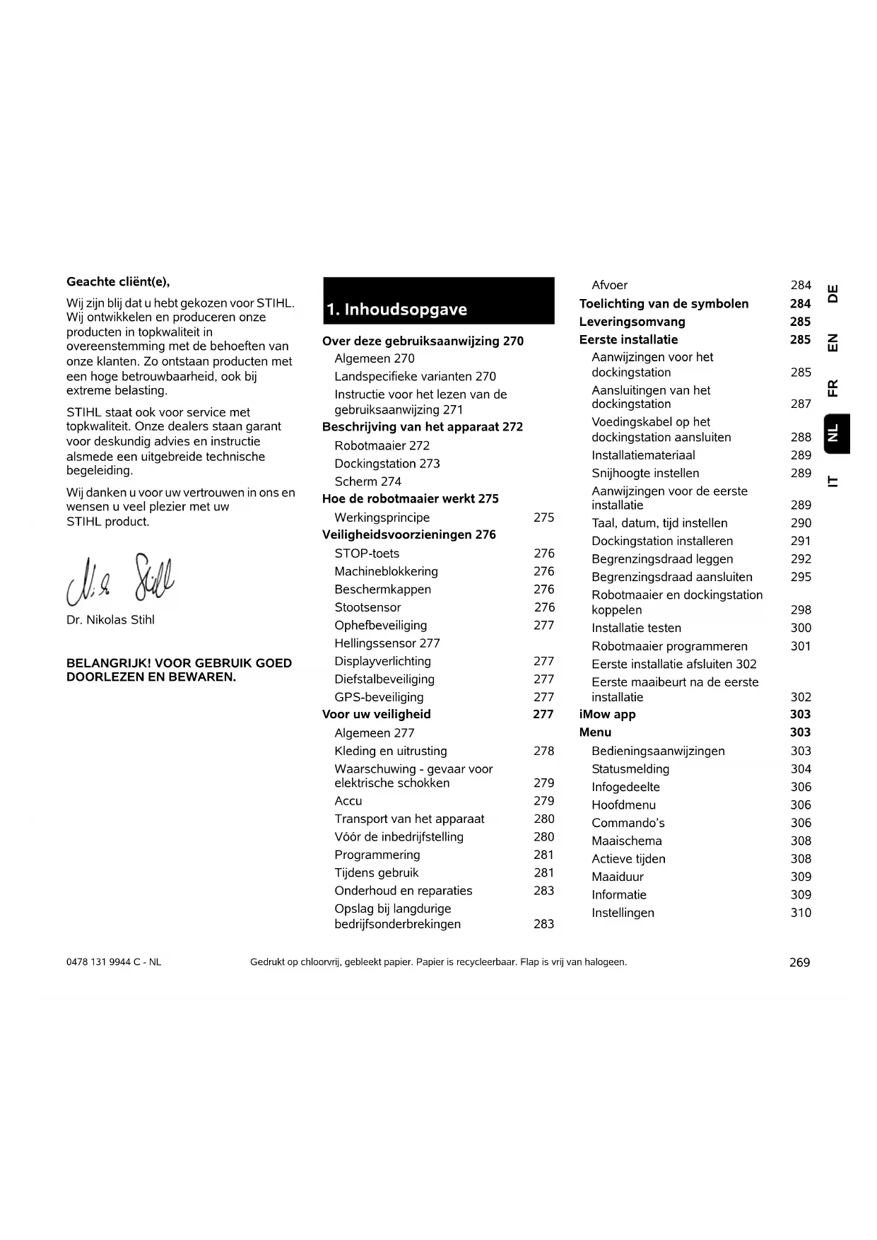 Over deze gebruiksaanwijzing 270 Algemeen 270 Landspecifieke varianten 270 Instructie voor het lezen van de gebruiksaanwijzing 271 Beschrijving van het apparaat 272 Robotmaaier 272 Dockingstation 273 Scherm 274 Hoe de robotmaaier werkt 275 Werkingsprincipe 275 Veiligheidsvoorzieningen 276 STOP-toets 276 Machineblokkering 276 Beschermkappen 276 Stootsensor 276 Ophefbeveiliging 277 Hellingssensor 277 Displayverlichting 277 Diefstalbeveiliging 277 GPS-beveiliging 277 Voor uw veiligheid 277 Algemeen 277 Kleding en uitrusting 278 Waarschuwing - gevaar voor elektrische schokken 279 Accu 279 Transport van het apparaat 280 Vóór de inbedrijfstelling 280 Programmering 281 Tijdens gebruik 281 Onderhoud en reparaties 283 Opslag bij langdurige bedrijfsonderbrekingen 283 Afvoer 284 Toelichting van de symbolen 284 Leveringsomvang 285 Eerste installatie 285 Aanwijzingen voor het dockingstation 285 Aansluitingen van het dockingstation 287 Voedingskabel op het dockingstation aansluiten 288 Installatiemateriaal 289 Snijhoogte instellen 289 Aanwijzingen voor de eerste installatie 289 Taal, datum, tijd instellen 290 Dockingstation installeren 291 Begrenzingsdraad leggen 292 Begrenzingsdraad aansluiten 295 Robotmaaier en dockingstation koppelen 298 Installatie testen 300 Robotmaaier programmeren 301 Eerste installatie afsluiten 302 Eerste maaibeurt na de eerste installatie 302 iMow app 303 Menu 303 Bedieningsaanwijzingen 303 Statusmelding 304 Infogedeelte 306 Hoofdmenu 306 Commando’s 306 Maaischema 308 Actieve tijden 308 Maaiduur 309 Informatie 309 Instellingen 3100478 131 9944 C - NL