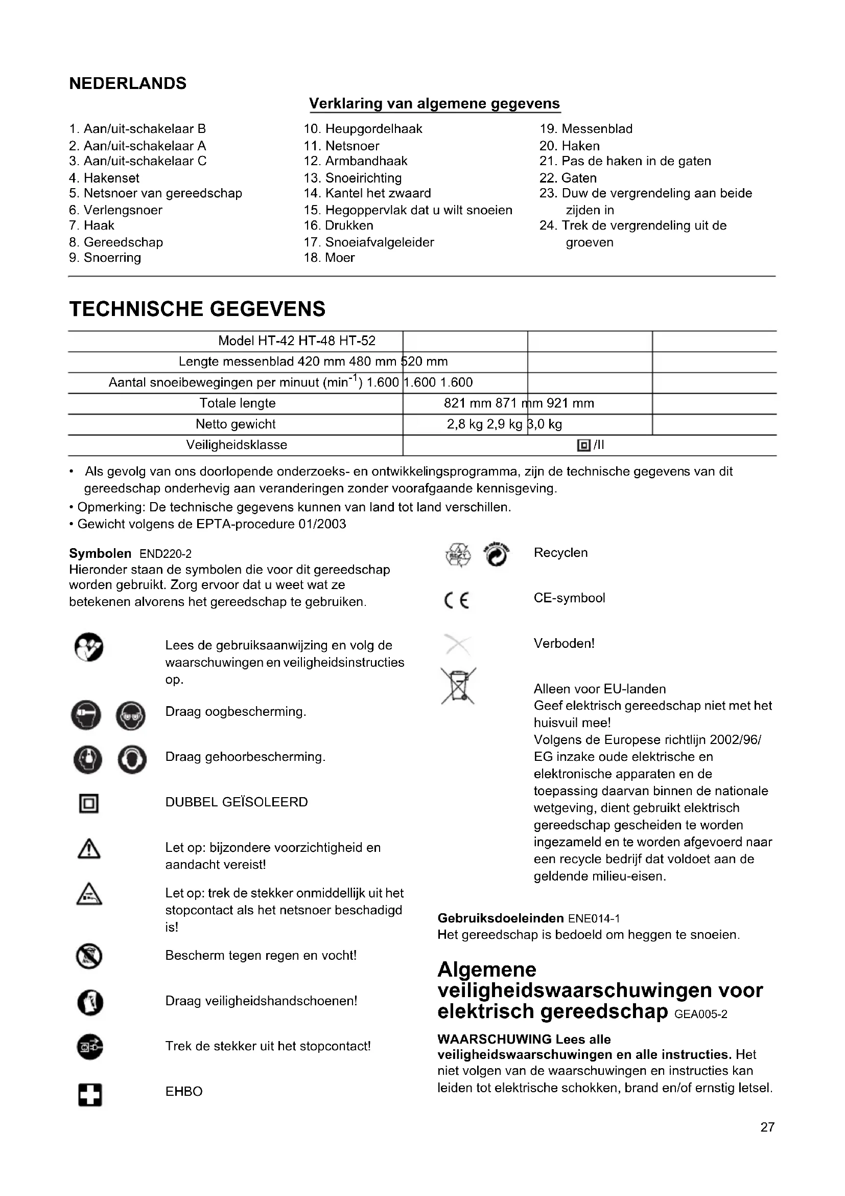 Let op: bijzondere voorzichtigheid en aandacht vereist! Let op: trek de stekker onmiddellijk uit het stopcontact als het netsnoer beschadigd is! Bescherm tegen regen en vocht! Draag veiligheidshandschoenen! Trek de stekker uit het stopcontact! EHBO Recyclen CE-symbool Verboden! Alleen voor EU-landen Geef elektrisch gereedschap niet met het huisvuil mee! Volgens de Europese richtlijn 2002/96/ EG inzake oude elektrische en elektronische apparaten en de toepassing daarvan binnen de nationale wetgeving, dient gebruikt elektrisch gereedschap gescheiden te worden ingezameld en te worden afgevoerd naar een recycle bedrijf dat voldoet aan de geldende milieu-eisen. Gebruiksdoeleinden ENE014-1 Het gereedschap is bedoeld om heggen te snoeien. Algemene veiligheidswaarschuwingen voor elektrisch gereedschap GEA005-2 WAARSCHUWING Lees alle veiligheidswaarschuwingen en alle instructies. Het niet volgen van de waarschuwingen en instructies kan leiden tot elektrische schokken, brand en/of ernstig letsel.