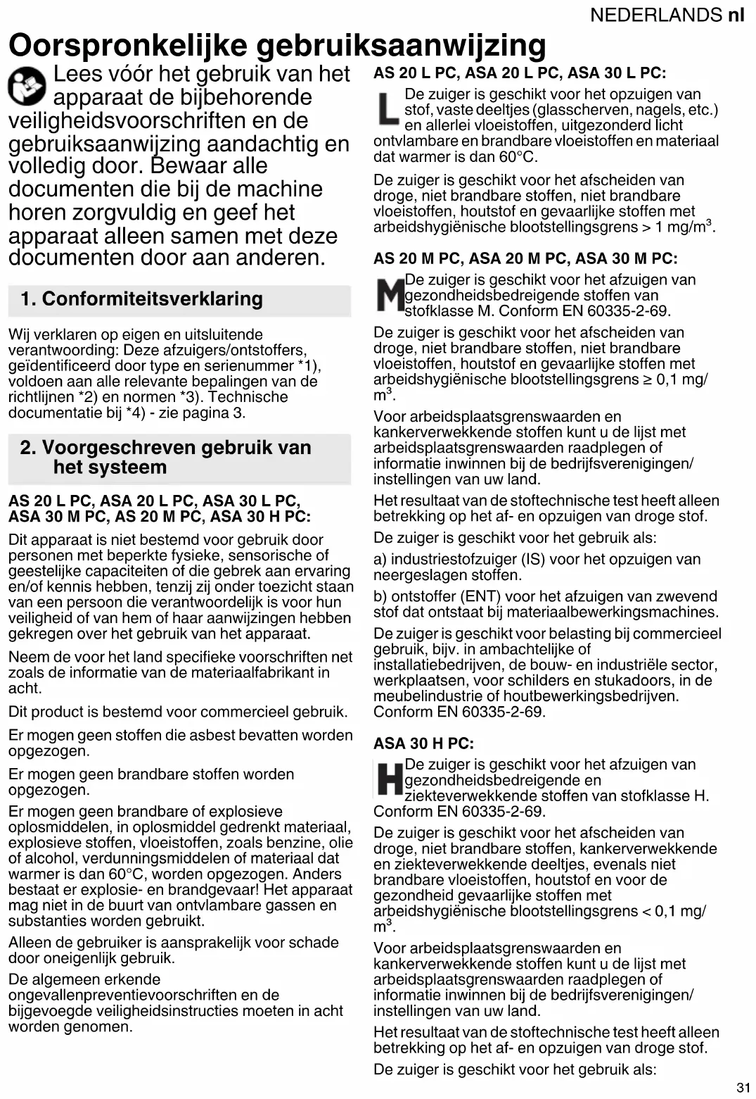 Oorspronkelijke gebruiksaanwijzing Lees vóór het gebruik van het apparaat de bijbehorende veiligheidsvoorschriften en de gebruiksaanwijzing aandachtig en volledig door. Bewaar alle documenten die bij de machine horen zorgvuldig en geef het apparaat alleen samen met deze documenten door aan anderen. Wij verklaren op eigen en uitsluitende verantwoording: Deze afzuigers/ontstoffers, geïdentificeerd door type en serienummer *1), voldoen aan alle relevante bepalingen van de richtlijnen *2) en normen *3). Technische documentatie bij *4) - zie pagina 3. AS 20 L PC, ASA 20 L PC, ASA 30 L PC, ASA 30 M PC, AS 20 M PC, ASA 30 H PC: Dit apparaat is niet bestemd voor gebruik door personen met beperkte fysieke, sensorische of geestelijke capaciteiten of die gebrek aan ervaring en/of kennis hebben, tenzij zij onder toezicht staan van een persoon die verantwoordelijk is voor hun veiligheid of van hem of haar aanwijzingen hebben gekregen over het gebruik van het apparaat. Neem de voor het land specifieke voorschriften net zoals de informatie van de materiaalfabrikant in acht. Dit product is bestemd voor commercieel gebruik. Er mogen geen stoffen die asbest bevatten worden opgezogen. Er mogen geen brandbare stoffen worden opgezogen. Er mogen geen brandbare of explosieve oplosmiddelen, in oplosmiddel gedrenkt materiaal, explosieve stoffen, vloeistoffen, zoals benzine, olie of alcohol, verdunningsmiddelen of materiaal dat warmer is dan 60°C, worden opgezogen. Anders bestaat er explosie- en brandgevaar! Het apparaat mag niet in de buurt van ontvlambare gassen en substanties worden gebruikt. Alleen de gebruiker is aansprakelijk voor schade door oneigenlijk gebruik. De algemeen erkende ongevallenpreventievoorschriften en de bijgevoegde veiligheidsinstructies moeten in acht worden genomen. AS 20 L PC, ASA 20 L PC, ASA 30 L PC: De zuiger is geschikt voor het opzuigen van stof, vaste deeltjes (glasscherven, nagels, etc.) en allerlei vloeistoffen, uitgezonderd licht ontvlambare en brandbare vloeistoffen en materiaal dat warmer is dan 60°C. De zuiger is geschikt voor het afscheiden van droge, niet brandbare stoffen, niet brandbare vloeistoffen, houtstof en gevaarlijke stoffen met arbeidshygiënische blootstellingsgrens > 1 mg/m³. AS 20 M PC, ASA 20 M PC, ASA 30 M PC: De zuiger is geschikt voor het afzuigen van gezondheidsbedreigende stoffen van stofklasse M. Conform EN 60335-2-69. De zuiger is geschikt voor het afscheiden van droge, niet brandbare stoffen, niet brandbare vloeistoffen, houtstof en gevaarlijke stoffen met arbeidshygiënische blootstellingsgrens ≥ 0,1 mg/ m³. Voor arbeidsplaatsgrenswaarden en kankerverwekkende stoffen kunt u de lijst met arbeidsplaatsgrenswaarden raadplegen of informatie inwinnen bij de bedrijfsverenigingen/ instellingen van uw land. Het resultaat van de stoftechnische test heeft alleen betrekking op het af- en opzuigen van droge stof. De zuiger is geschikt voor het gebruik als: a) industriestofzuiger (IS) voor het opzuigen van neergeslagen stoffen. b) ontstoffer (ENT) voor het afzuigen van zwevend stof dat ontstaat bij materiaalbewerkingsmachines. De zuiger is geschikt voor belasting bij commercieel gebruik, bijv. in ambachtelijke of installatiebedrijven, de bouw- en industriële sector, werkplaatsen, voor schilders en stukadoors, in de meubelindustrie of houtbewerkingsbedrijven. Conform EN 60335-2-69. ASA 30 H PC: De zuiger is geschikt voor het afzuigen van gezondheidsbedreigende en ziekteverwekkende stoffen van stofklasse H. Conform EN 60335-2-69. De zuiger is geschikt voor het afscheiden van droge, niet brandbare stoffen, kankerverwekkende en ziekteverwekkende deeltjes, evenals niet brandbare vloeistoffen, houtstof en voor de gezondheid gevaarlijke stoffen met arbeidshygiënische blootstellingsgrens < 0,1 mg/ m³. Voor arbeidsplaatsgrenswaarden en kankerverwekkende stoffen kunt u de lijst met arbeidsplaatsgrenswaarden raadplegen of informatie inwinnen bij de bedrijfsverenigingen/ instellingen van uw land. Het resultaat van de stoftechnische test heeft alleen betrekking op het af- en opzuigen van droge stof. De zuiger is geschikt voor het gebruik als: