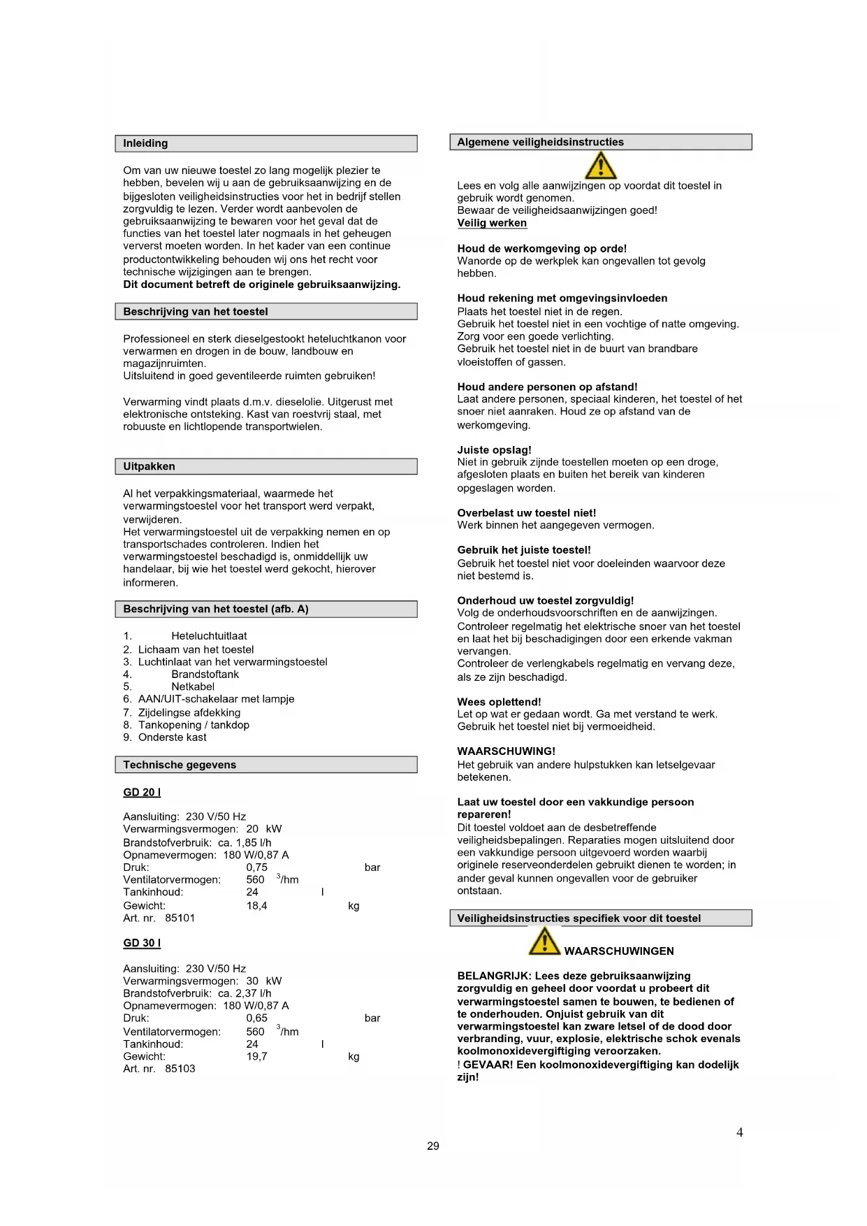 Tankinhoud: 24 l Gewicht: 18,4 kg Art. nr. 85101 GD 30 l Aansluiting: 230 V/50 Hz Verwarmingsvermogen: 30 kW Brandstofverbruik: ca. 2,37 l/h Opnamevermogen: 180 W/0,87 A Druk: 0,65 bar Ventilatorvermogen: 560 m