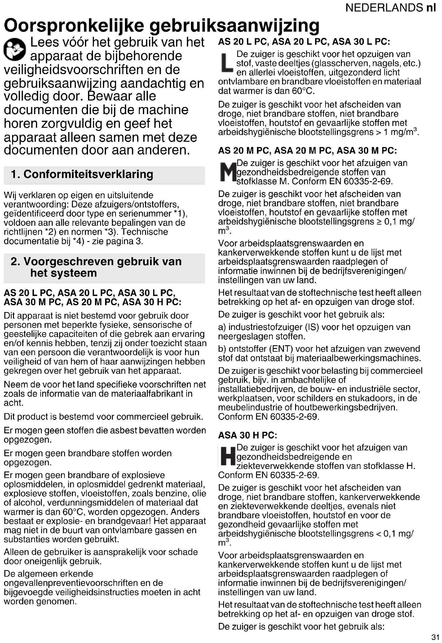 Oorspronkelijke gebruiksaanwijzing Lees vóór het gebruik van het apparaat de bijbehorende veiligheidsvoorschriften en de gebruiksaanwijzing aandachtig en volledig door. Bewaar alle documenten die bij de machine horen zorgvuldig en geef het apparaat alleen samen met deze documenten door aan anderen. Wij verklaren op eigen en uitsluitende verantwoording: Deze afzuigers/ontstoffers, geïdentificeerd door type en serienummer *1), voldoen aan alle relevante bepalingen van de richtlijnen *2) en normen *3). Technische documentatie bij *4) - zie pagina 3. AS 20 L PC, ASA 20 L PC, ASA 30 L PC, ASA 30 M PC, AS 20 M PC, ASA 30 H PC: Dit apparaat is niet bestemd voor gebruik door personen met beperkte fysieke, sensorische of geestelijke capaciteiten of die gebrek aan ervaring en/of kennis hebben, tenzij zij onder toezicht staan van een persoon die verantwoordelijk is voor hun veiligheid of van hem of haar aanwijzingen hebben gekregen over het gebruik van het apparaat. Neem de voor het land specifieke voorschriften net zoals de informatie van de materiaalfabrikant in acht. Dit product is bestemd voor commercieel gebruik. Er mogen geen stoffen die asbest bevatten worden opgezogen. Er mogen geen brandbare stoffen worden opgezogen. Er mogen geen brandbare of explosieve oplosmiddelen, in oplosmiddel gedrenkt materiaal, explosieve stoffen, vloeistoffen, zoals benzine, olie of alcohol, verdunningsmiddelen of materiaal dat warmer is dan 60°C, worden opgezogen. Anders bestaat er explosie- en brandgevaar! Het apparaat mag niet in de buurt van ontvlambare gassen en substanties worden gebruikt. Alleen de gebruiker is aansprakelijk voor schade door oneigenlijk gebruik. De algemeen erkende ongevallenpreventievoorschriften en de bijgevoegde veiligheidsinstructies moeten in acht worden genomen. AS 20 L PC, ASA 20 L PC, ASA 30 L PC: De zuiger is geschikt voor het opzuigen van stof, vaste deeltjes (glasscherven, nagels, etc.) en allerlei vloeistoffen, uitgezonderd licht ontvlambare en brandbare vloeistoffen en materiaal dat warmer is dan 60°C. De zuiger is geschikt voor het afscheiden van droge, niet brandbare stoffen, niet brandbare vloeistoffen, houtstof en gevaarlijke stoffen met arbeidshygiënische blootstellingsgrens > 1 mg/m³. AS 20 M PC, ASA 20 M PC, ASA 30 M PC: De zuiger is geschikt voor het afzuigen van gezondheidsbedreigende stoffen van stofklasse M. Conform EN 60335-2-69. De zuiger is geschikt voor het afscheiden van droge, niet brandbare stoffen, niet brandbare vloeistoffen, houtstof en gevaarlijke stoffen met arbeidshygiënische blootstellingsgrens ≥ 0,1 mg/ m³. Voor arbeidsplaatsgrenswaarden en kankerverwekkende stoffen kunt u de lijst met arbeidsplaatsgrenswaarden raadplegen of informatie inwinnen bij de bedrijfsverenigingen/ instellingen van uw land. Het resultaat van de stoftechnische test heeft alleen betrekking op het af- en opzuigen van droge stof. De zuiger is geschikt voor het gebruik als: a) industriestofzuiger (IS) voor het opzuigen van neergeslagen stoffen. b) ontstoffer (ENT) voor het afzuigen van zwevend stof dat ontstaat bij materiaalbewerkingsmachines. De zuiger is geschikt voor belasting bij commercieel gebruik, bijv. in ambachtelijke of installatiebedrijven, de bouw- en industriële sector, werkplaatsen, voor schilders en stukadoors, in de meubelindustrie of houtbewerkingsbedrijven. Conform EN 60335-2-69. ASA 30 H PC: De zuiger is geschikt voor het afzuigen van gezondheidsbedreigende en ziekteverwekkende stoffen van stofklasse H. Conform EN 60335-2-69. De zuiger is geschikt voor het afscheiden van droge, niet brandbare stoffen, kankerverwekkende en ziekteverwekkende deeltjes, evenals niet brandbare vloeistoffen, houtstof en voor de gezondheid gevaarlijke stoffen met arbeidshygiënische blootstellingsgrens < 0,1 mg/ m³. Voor arbeidsplaatsgrenswaarden en kankerverwekkende stoffen kunt u de lijst met arbeidsplaatsgrenswaarden raadplegen of informatie inwinnen bij de bedrijfsverenigingen/ instellingen van uw land. Het resultaat van de stoftechnische test heeft alleen betrekking op het af- en opzuigen van droge stof. De zuiger is geschikt voor het gebruik als: