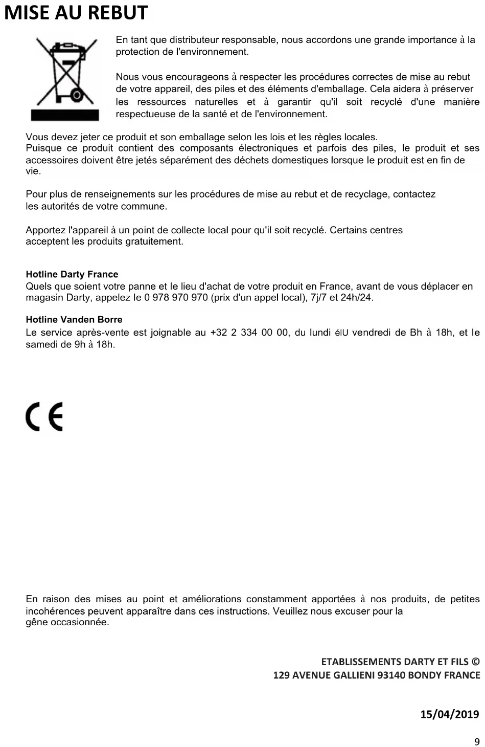 - A (meest efficiënt) tot G (minst efficiënt)8 VERWIJDERING Als verantwoordelijke handelaar dragen we zorg voor het milieu. We moedigen u aan om de juiste verwijderingsprocedure voor uw apparaat en verpakkingsmateriaal te volgen. Dit draagt bij tot het behoud van de natuurlijke rijkdommen door deze te recyclen zodat zowel de menselijke gezondheid en het milieu worden beschermd. Gooi dit apparaat en de verpakking weg in overeenstemming met de geldende wetgeving en voorschriften. Aangezien dit apparaat elektronische componenten bevat moet het apparaat en toebehoren aan het einde van hun levensduur afzonderlijk van het huisafval worden weggegooid. Neem contact op met uw gemeente voor informatie over afdanking en recycling. Lever het apparaat in bij het inzamelpunt van uw gemeente voor recycling. Bij sommige inzamelpunten kunt u het apparaat gratis inleveren. Hotline Vandenborre De dienst na verkoop is bereikbaar van maandag tot zaterdag op +32 2 334 00 00 Hulplijn Nederland Hiervoor kunt u contact opnemen met het BCC Service Center: 0900 0555 (lokaal tarief), geopend van maandag t/m vrijdag van 9.00 tot 17.00 uur.