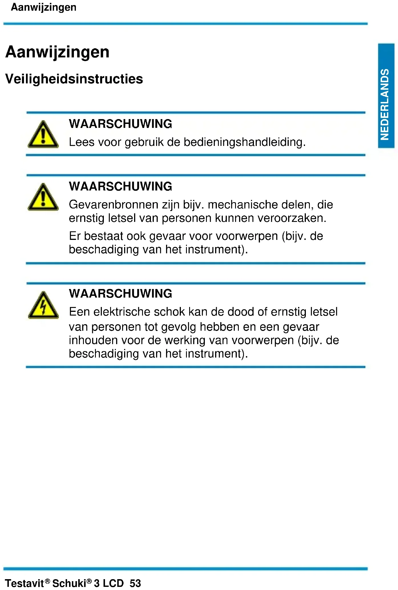 WAARSCHUWING Een elektrische schok kan de dood of ernstig letsel van personen tot gevolg hebben en een gevaar inhouden voor de werking van voorwerpen (bijv. de beschadiging van het instrument).Aanwijzingen 54 Testavit