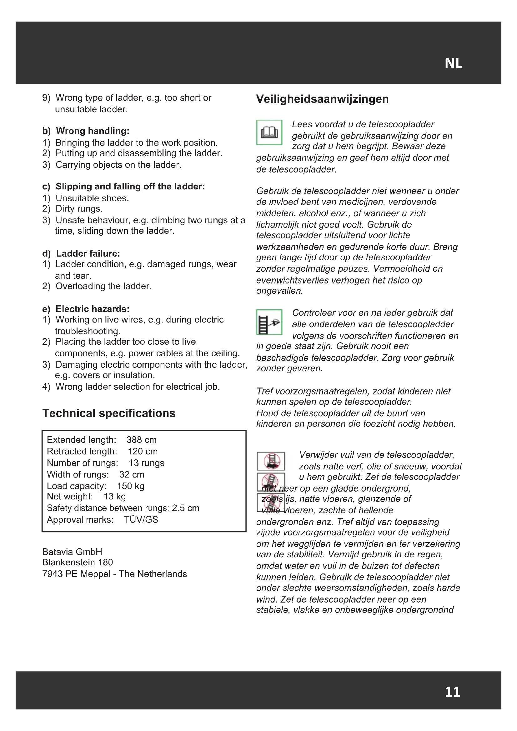 Approval marks: TÜV/GS Batavia GmbH Blankenstein 180 7943 PE Meppel - The Netherlands Veiligheidsaanwijzingen Lees voordat u de telescoopladder gebruikt de gebruiksaanwijzing door en zorg dat u hem begrijpt. Bewaar deze gebruiksaanwijzing en geef hem altijd door met de telescoopladder. Gebruik de telescoopladder niet wanneer u onder de invloed bent van medicijnen, verdovende middelen, alcohol enz., of wanneer u zich lichamelijk niet goed voelt. Gebruik de telescoopladder uitsluitend voor lichte werkzaamheden en gedurende korte duur. Breng geen lange tijd door op de telescoopladder zonder regelmatige pauzes. Vermoeidheid en evenwichtsverlies verhogen het risico op ongevallen. Controleer voor en na ieder gebruik dat alle onderdelen van de telescoopladder volgens de voorschriften functioneren en in goede staat zijn. Gebruik nooit een beschadigde telescoopladder. Zorg voor gebruik zonder gevaren. Tref voorzorgsmaatregelen, zodat kinderen niet kunnen spelen op de telescoopladder. Houd de telescoopladder uit de buurt van kinderen en personen die toezicht nodig hebben. Verwijder vuil van de telescoopladder, zoals natte verf, olie of sneeuw, voordat u hem gebruikt. Zet de telescoopladder niet neer op een gladde ondergrond, zoals ijs, natte vloeren, glanzende of vuile vloeren, zachte of hellende ondergronden enz. Tref altijd van toepassing zijnde voorzorgsmaatregelen voor de veiligheid om het wegglijden te vermijden en ter verzekering van de stabiliteit. Vermijd gebruik in de regen, omdat water en vuil in de buizen tot defecten kunnen leiden. Gebruik de telescoopladder niet onder slechte weersomstandigheden, zoals harde wind. Zet de telescoopladder neer op een stabiele, vlakke en onbeweeglijke ondergrondnd12