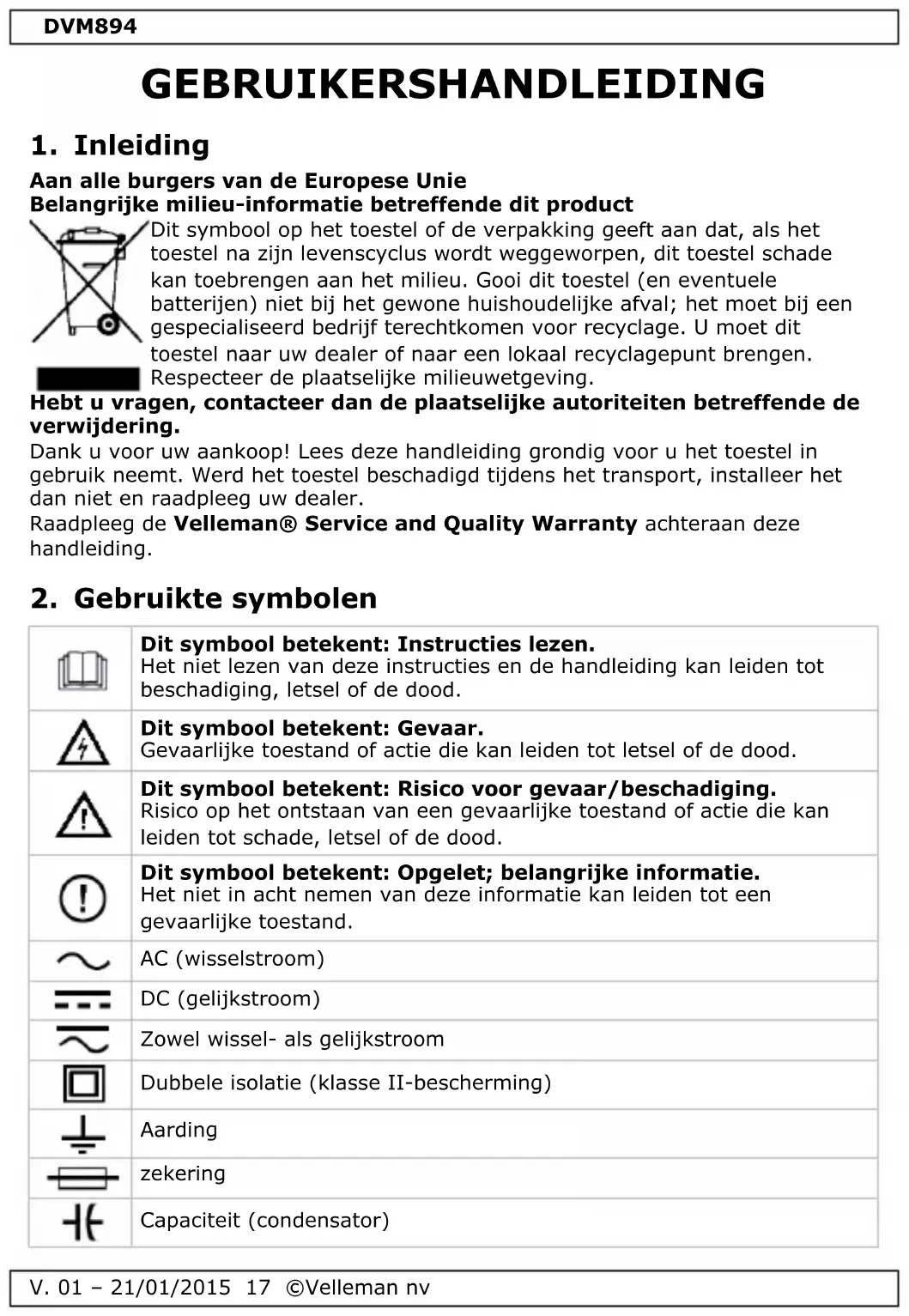 Download de handleiding voor uw Multimeter in PDF-formaat gratis! Vind uw handleiding DVM894 - VELLEMAN en neem uw elektronisch apparaat weer in handen. Op deze pagina staan alle documenten die nodig zijn voor het gebruik van uw apparaat. DVM894 van het merk VELLEMAN.
