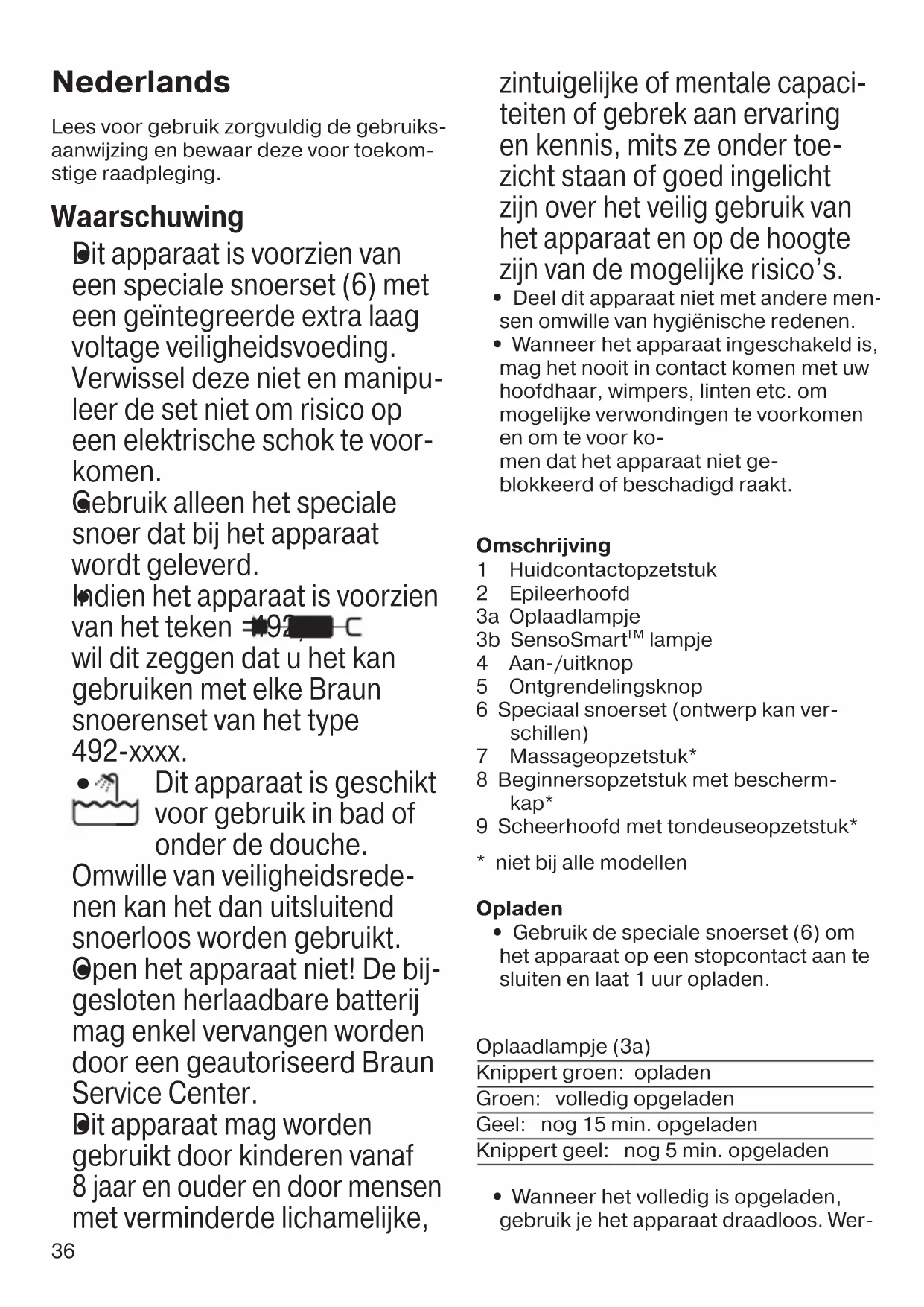 Dit apparaat is geschikt voor gebruik in bad of onder de douche. Omwille van veiligheidsrede- nen kan het dan uitsluitend snoerloos worden gebruikt.
