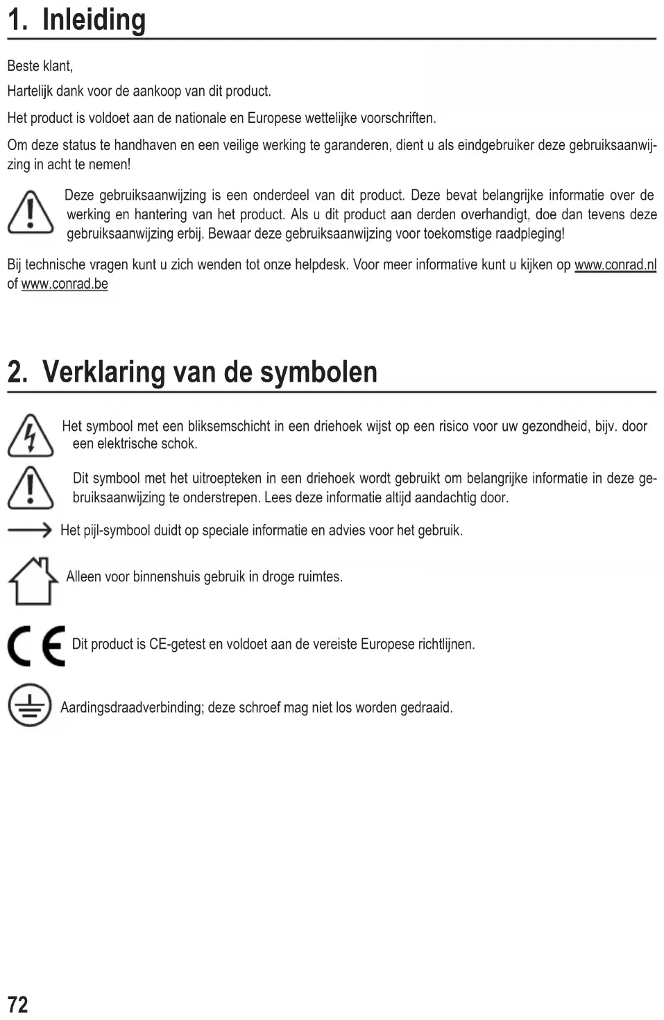 Beste klant, Hartelijk dank voor de aankoop van dit product. Het product is voldoet aan de nationale en Europese wettelijke voorschriften. Om deze status te handhaven en een veilige werking te garanderen, dient u als eindgebruiker deze gebruiksaanwij- zing in acht te nemen! Deze gebruiksaanwijzing is een onderdeel van dit product. Deze bevat belangrijke informatie over de werking en hantering van het product. Als u dit product aan derden overhandigt, doe dan tevens deze gebruiksaanwijzing erbij. Bewaar deze gebruiksaanwijzing voor toekomstige raadpleging! Bij technische vragen kunt u zich wenden tot onze helpdesk. Voor meer informative kunt u kijken op www.conrad.nl of www.conrad.be